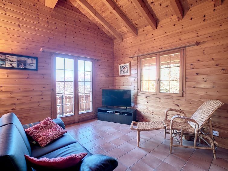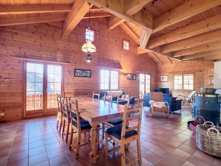 "Les 4 Saisons", 4-room chalet 180 m2 on 3 levels, south-east facing position. Spacious, comfortable and wooden furniture furnishings: large living/dining room with Scandinavian wood stove and cable TV. Exit to the balcony, to the terrace, south facing position and west facing position.