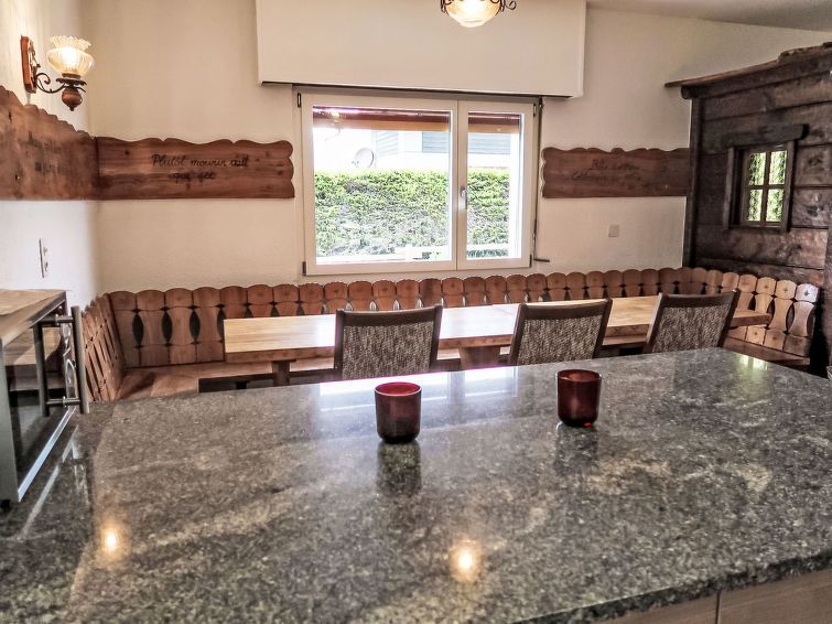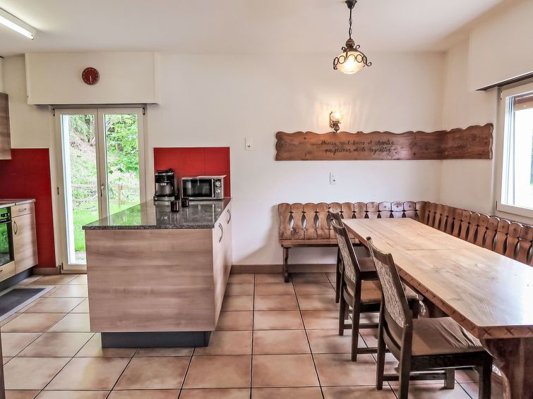 "L'Etape", 5-room chalet on 2 levels. Comfortable and tasteful furnishings: living/dining room with open-hearth fireplace. Exit to the garden. Open kitchen (oven, dishwasher, 4 ceramic glass hob hotplates, microwave, electric coffee machine, Capsules for coffee machine (Saeco), raclette grill, fondue Set (cheese)).