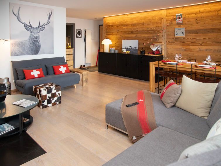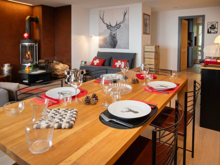 "Soleil des Alpes", 3-room apartment on the upper ground floor, south facing position. Comfortable and modern furnishings: large living/dining room with Scandinavian wood stove and cable TV. Exit to the balcony, to the terrace, south facing position. 1 large room with 1 double bed (1 x 180 cm, length 200 cm), cable TV.