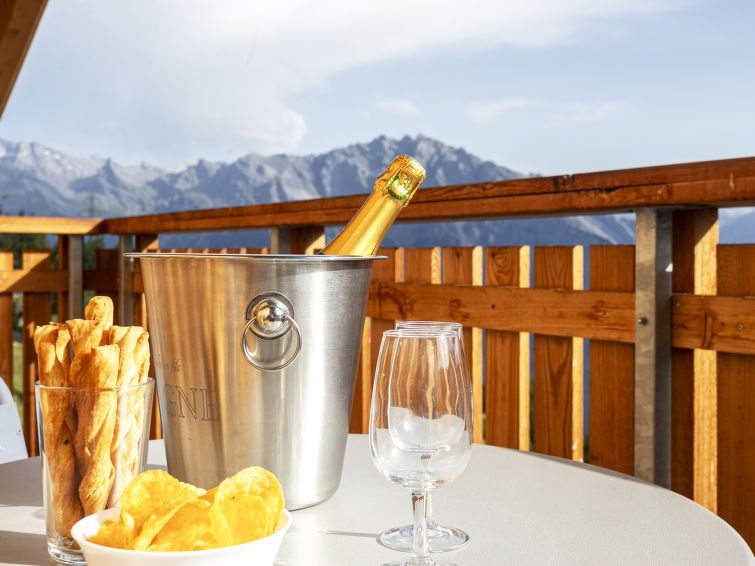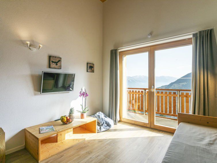 "T-Resort La Tzoumaz 2p4 vue vallée", 2-room apartment 35 m2. Bright, comfortable and modern furnishings: living/dining room with 1 pull-out bed (2 x 80 cm, length 200 cm), digital TV, international TV channels and flat screen. Exit to the balcony, to the terrace. 1 room with 1 double bed (2 x 80 cm, length 200 cm).