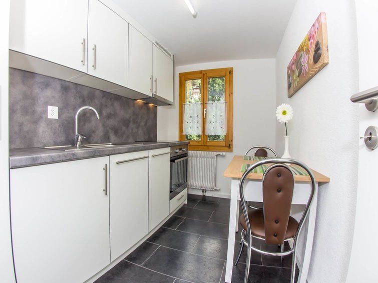 "Bergfink Obergeschoss", 1-room studio 27 m2 on 2nd floor. Renovated in 2013, beautiful and cosy furnishings: living/sleeping room with 2 fold-away beds and satellite TV (flat screen). Exit to the balcony, south facing position. Kitchen (oven, 4 ceramic glass hob hotplates, electric coffee machine) with small dining table.