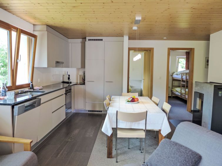 "Chalet Gredetsch 6B", 4-room apartment 70 m2, on the ground floor. Spacious and bright, modern and cosy furnishings: open living/dining room with Scandinavian wood stove, cable TV and flat screen. Exit to the terrace. 1 room with 1 double bed (2 x 80 cm, length 200 cm). 2 children's rooms, each room with 1 x 2 bunk beds (90 cm, length 200 cm).