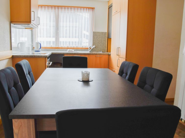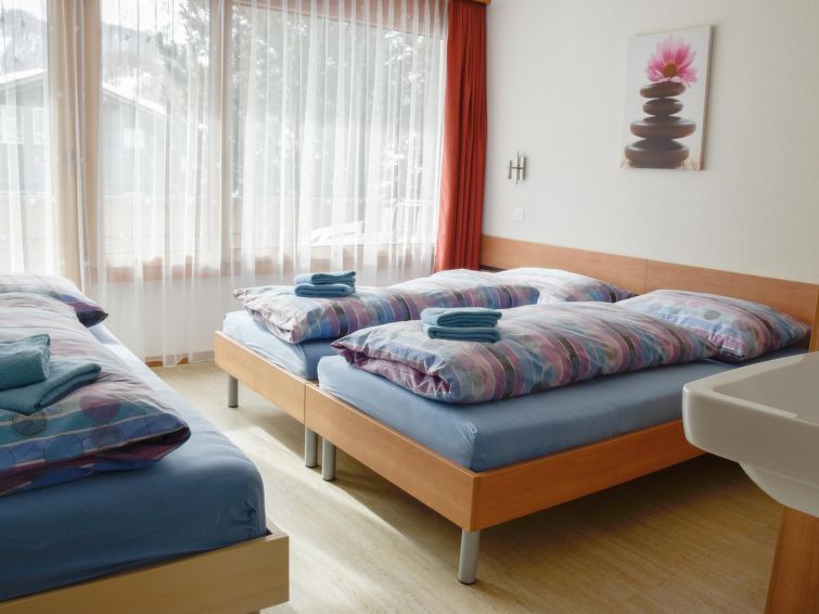3-room apartment: 1 double room with washbasin, 1 sleeping room with 3 beds with washbasin, bath/WC, kitchen with refrigerator, oven, dish-washer, coffe maker and a living room with divan, TV, central heating, south balcony, ski room.