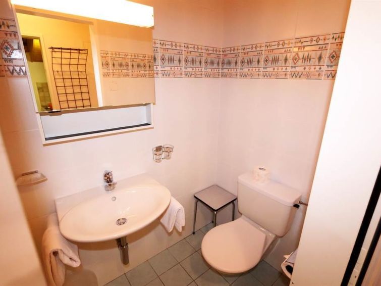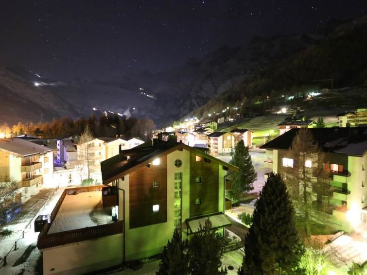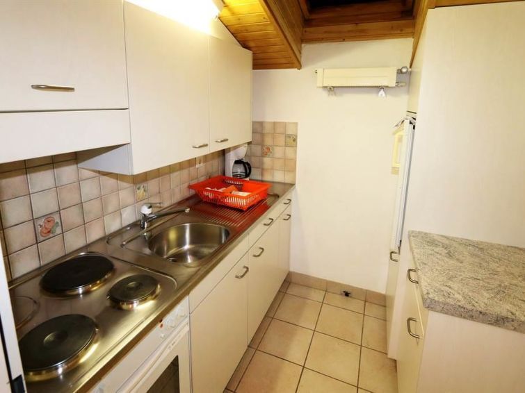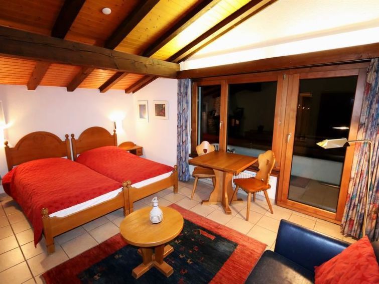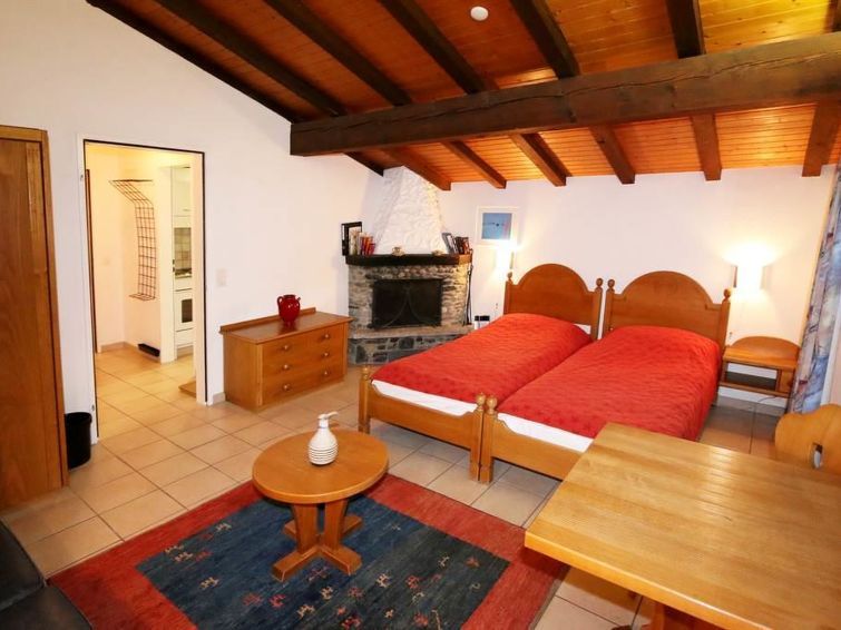 Studio located in quiet and sunny area, consisting of  1 bed-sitting room with 2 beds and cosy fireplace, kitchen, 1 shower/WC and south-facing balcony with amazing mountain view.