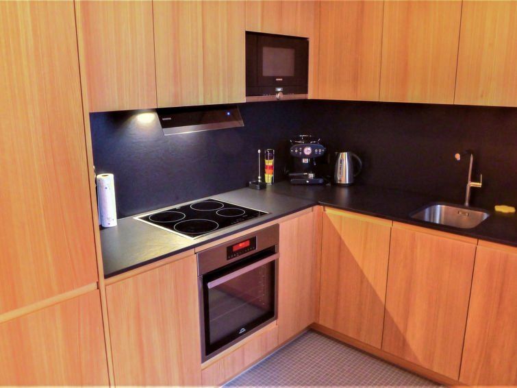 2-room apartment 70 m2 on 2nd floor, south facing position. Spacious, fully renovated in 2022, beautiful and modern furnishings: living room with dining table, TV and hi-fi system. Walk-through room with 1 double bed (1 x 160 cm, length 200 cm). Exit to the balcony. Kitchen (oven, dishwasher, 4 induction hot plates, toaster, kettle, freezer, electric coffee machine, raclette grill, combination microwave, fondue Set (cheese)).