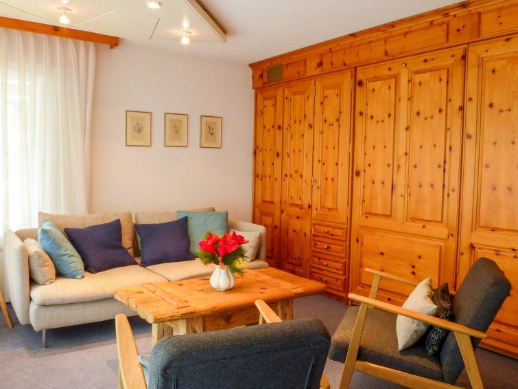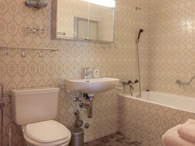 2-room apartment 60 m2, on the ground floor. Bright, simple and comfortable furnishings: living/sleeping room with 2 fold-away beds (90 cm, length 200 cm), dining table and TV. Exit to the balcony. 1 double bedroom with 1 double bed (2 x 90 cm, length 200 cm). Small kitchen (4 hot plates, oven, dishwasher, toaster, kettle, electric coffee machine, raclette grill, fondue Set (chinoise, cheese)).