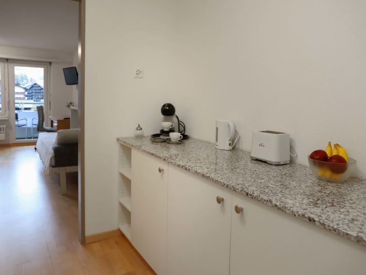 The apartment is very easily accessible; no stairs to get into the building, in the building an elevator. Beautiful view from the room of the village and the Matterhorn. Dining table in front of the window is very pleasant. Wide balcony. Decor somewhat dated with electric hobs, but everything functions.