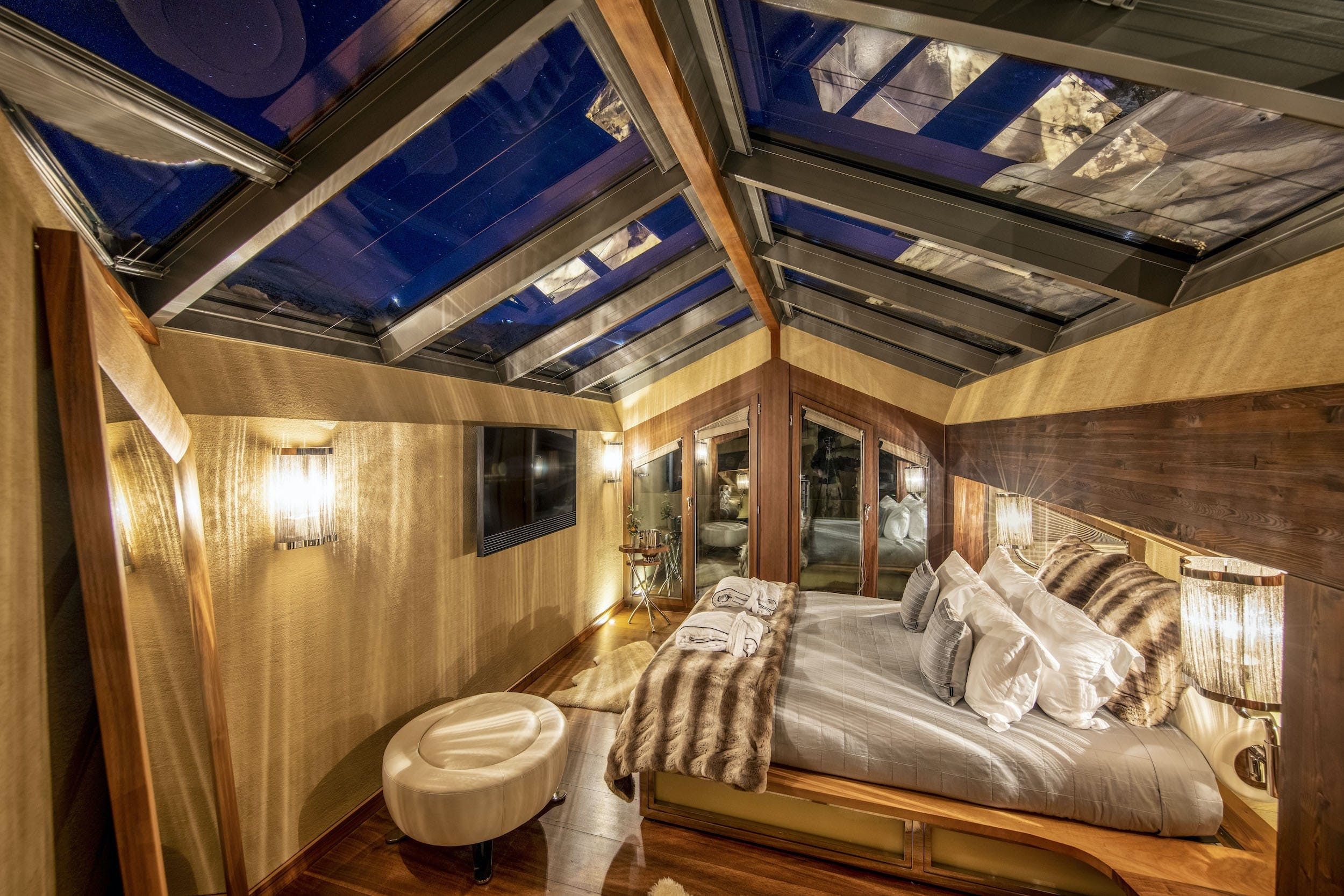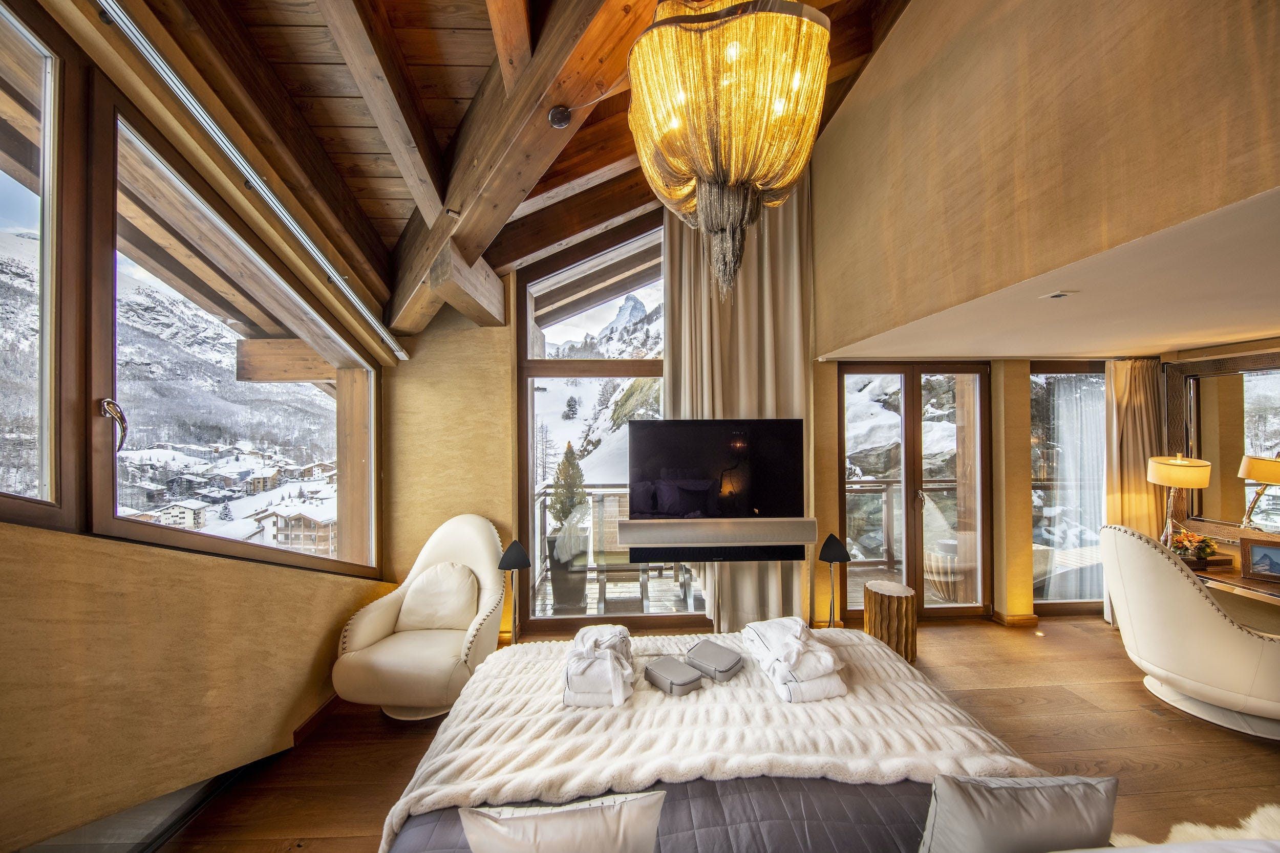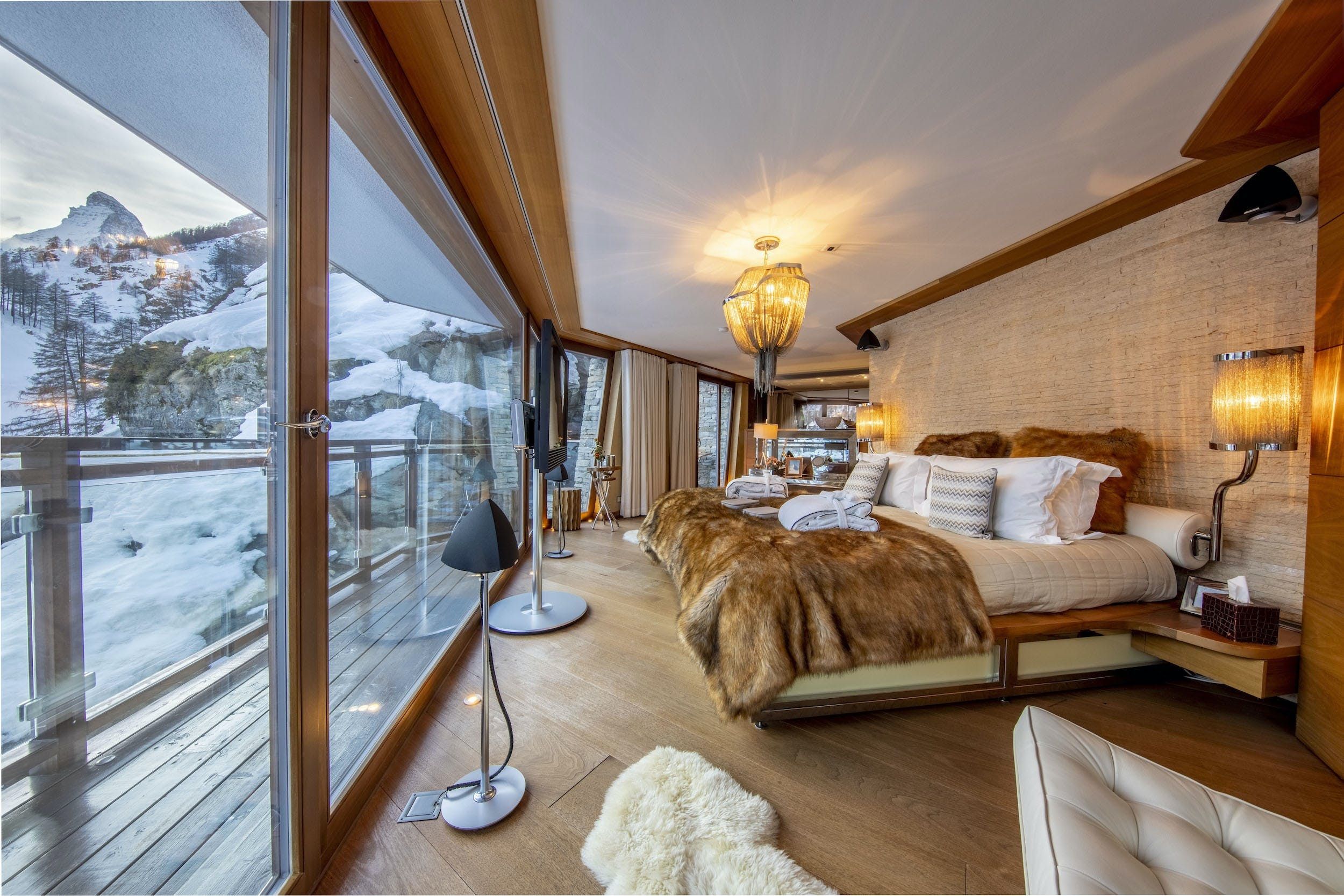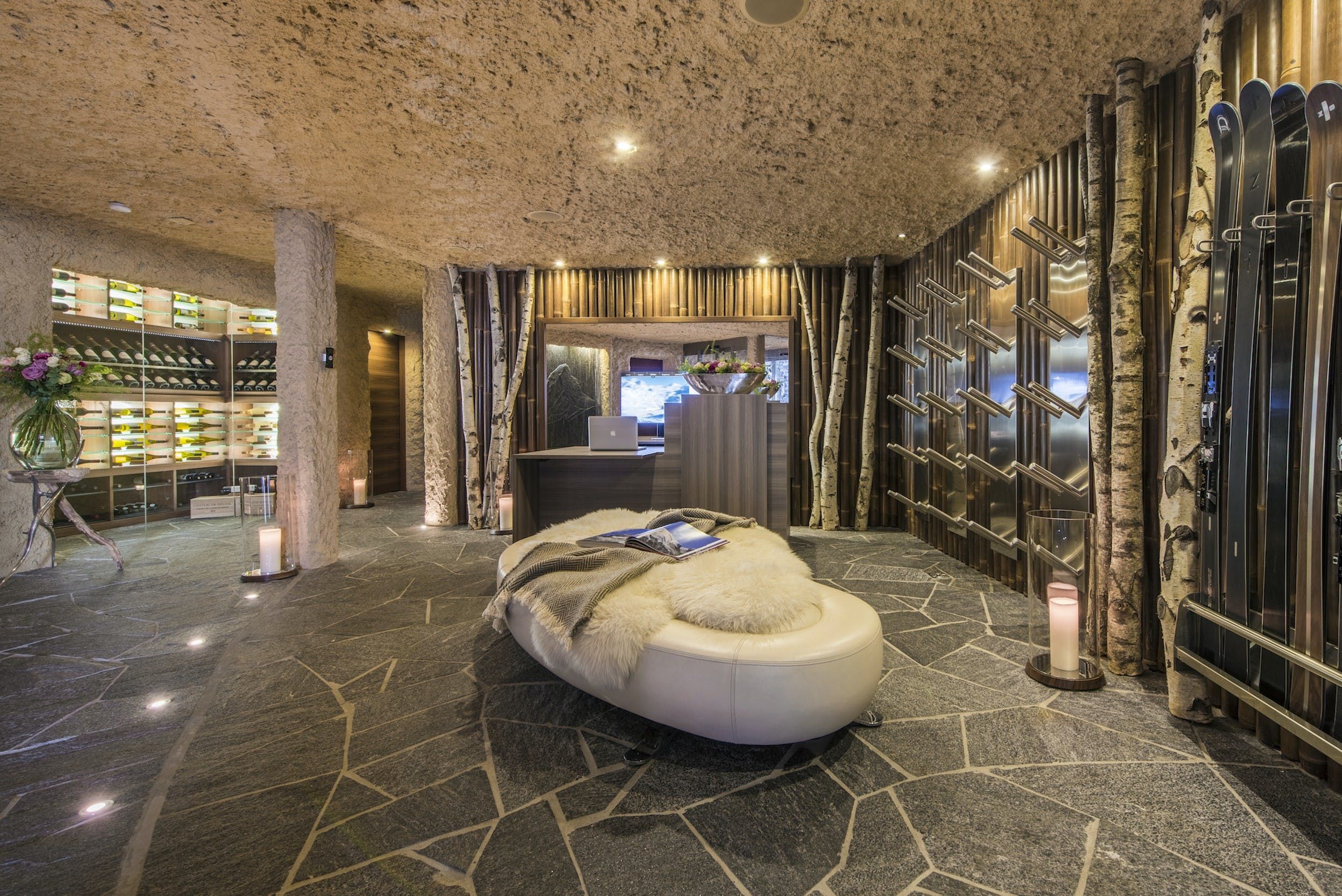 Spa Chalet Zuna is a luxurious six-floor chalet that accommodates up to 10 adults and 3 children. The living spaces are modern with floor-to-ceiling windows, a glass roof, open fireplace, and stunning views of the village and the Matterhorn. The chalet is tastefully furnished with a beautiful art collection, plush seating areas, and a library for relaxing after skiing. Guests can enjoy the large south-facing balcony with three different ski area views. The Wellness Centre offers a private gymnasium, full treatment spa, indoor/outdoor Jacuzzi, bio steam in the hammam, Finnish sauna or Swedish sauna. The chalet features five deluxe double bedroom suites with ESPA® beauty and skincare products, plush designer robes and towels, hairdryer, straighteners, HD cinematic television with digital surround sound and Bluetooth connection. Guests have exclusive use of the entire luxury chalet with personal in-house gourmet chef offering personalized menus for breakfast, afternoon tea, and daily signature dinners 6 out of 7 nights with all food and drinks included. The chalet also includes full-time professional staff including manager, concierge, service staff; champagne reception on arrival; two 30-minute classic massages per day; evening turn-down service; luxury bath and skin products by ESPA®; daily fresh flowers, newspapers and magazines.