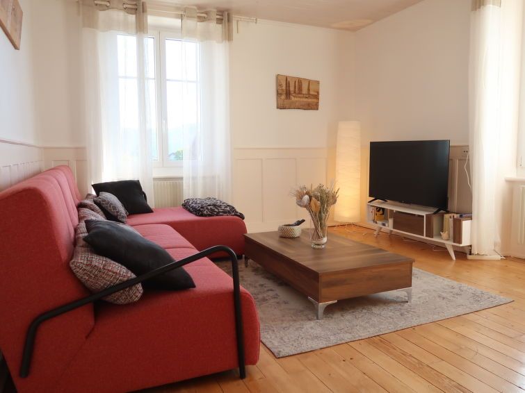 "Grand-Rue 143", 4-room apartment on 2nd floor. Comfortable and tasteful furnishings: living/dining room with TV and gas heating. 1 room with 1 double bed (160 cm, length 200 cm). 1 room with 1 french bed (140 cm, length 200 cm). 1 room with 1 pull-out bed (2 pers. 2 x 90 cm, length 200 cm).