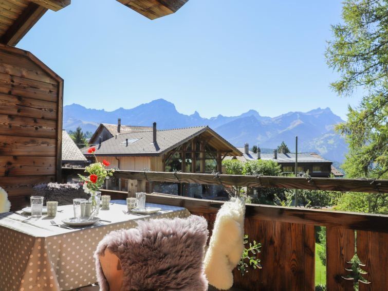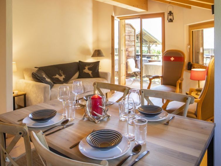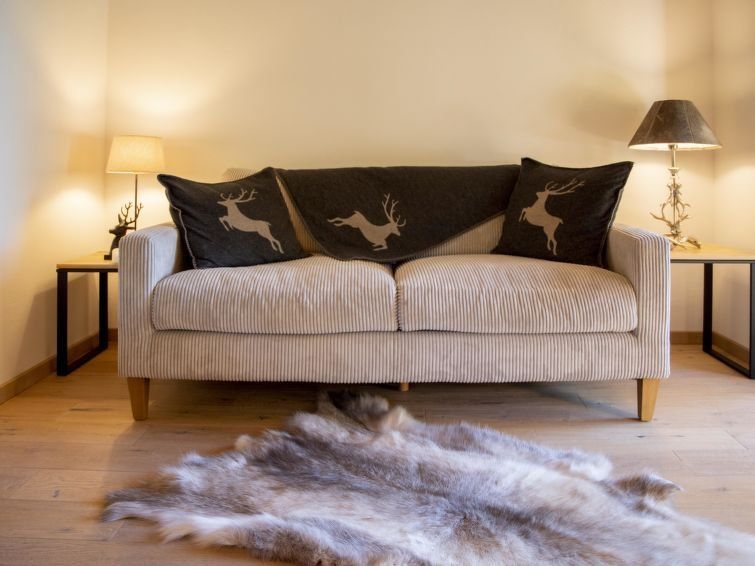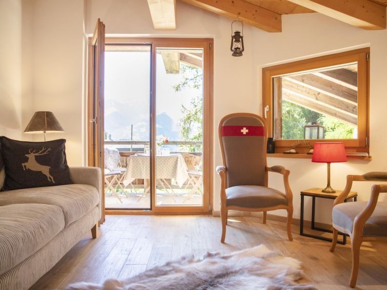 "Chalet Sans Soucis", 4-room apartment 74 m2 on 2 levels on 1st floor, south facing position. Renovated in 2020, comfortable and tasteful furnishings: 1 room with 1 french bed (1 x 160 cm). Exit to the balcony, south facing position. 1 room with 2 beds (90 cm). Bath/WC, hydro massage bath.