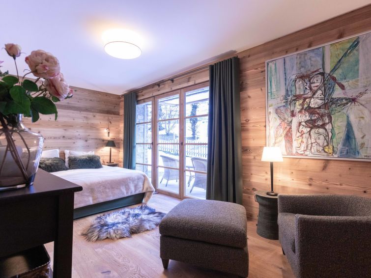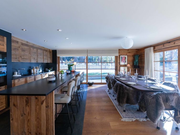 "Domaine du Roc 1 /2", 6-room apartment 280 m2 on 2 levels, on the ground floor, south facing position. Object suitable for 6 adults + 4 children. Spacious, luxurious and tasteful furnishings: large living/dining room with open-hearth fireplace, dining table, hydro massage bath and TV (flat screen).