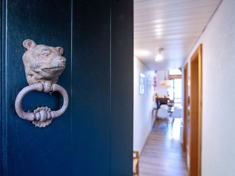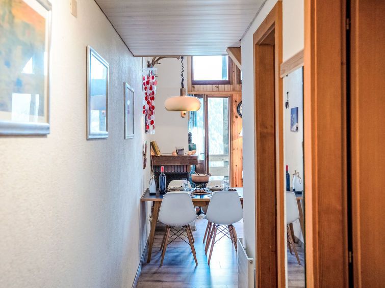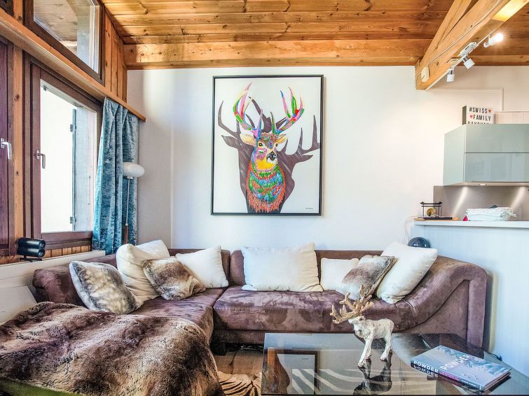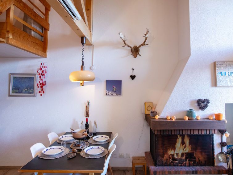 "Les Arsets 308/15", 3-room penthouse 65 m2 on 2 levels, on the ground floor, south facing position. Renovated, practical and beautiful furnishings: living/dining room with open-hearth fireplace and dining table. Exit to the balcony, south facing position. 1 room with 1 french bed (1 x 160 cm).