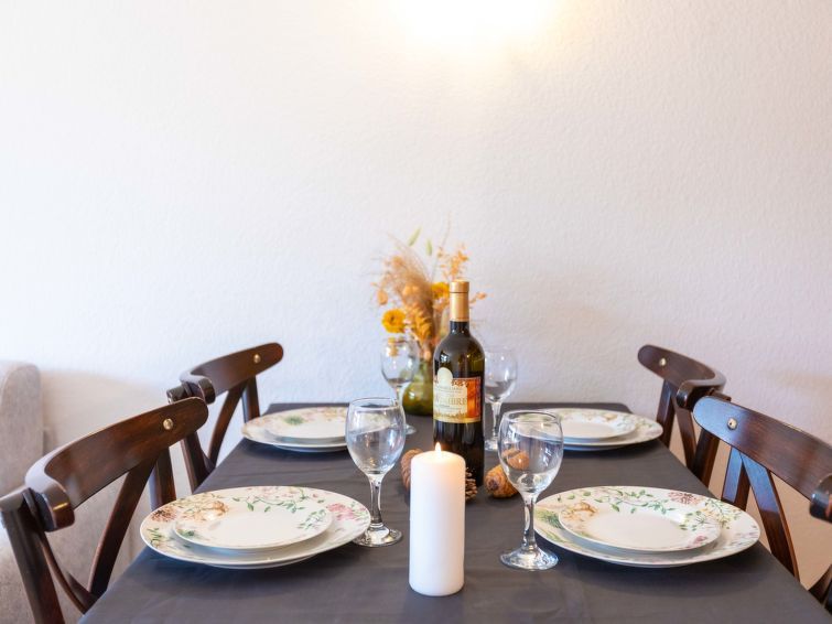 "Les Dryades 6", 2-room apartment 40 m2 on 1st floor, south facing position. Practical and comfortable furnishings: living/dining room with dining table and TV (flat screen). Exit to the balcony, south facing position. 1 room with 1 french bed (1 x 160 cm, length 200 cm). Small kitchen in the entrance (oven, 4 ceramic glass hob hotplates, toaster, kettle, electric coffee machine, Capsules for coffee machine (Nespresso) extra, raclette grill, fondue Set (chinoise, cheese)).