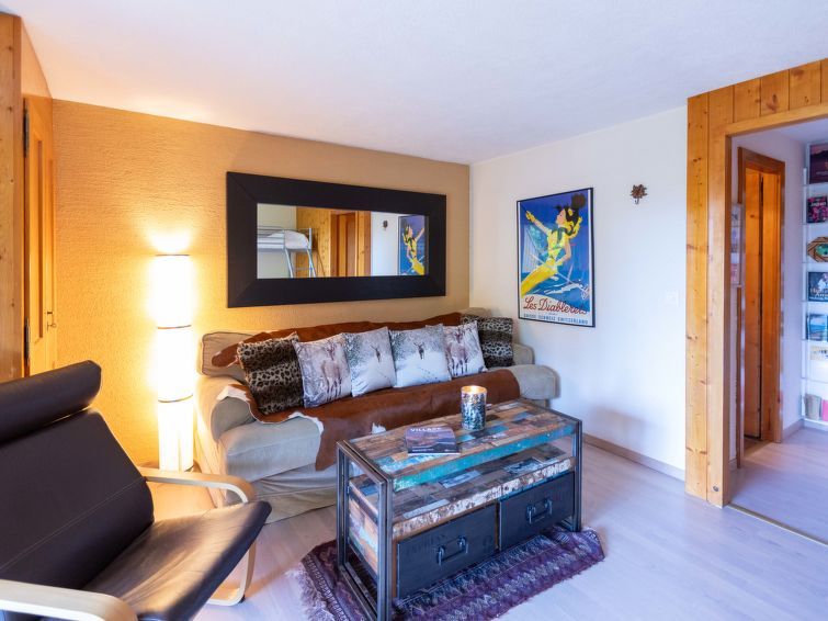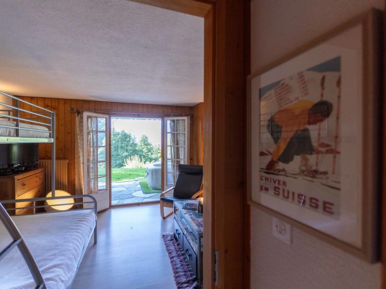 "Les Hespérides 2", 3-room apartment 85 m2 on 2 levels, on the ground floor, south-west facing position. Comfortable and tasteful furnishings: living/dining room with open-hearth fireplace, dining table and TV (flat screen), DVD. Exit to the balcony, south facing position and west facing position.