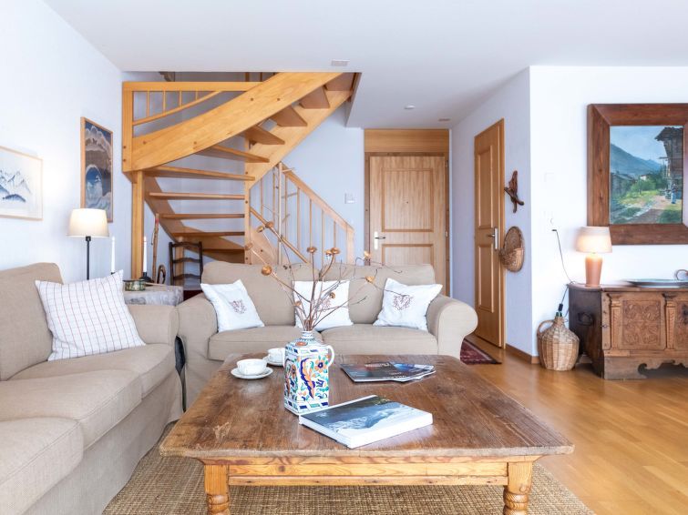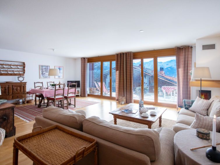 "Matin Calme A2", 3-room apartment 99 m2 on 2 levels, on the ground floor, south-west facing position. Practical and comfortable furnishings: living/dining room with open-hearth fireplace, dining table and TV (flat screen). Exit to the garden, south facing position and south-west facing position.