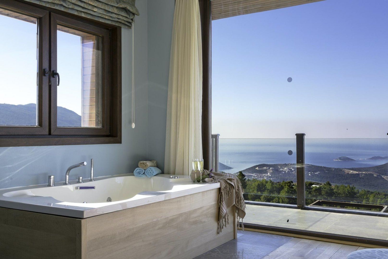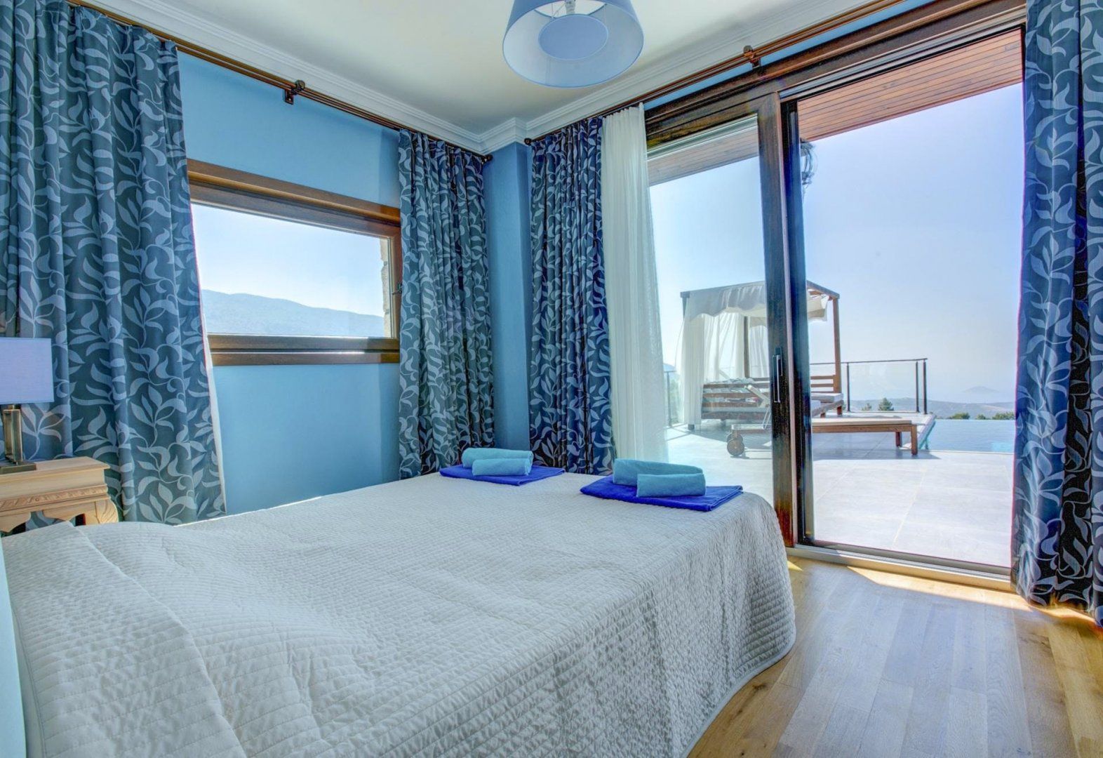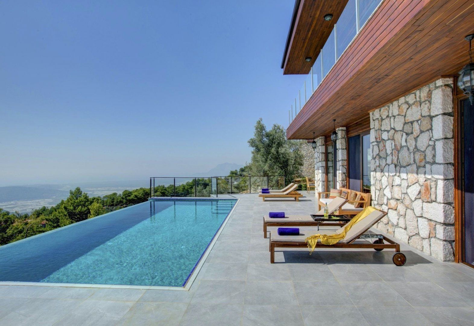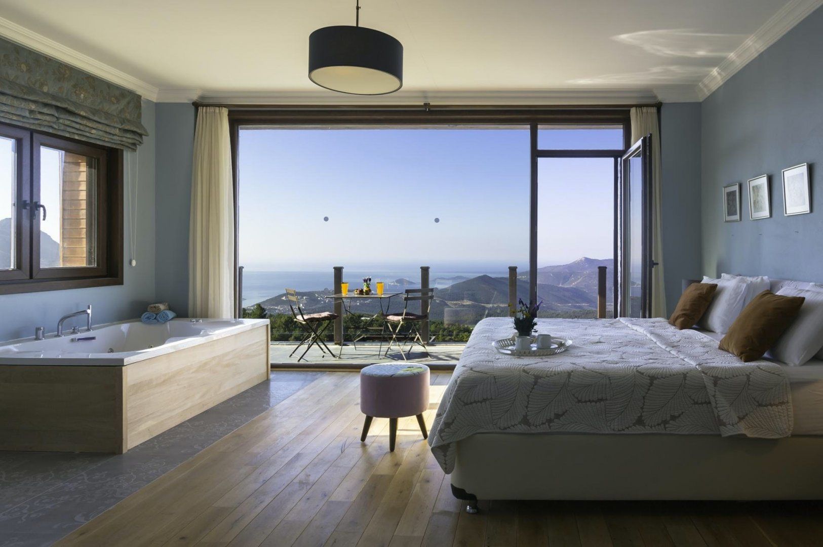 We love how the floor-to-ceiling windows highlight the breathtaking views from every spot of the home, even the bathtub. Patterned rugs and mosaic tiling give this villa its traditional Turkish design. But the infinity-edge plunge pool, a built-in barbecue, and several seating areas make outdoor living the top priority here. While there are a few restaurants and a mini-market within a twenty-minute walk, the private parking makes the downhill drive to Kalkan easy and puts beach days only fifteen minutes away.