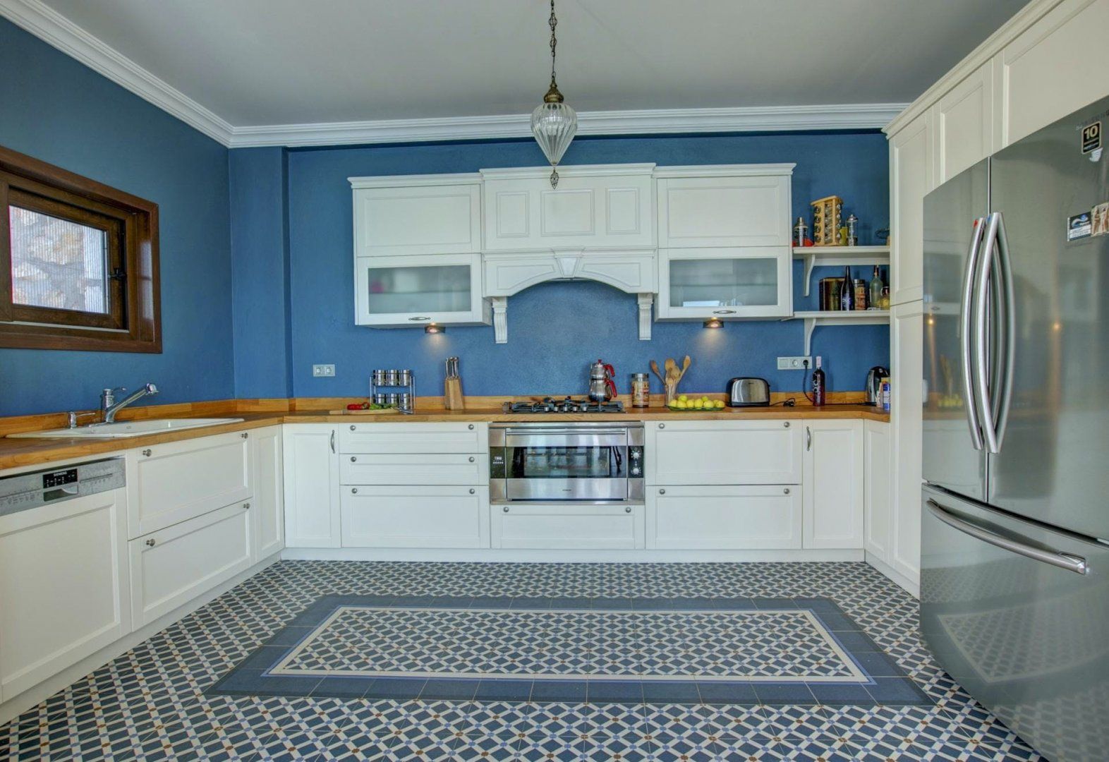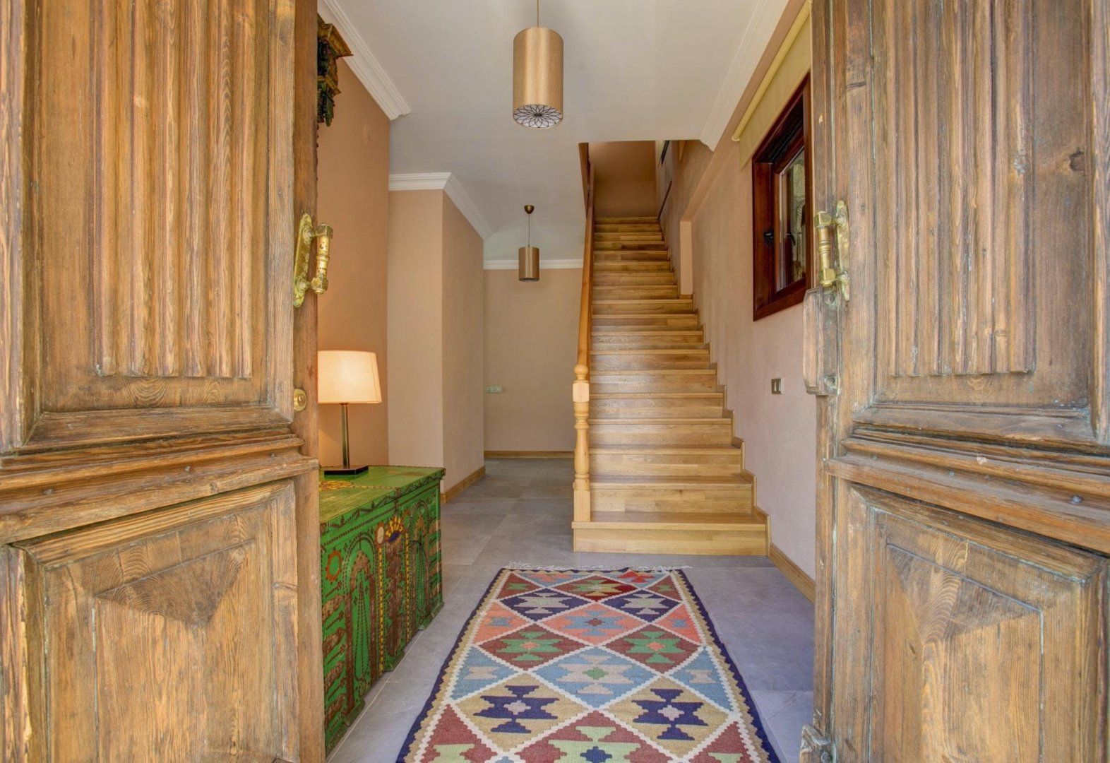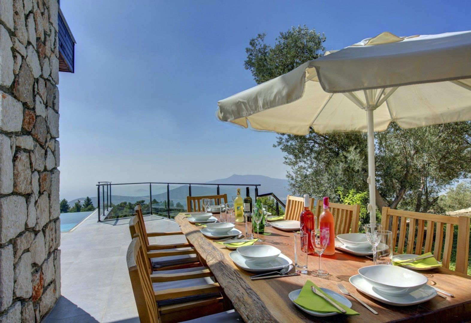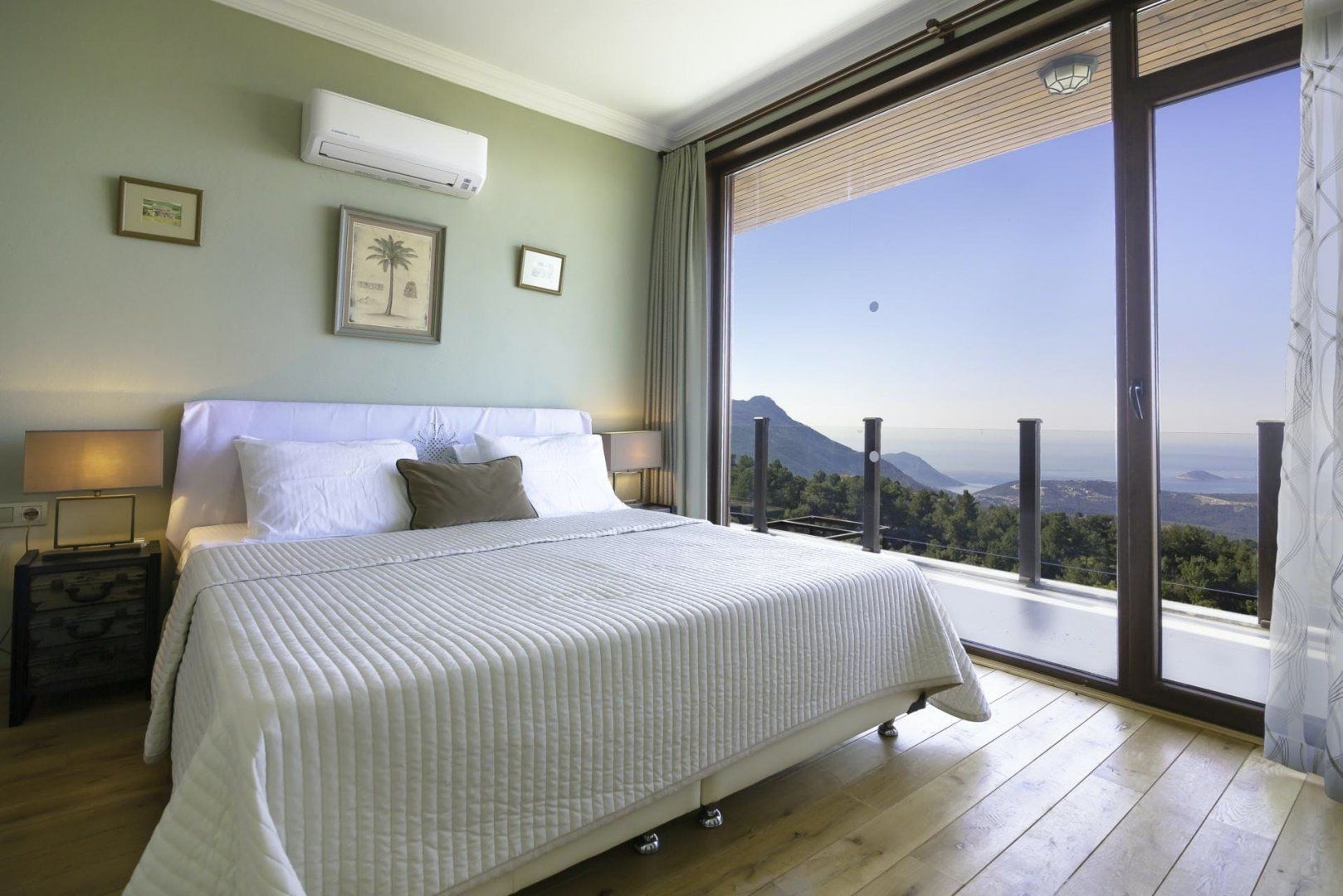 We love how the floor-to-ceiling windows highlight the breathtaking views from every spot of the home, even the bathtub. Patterned rugs and mosaic tiling give this villa its traditional Turkish design. But the infinity-edge plunge pool, a built-in barbecue, and several seating areas make outdoor living the top priority here. While there are a few restaurants and a mini-market within a twenty-minute walk, the private parking makes the downhill drive to Kalkan easy and puts beach days only fifteen minutes away.