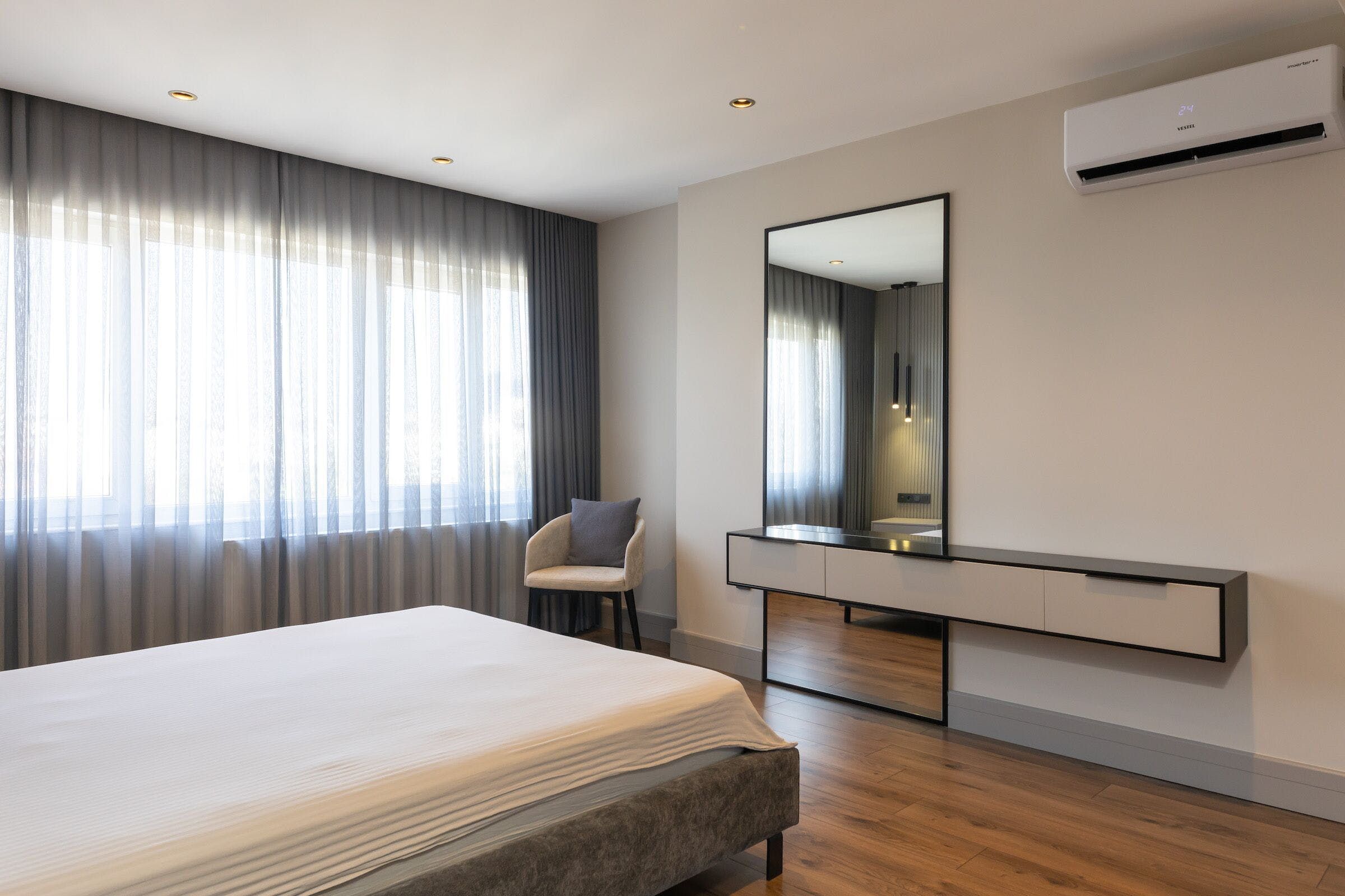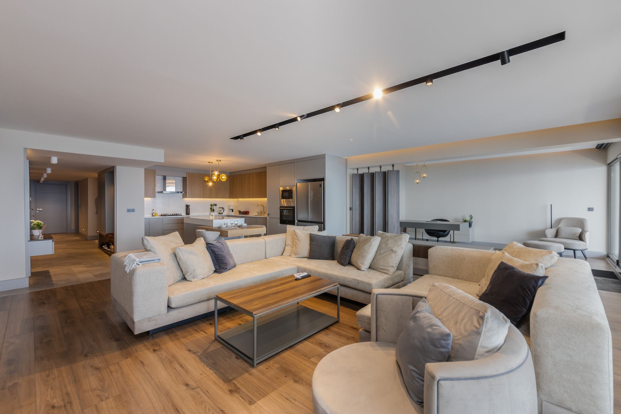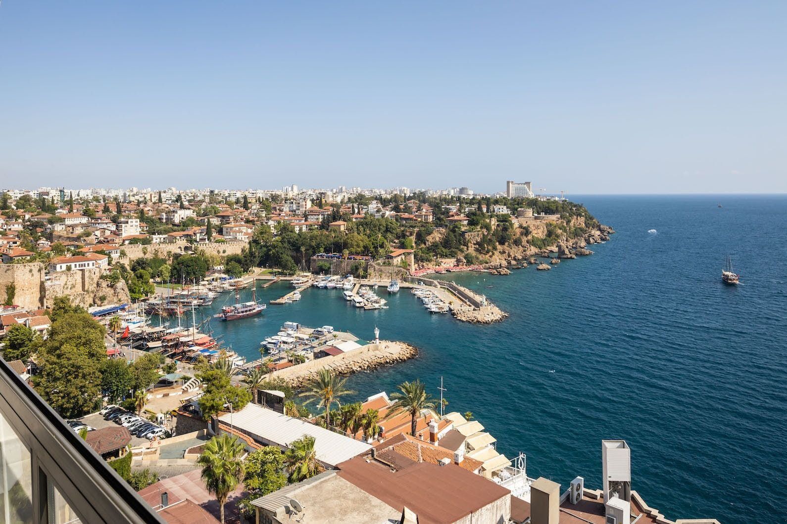 With its commanding position looking out over the Mediterranean and Antalya, you'll feel like a monarch while you're on the balcony of this penthouse home. The open-plan living space makes the home perfect for family reunions or friendly get-togethers, and the floor-to-ceiling windows ensure you can still enjoy the view. Nearby, you'll find local eateries, the harbour, and historical sites, and Mermerli Beach is just a ten-minute walk.