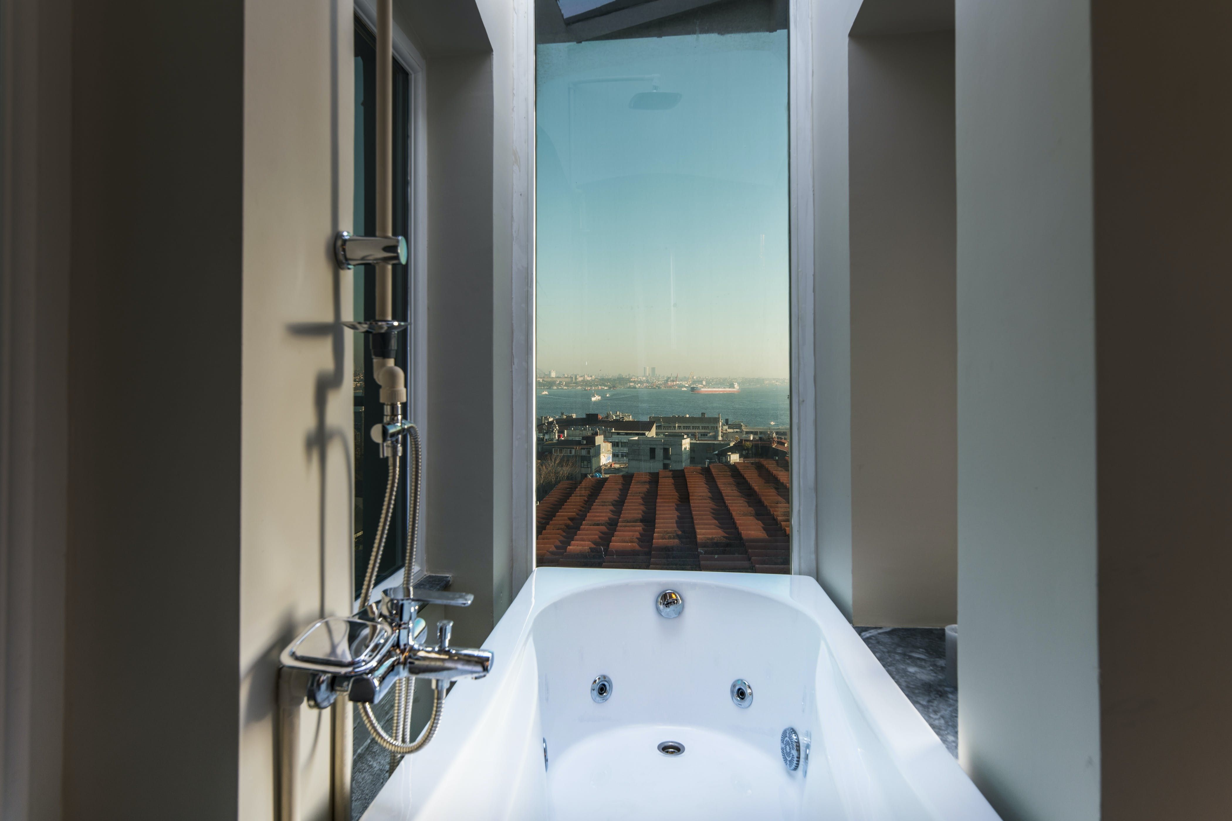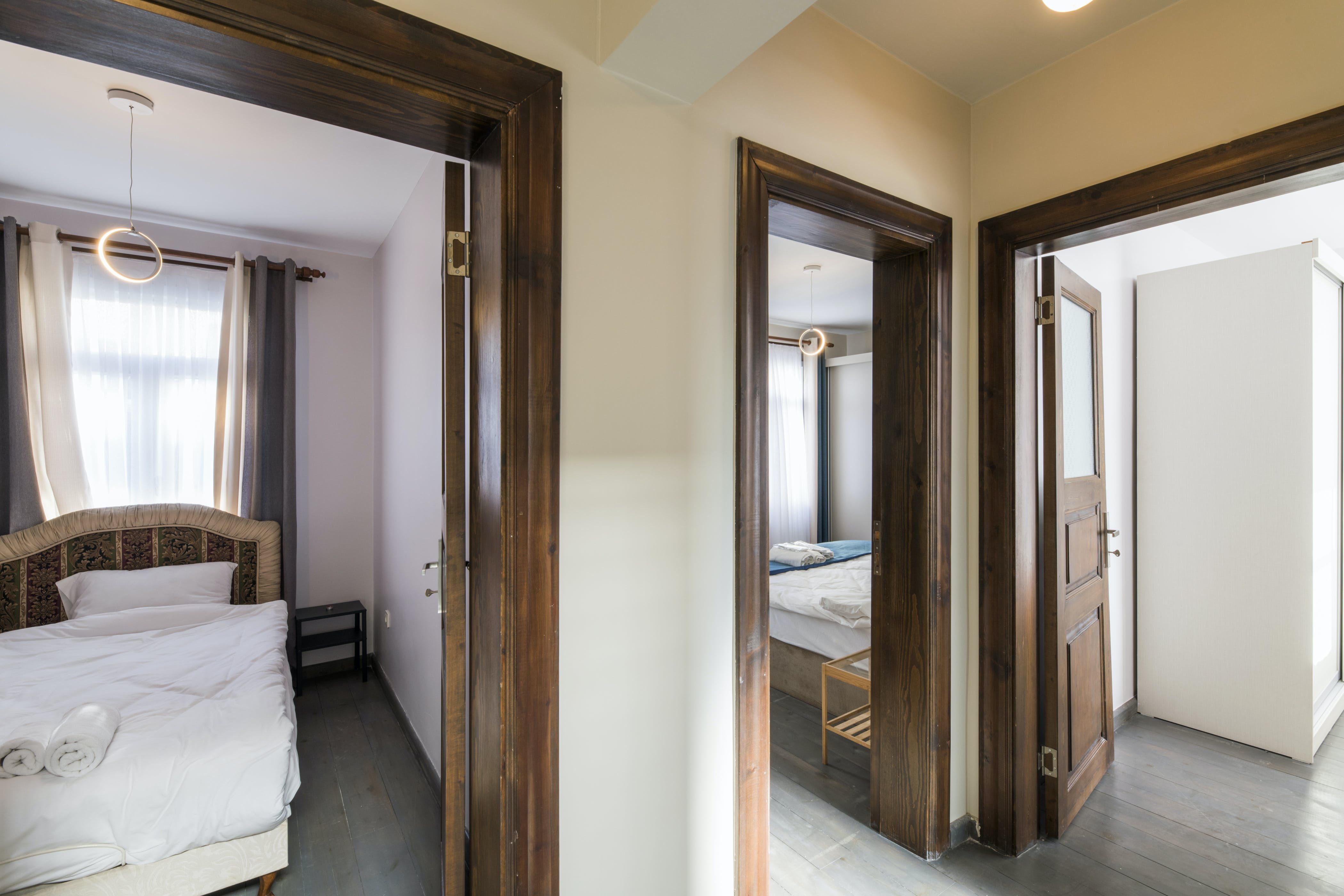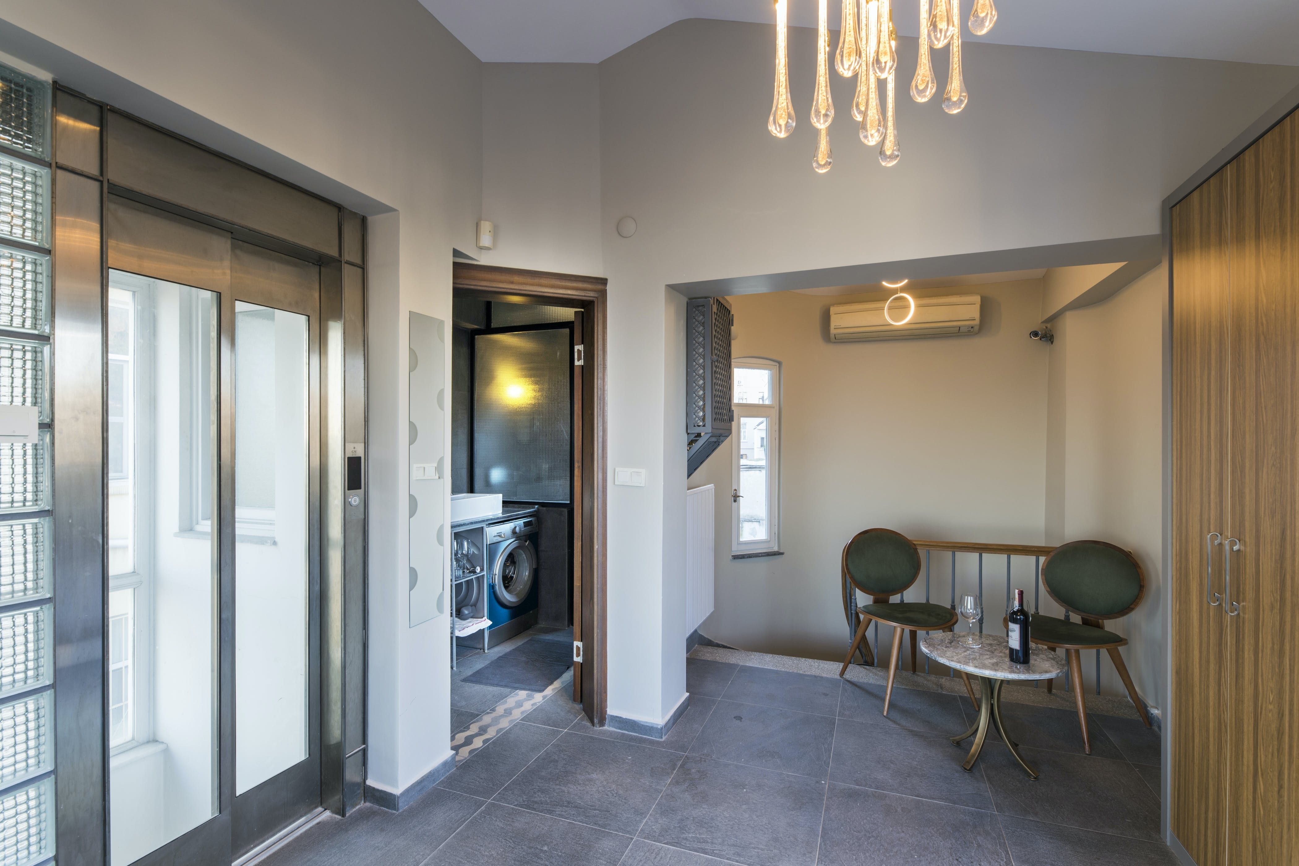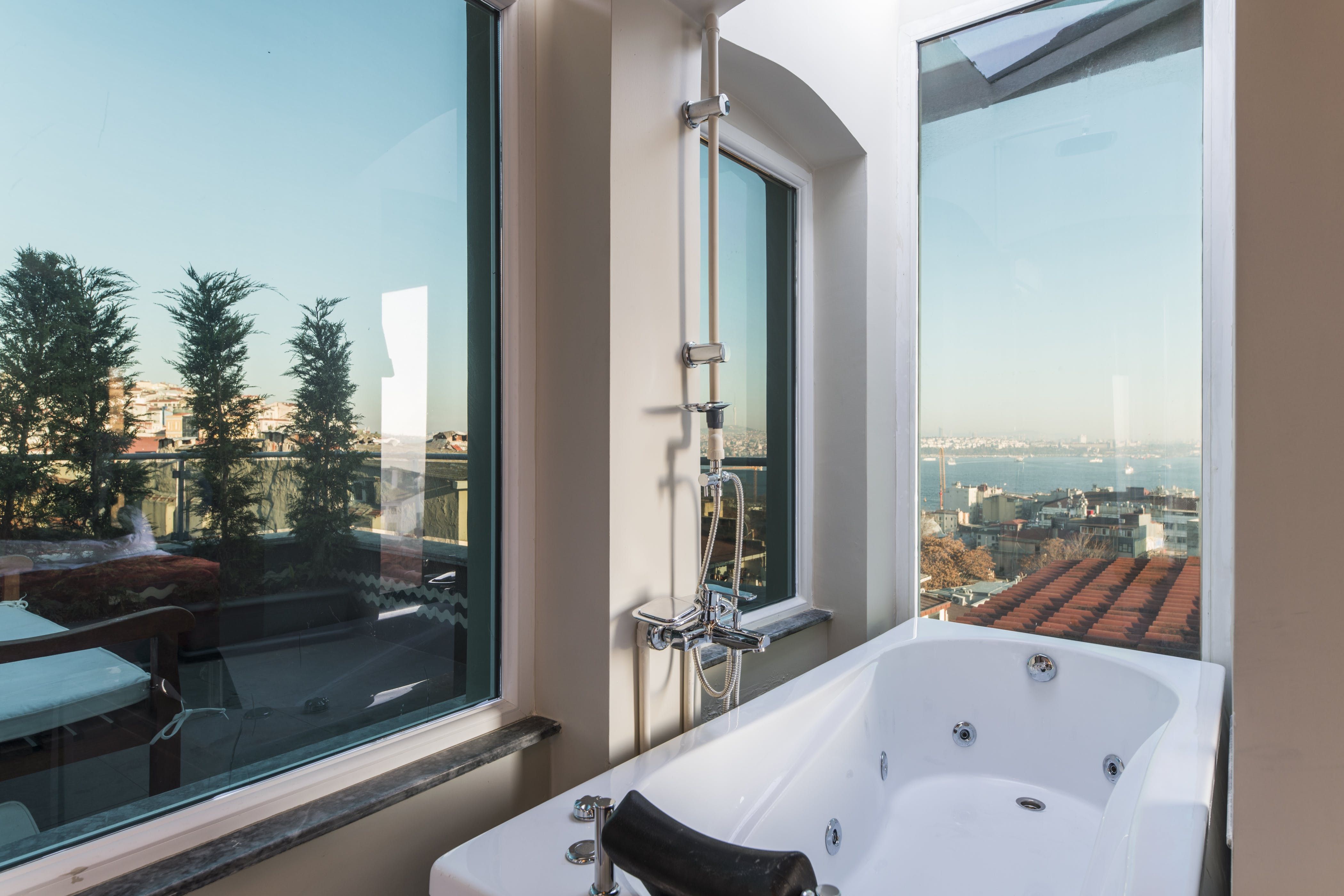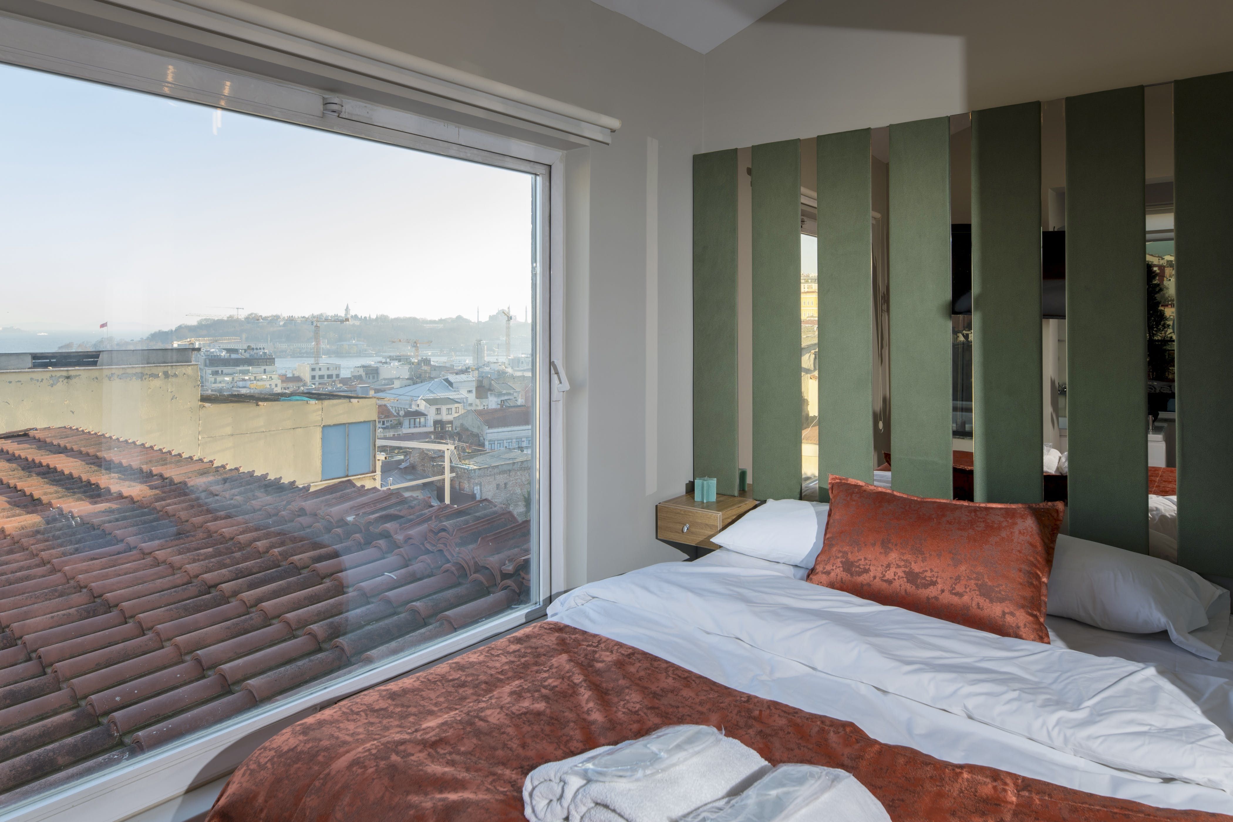 The home itself consists of three apartments with their own kitchens, living rooms and entrances for a little extra privacy. Three rooftop terraces have far-reaching city views over the shambling rooftops of Galata and across the Bosphorus to the iconic Hagia Sofia. There are areas to dine outside, sofas for relaxing with a Turkish tea and a barbecue if you want to add to the lamb-smoke scent of Istanbul’s kebab houses in the area.