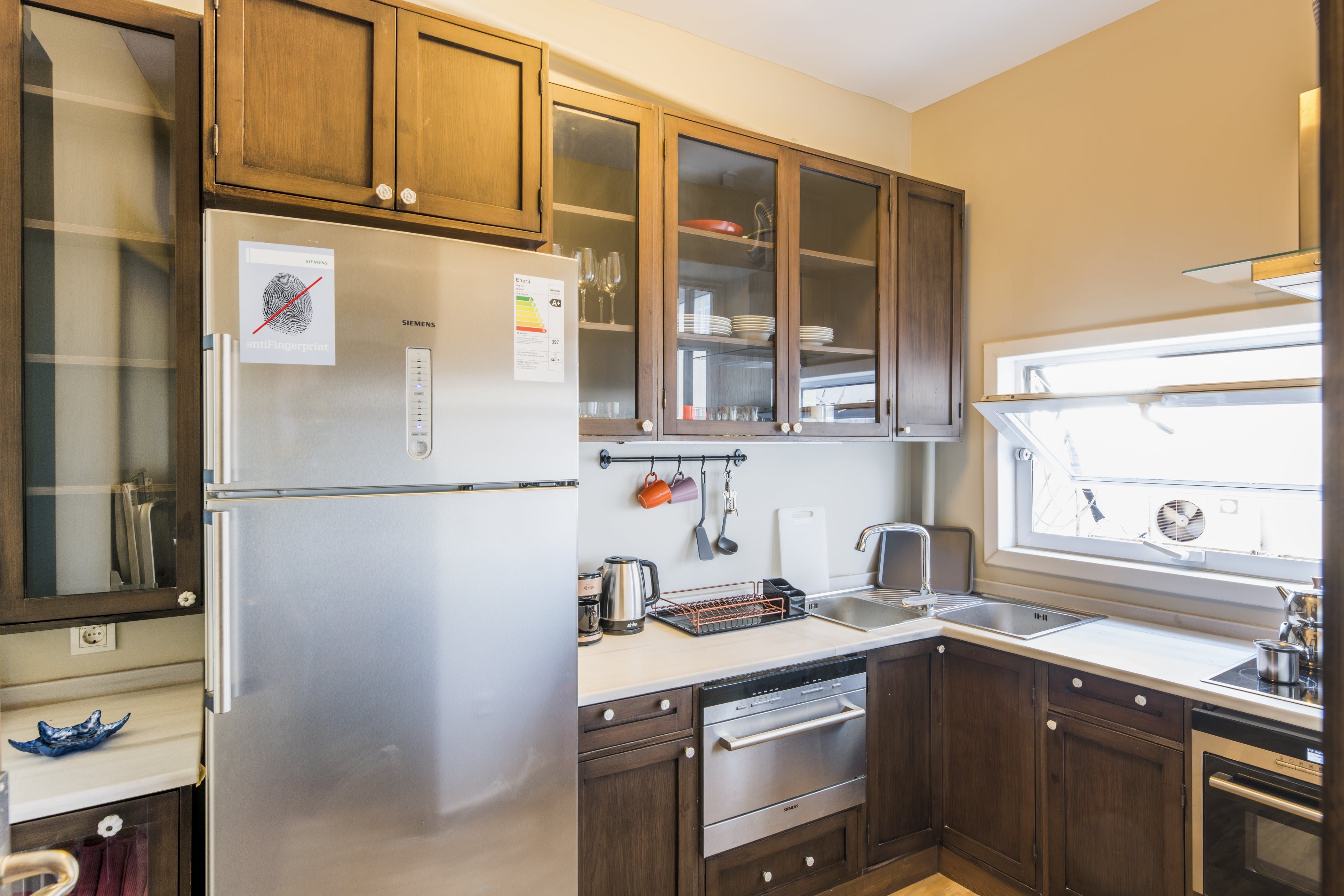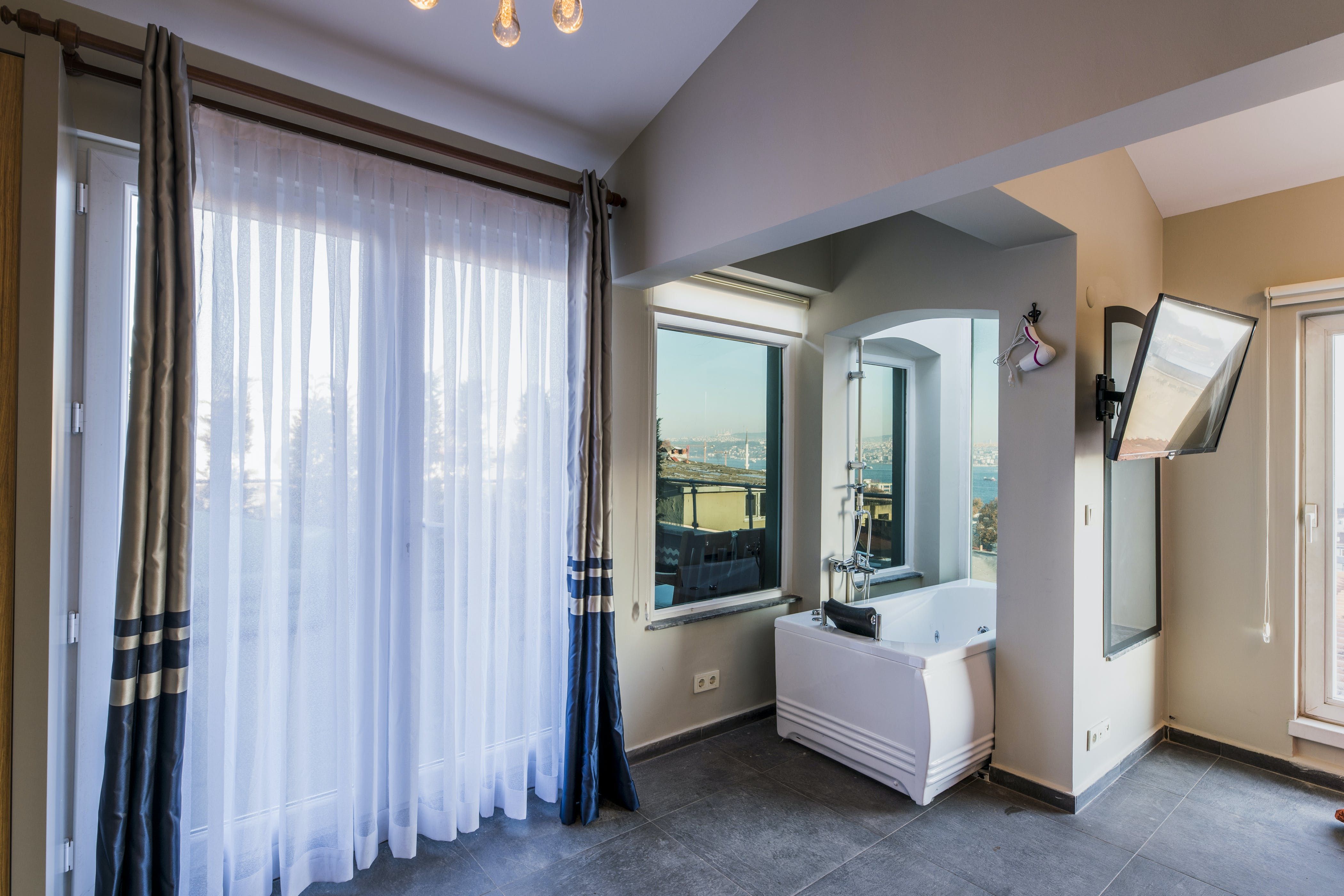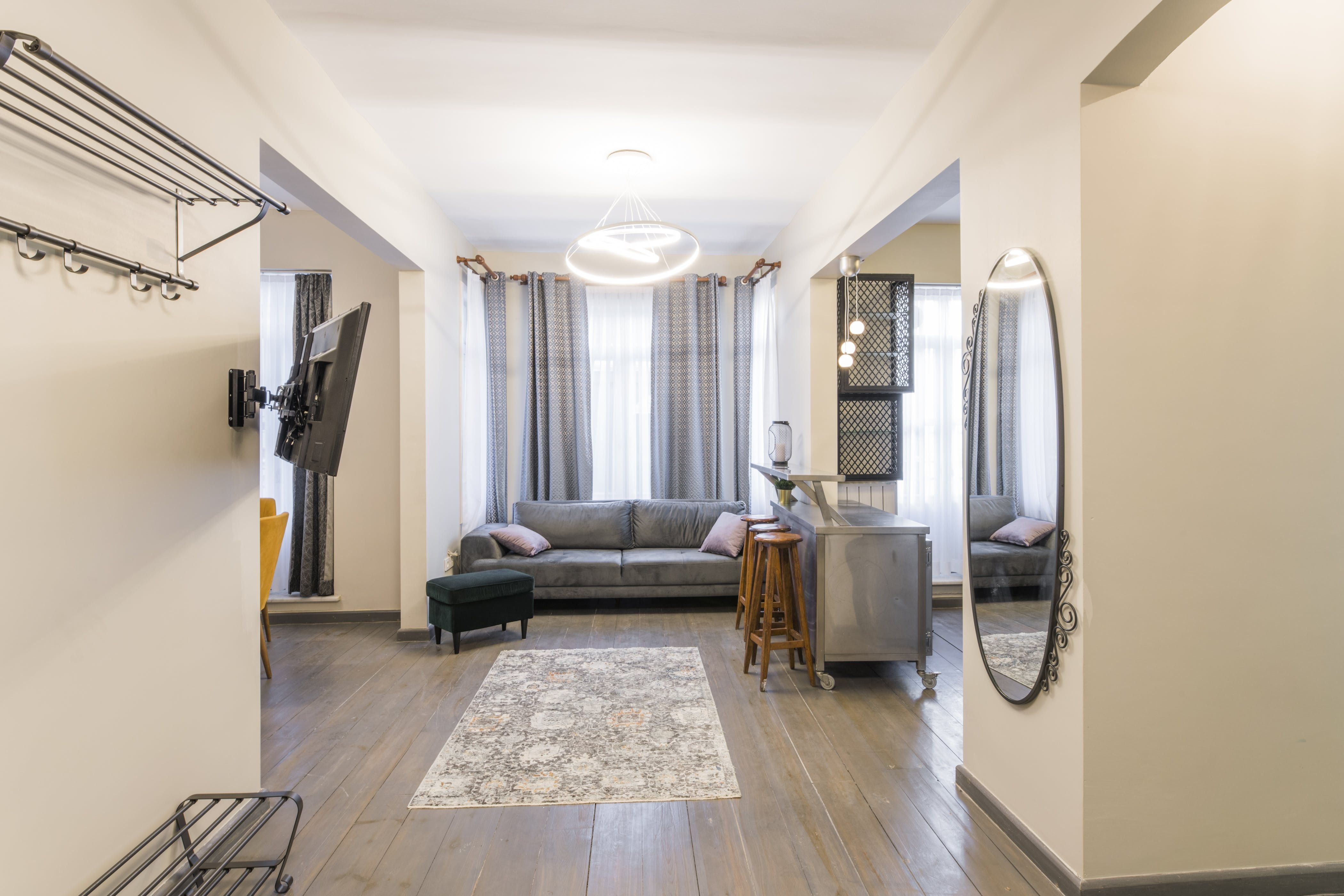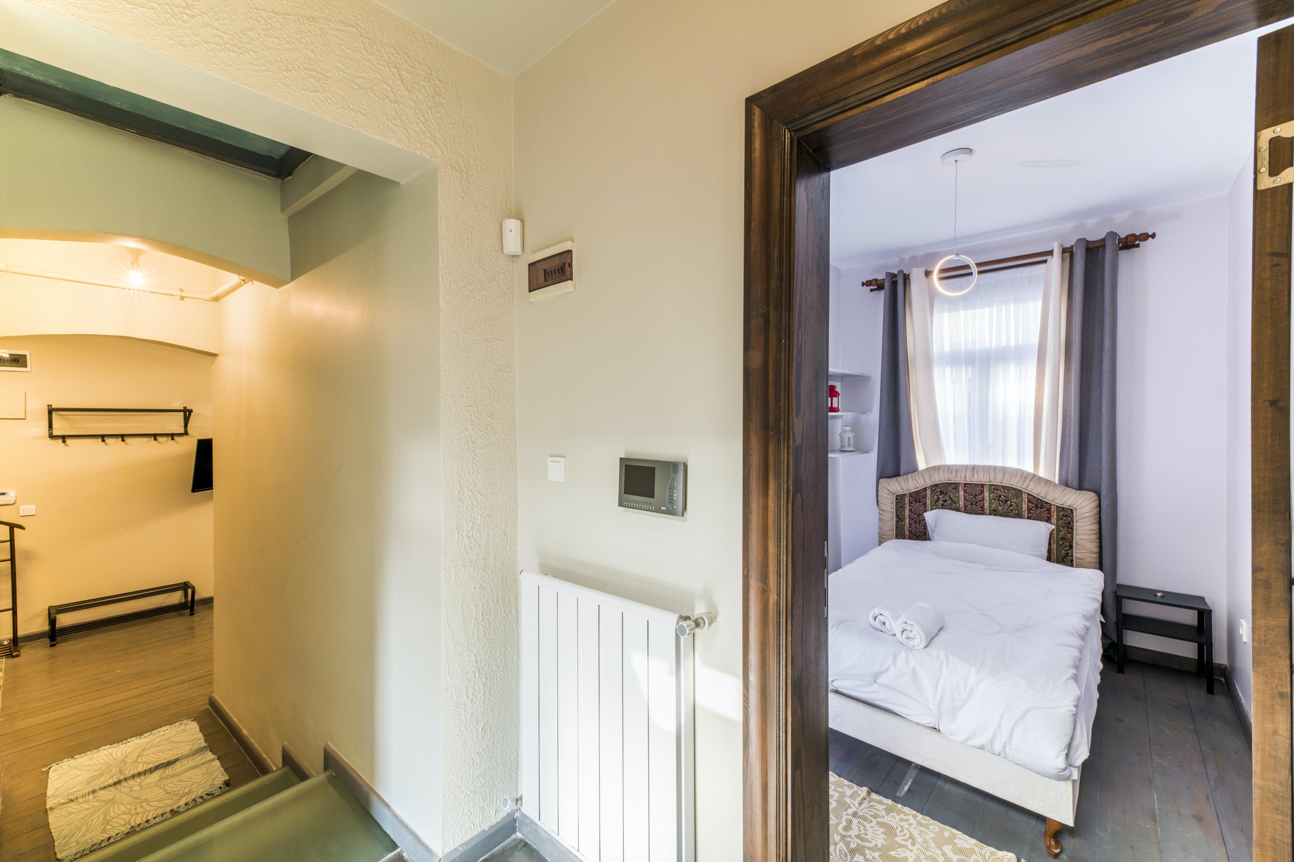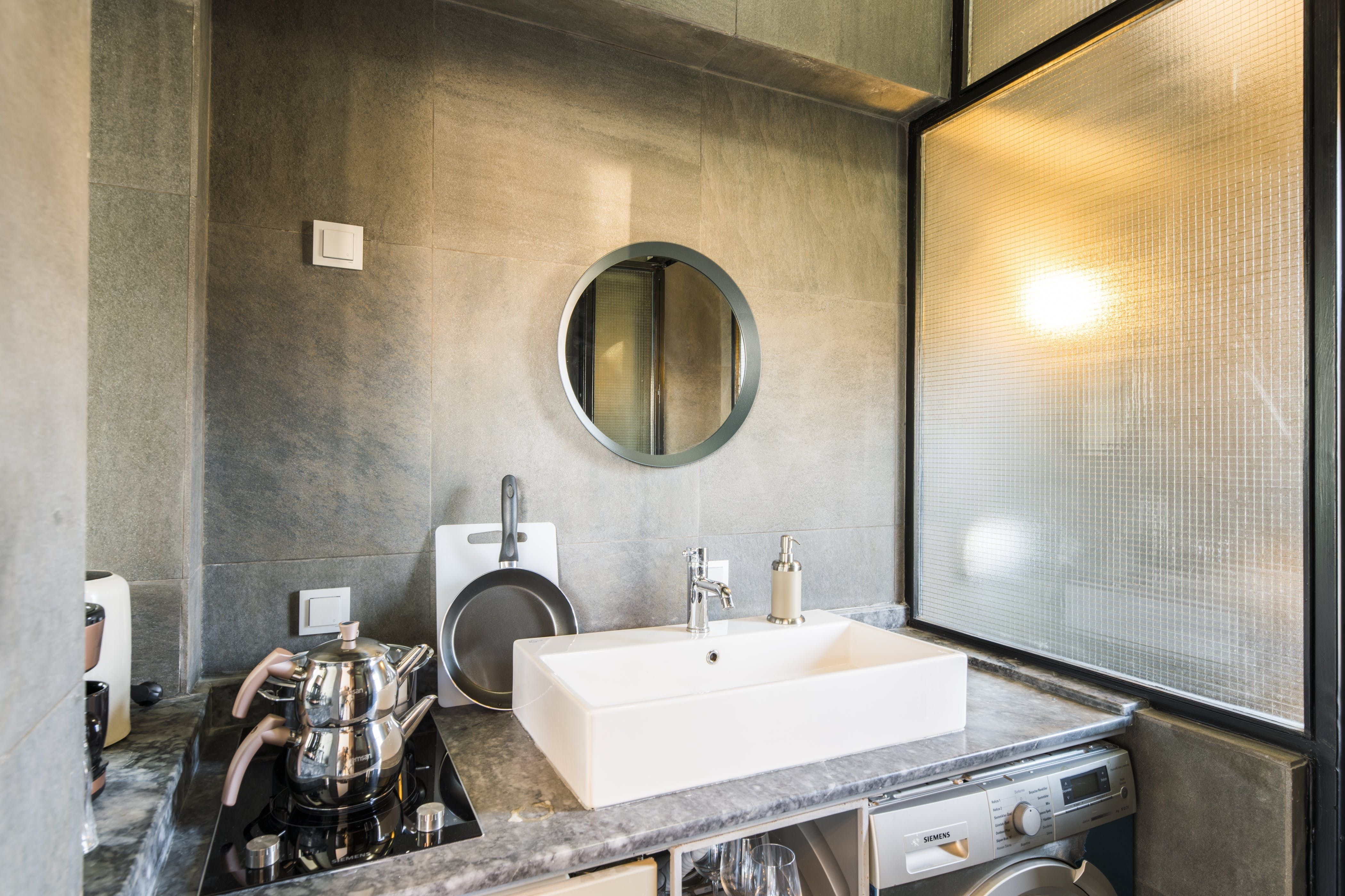 The home itself consists of three apartments with their own kitchens, living rooms and entrances for a little extra privacy. Three rooftop terraces have far-reaching city views over the shambling rooftops of Galata and across the Bosphorus to the iconic Hagia Sofia. There are areas to dine outside, sofas for relaxing with a Turkish tea and a barbecue if you want to add to the lamb-smoke scent of Istanbul’s kebab houses in the area.