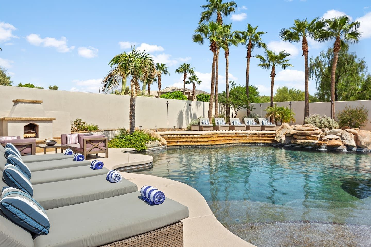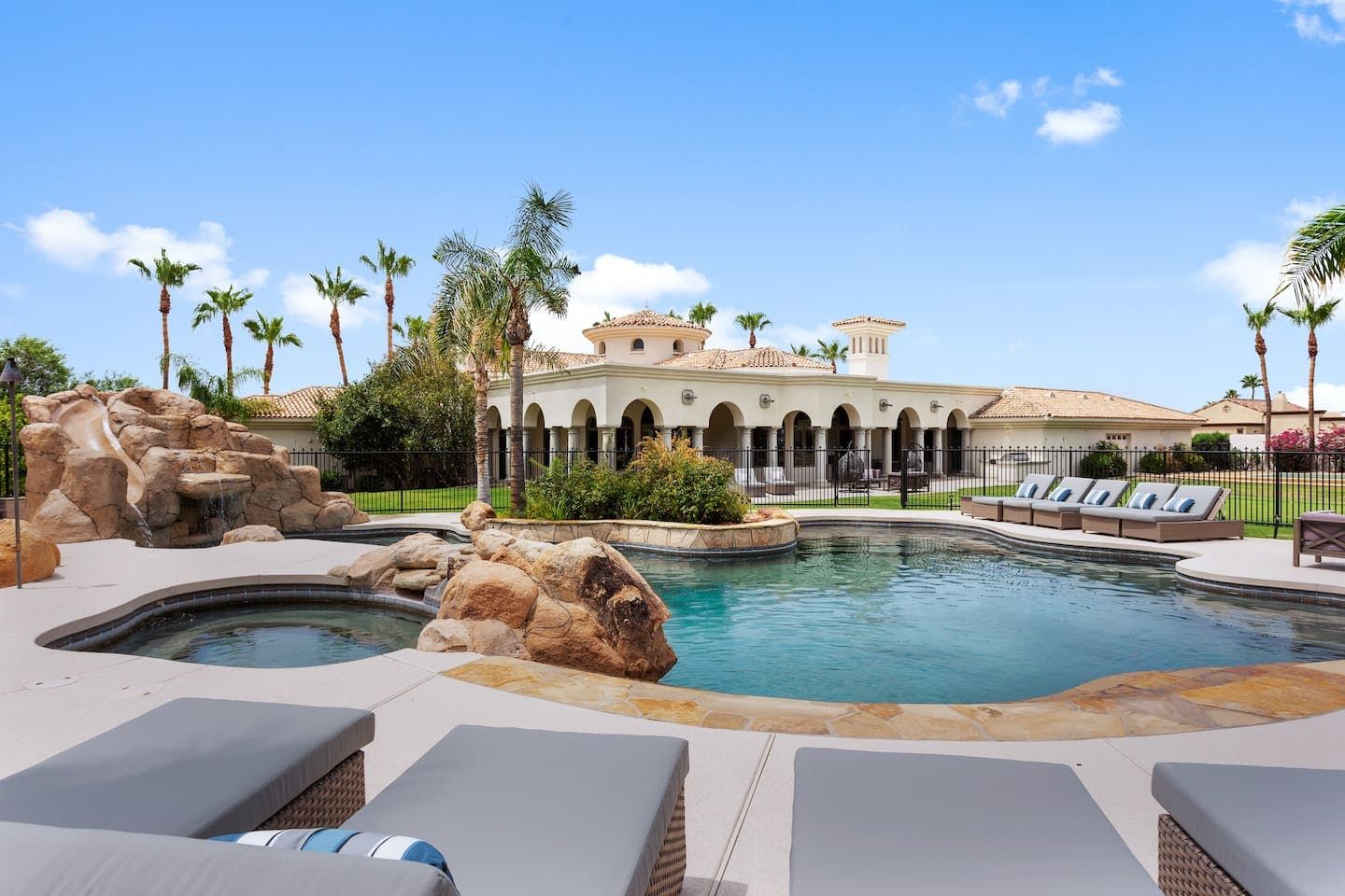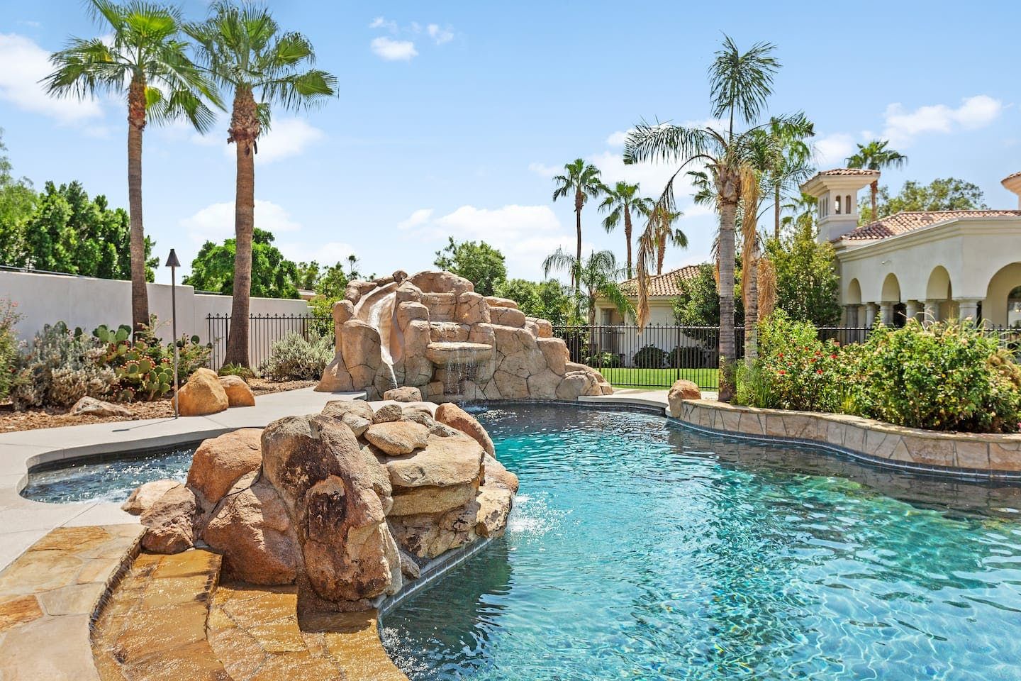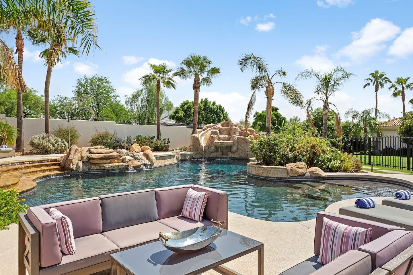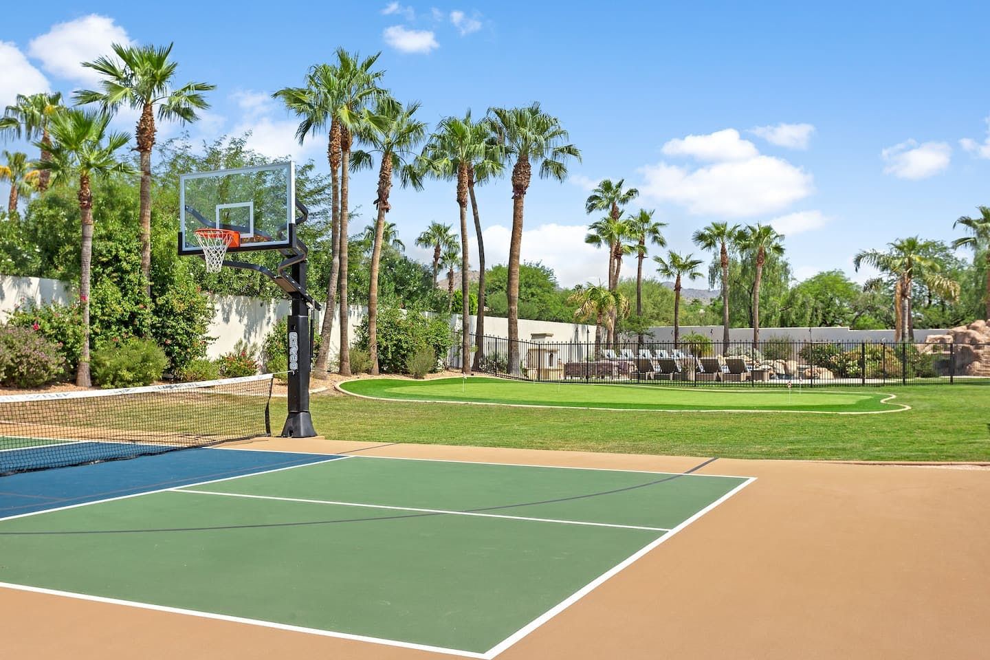 It wouldn't be doing this property justice to call it a "home" as it truly is so much more than that. Combining everything you'd find at a five-star hotel resort with the added bonus of having it all to yourselves – this one-of-a-kind villa offers the trip of a lifetime. Set in Scottsdale, guests can soak up the Arizona sunshine from almost anywhere on the property and beyond. With so many extravagant outdoor spaces to choose from, you certainly won't be short on things to do here. In fact, the problem may rest more with if you'll have enough time to try out all of the amenities on offer. Whether it's relaxing by the waterfall pool (with a water slide), unwinding in the jacuzzi or playing a game of tennis, foosball, ping pong, pickleball, basketball or mini-golf – you'll find something to enjoy before having even stepped foot inside. When you can tear yourself away from the glorious sunshine outside, prepare to be impressed by the impeccable soothing interiors which invite guests to relax in style through neutral colours and natural materials. With plenty of designated workspaces dotted around the home, you'll be able to balance work with play when staying here too. Once you've worked up an appetite, hire a private chef to come and cook for you in the state of the art kitchen – you'll have the choice of dining alfresco on the terrace or inside with a view of the garden from the formal dining area. After dinner, head to the games room for a round of pool, or cosy up in front of the (indoor or outdoor) fireplace with a nightcap in hand, before making the most of the spa-like bathrooms. We particularly appreciate the ultra-luxurious mattresses and bedding, ensuring a dreamy night's sleep they'll have you feeling refreshed and ready to discover the local hikes and desert trails in no time. Venture out to one of the many breathtaking and iconic Camelback trails in Scottsdale – Camelback mountain and Black Mountain are both around a thirty-minute drive away. With the Old Town, only fifteen minutes away and Downtown Phoenix, just twenty-five minutes away – lap up your own secluded slice of heaven without being too far away from the centre of town should you need it.