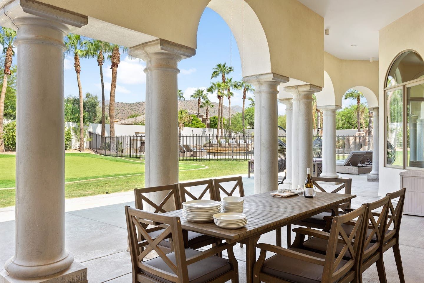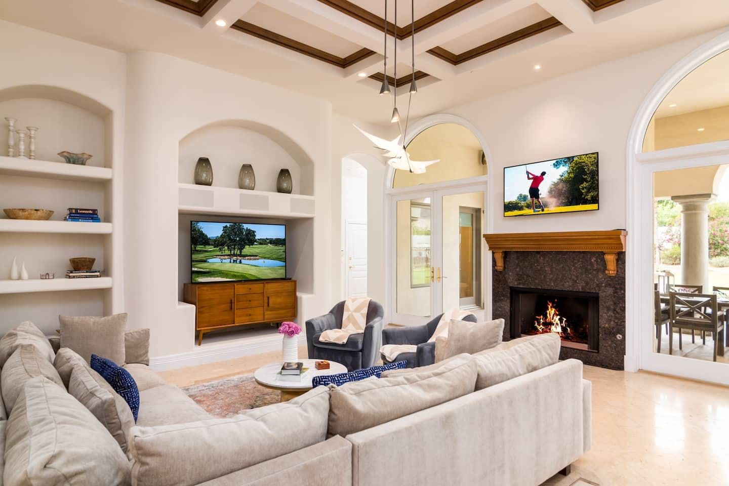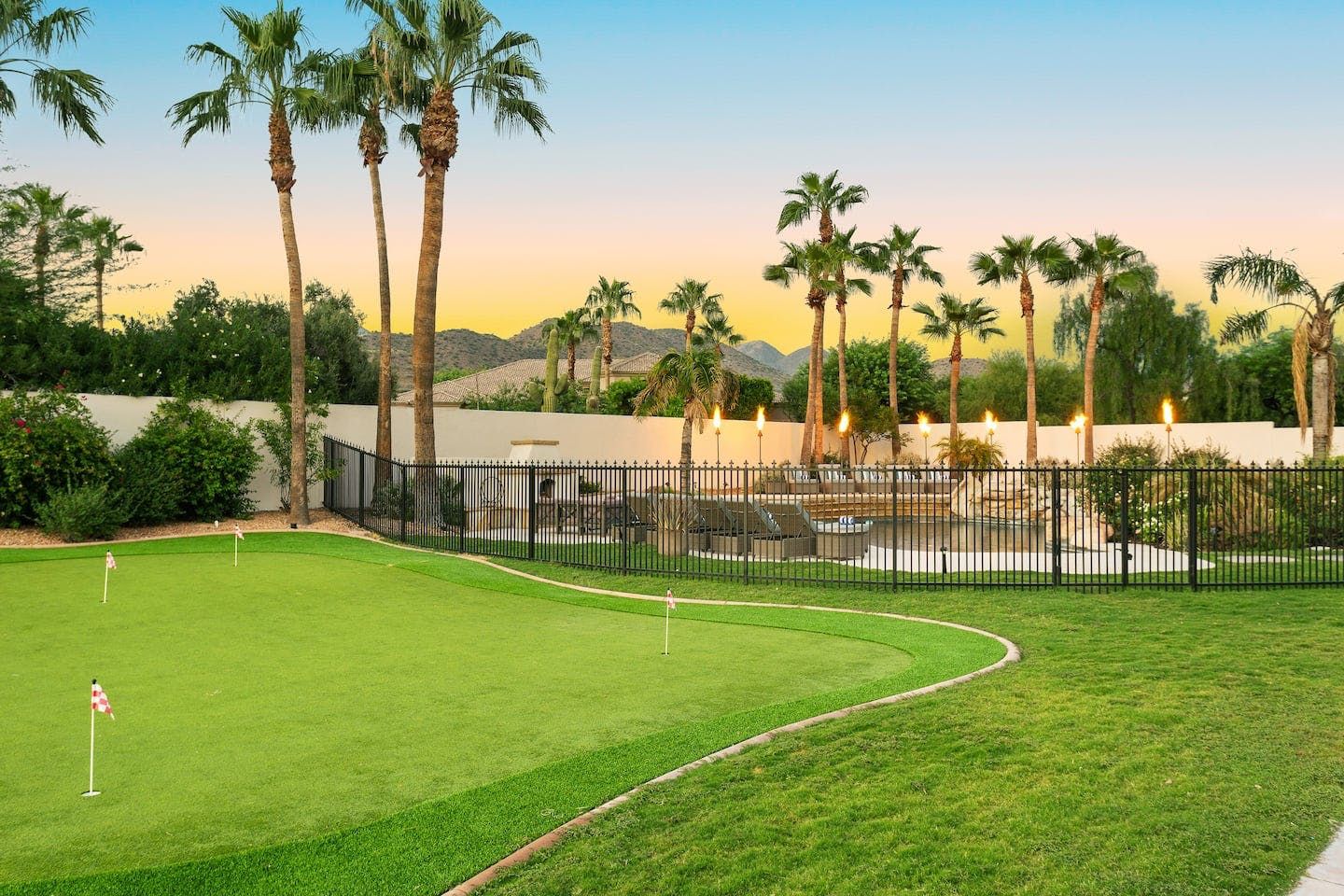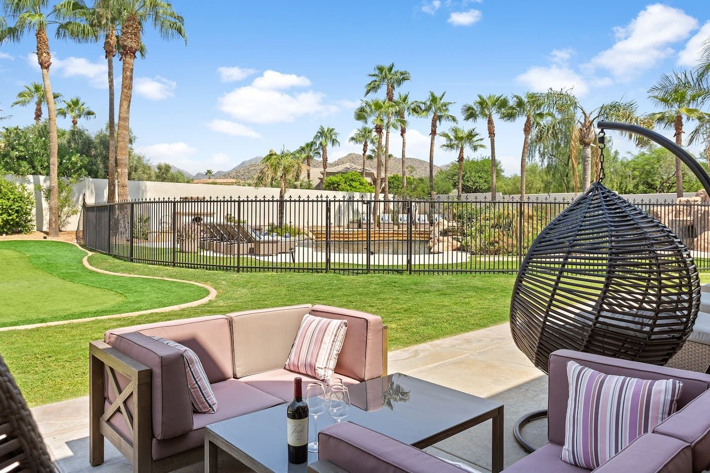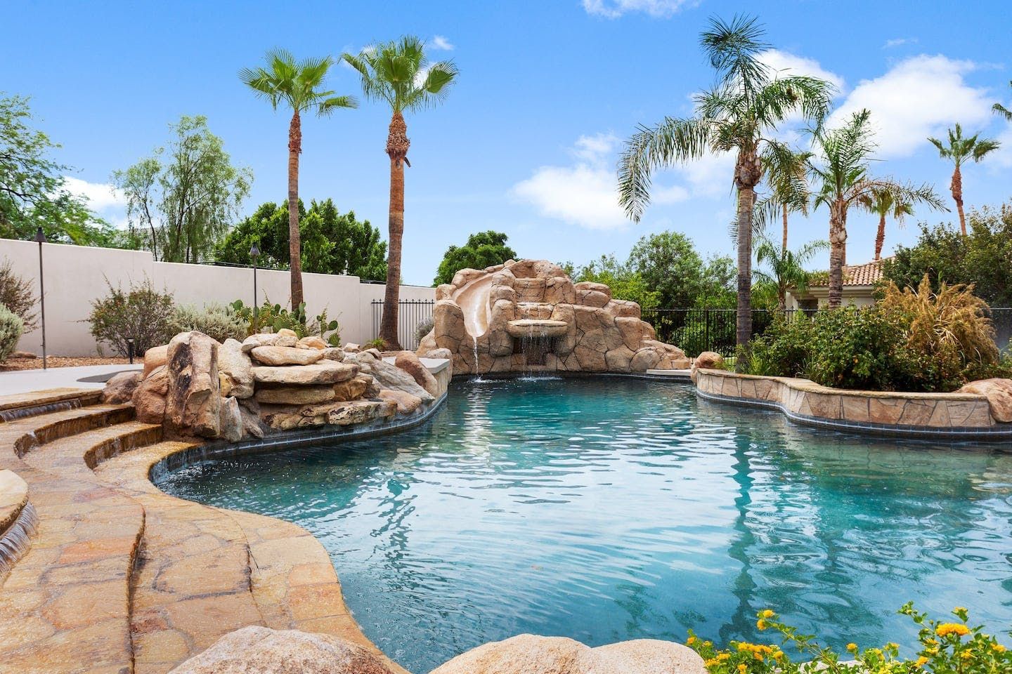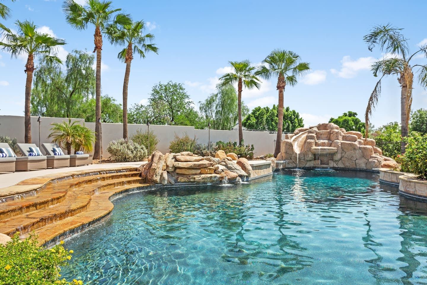 It wouldn't be doing this property justice to call it a "home" as it truly is so much more than that. Combining everything you'd find at a five-star hotel resort with the added bonus of having it all to yourselves – this one-of-a-kind villa offers the trip of a lifetime. Set in Scottsdale, guests can soak up the Arizona sunshine from almost anywhere on the property and beyond. With so many extravagant outdoor spaces to choose from, you certainly won't be short on things to do here. In fact, the problem may rest more with if you'll have enough time to try out all of the amenities on offer. Whether it's relaxing by the waterfall pool (with a water slide), unwinding in the jacuzzi or playing a game of tennis, foosball, ping pong, pickleball, basketball or mini-golf – you'll find something to enjoy before having even stepped foot inside. When you can tear yourself away from the glorious sunshine outside, prepare to be impressed by the impeccable soothing interiors which invite guests to relax in style through neutral colours and natural materials. With plenty of designated workspaces dotted around the home, you'll be able to balance work with play when staying here too. Once you've worked up an appetite, hire a private chef to come and cook for you in the state of the art kitchen – you'll have the choice of dining alfresco on the terrace or inside with a view of the garden from the formal dining area. After dinner, head to the games room for a round of pool, or cosy up in front of the (indoor or outdoor) fireplace with a nightcap in hand, before making the most of the spa-like bathrooms. We particularly appreciate the ultra-luxurious mattresses and bedding, ensuring a dreamy night's sleep they'll have you feeling refreshed and ready to discover the local hikes and desert trails in no time. Venture out to one of the many breathtaking and iconic Camelback trails in Scottsdale – Camelback mountain and Black Mountain are both around a thirty-minute drive away. With the Old Town, only fifteen minutes away and Downtown Phoenix, just twenty-five minutes away – lap up your own secluded slice of heaven without being too far away from the centre of town should you need it.
