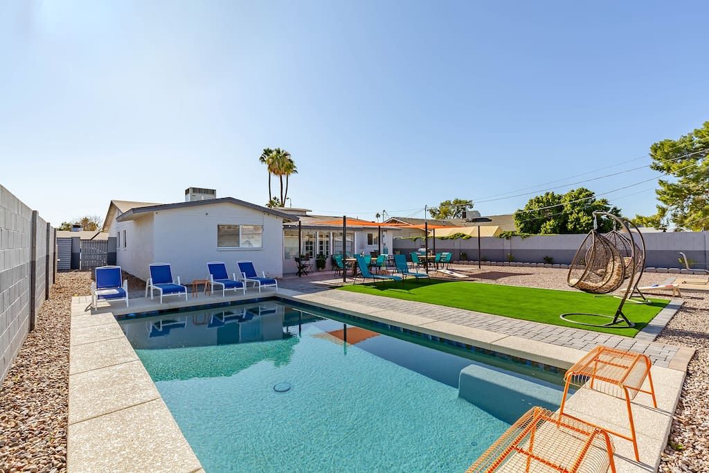 Looking for the ultimate getaway for a large family? This fabulous home in sunny Scottsdale has something to impress everyone - even the impossible to please. First up there's the kitchen. It has all the high-spec equipment you need to create a banquet, plus room for a head-chef, sous-chef and diligent vegetable peeler/washer-upper without squabbles breaking out. The open-plan living room is elegant space, with a large flat-screen TV and L-shaped sofa big enough for small army of popcorn munching movie-watchers. The bedrooms are all individually designed, and we particularly love the children's room with its comfy bunk beds, blue-and-white teepee and pastel-coloured bean bags. Out in the garden there's a good-sized turquoise pool, plenty of games equipment (including small, moveable football goals for pool footie), a roaring fire pit and wicker hanging egg chairs. And if you can tear yourself away, this home is in the heart of Scottsdale, and the bars, restaurants, shops plus Scottsdale baseball stadium are all a short drive away.