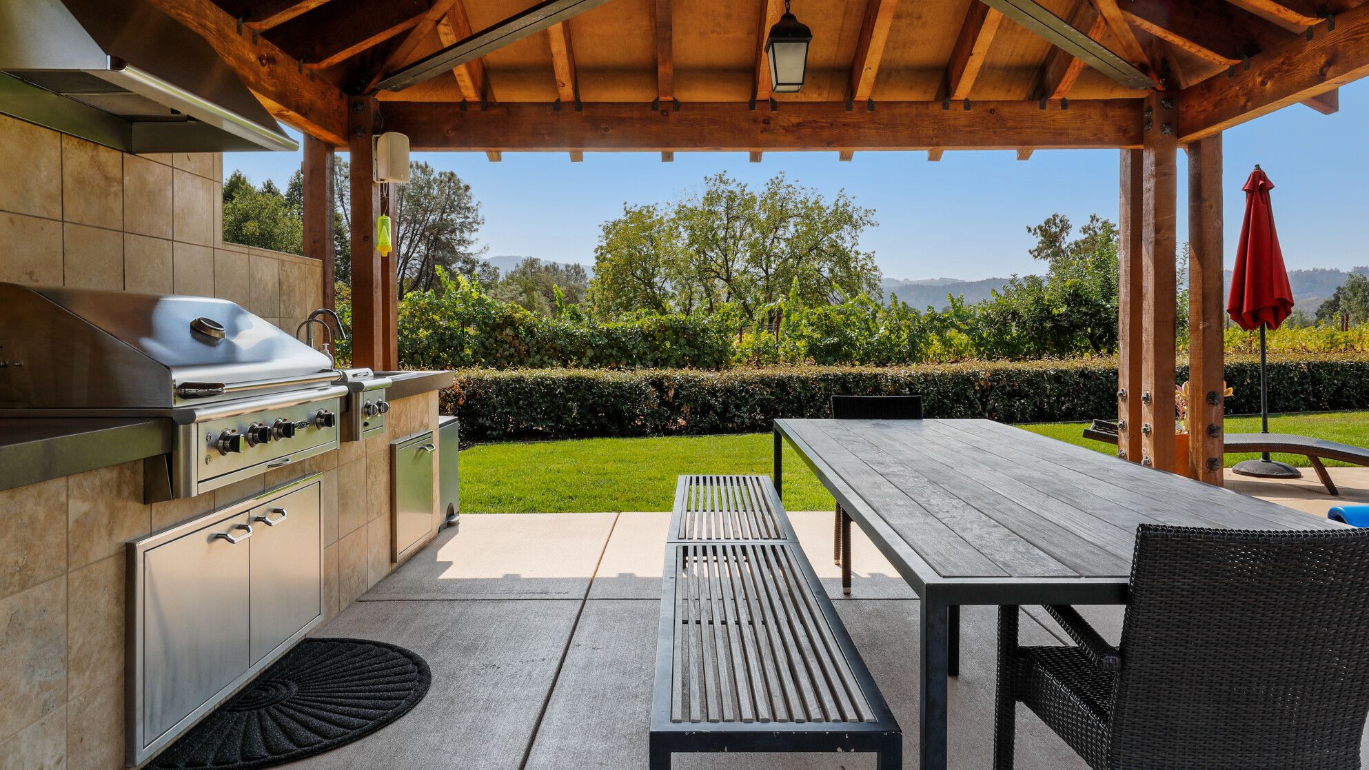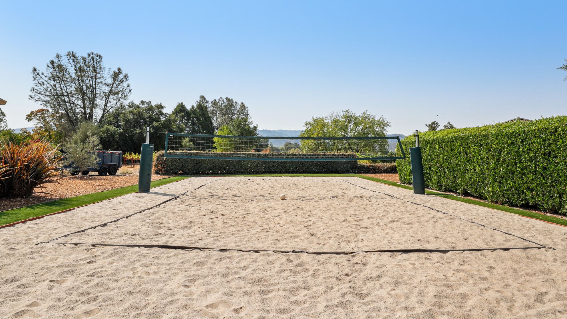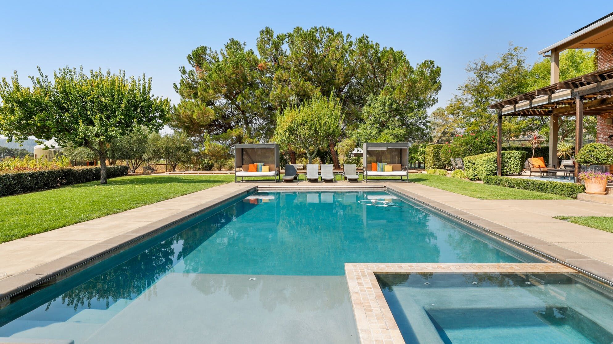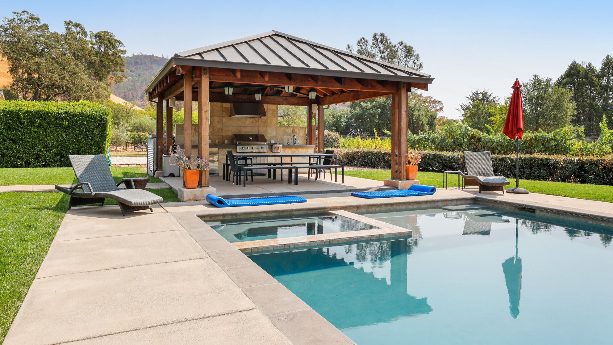 Just outside of the village of Calistoga in the northernmost tip of the Napa Valley, you'll encounter this rustic yet refined retreat surrounded by acres of verdant vineyards and lush gardens. With no nearby neighbours, enjoy that all-too-rare feeling of seclusion, yet the convenience of only being a mile and a half from downtown Calistoga. The estate is divided across three adjacent villas – which helps maintain privacy for large family get-togethers and groups of friends – while there's a yurt on the grounds that makes for an adventurous option for the kids. Everything here is set up for outdoor living. There are no fewer than twelve sets of French doors leading out onto ~1,000 sq ft of balconies and ~2,000 sq ft of patio space. The large outdoor gazebo boasts a full outdoor kitchen with a serious gas barbecue and alfresco dining area overlooking the stunning pool and Jacuzzi area. In addition to the usual high-end outdoor amenities, you'll also find professional-standard courts for sand volleyball, bocce ball and tennis. We sense a bit of friendly competition. Take a peek inside the barn, and you'll find a private games room with a pool table, ping pong, air hockey, and dartboard and a large rose garden adjacent to the villa, which provides fresh roses daily.