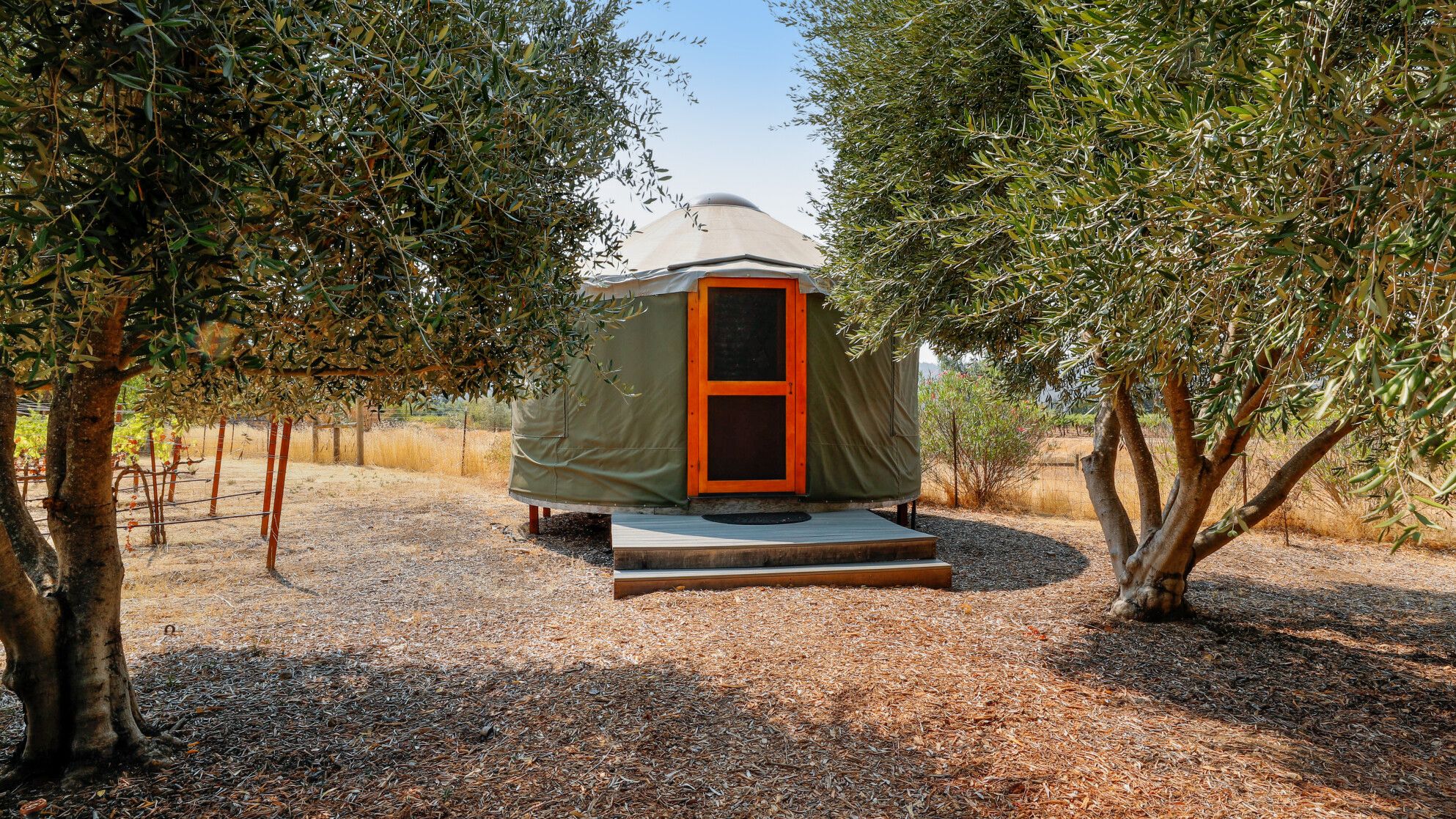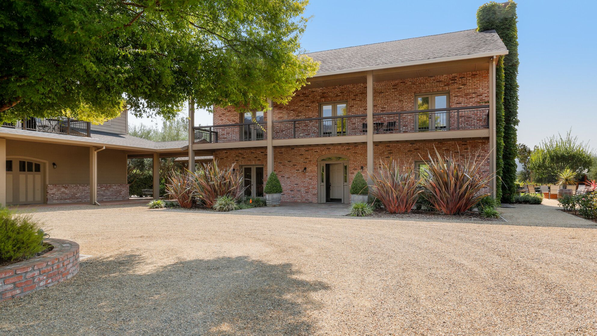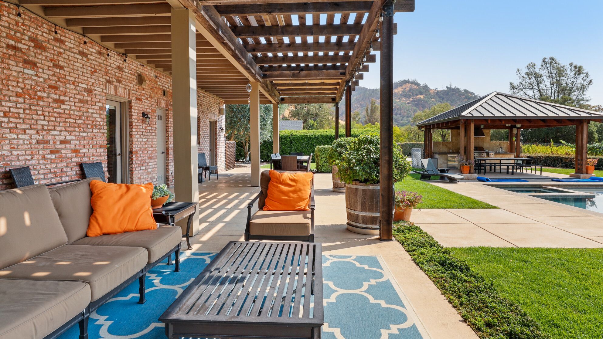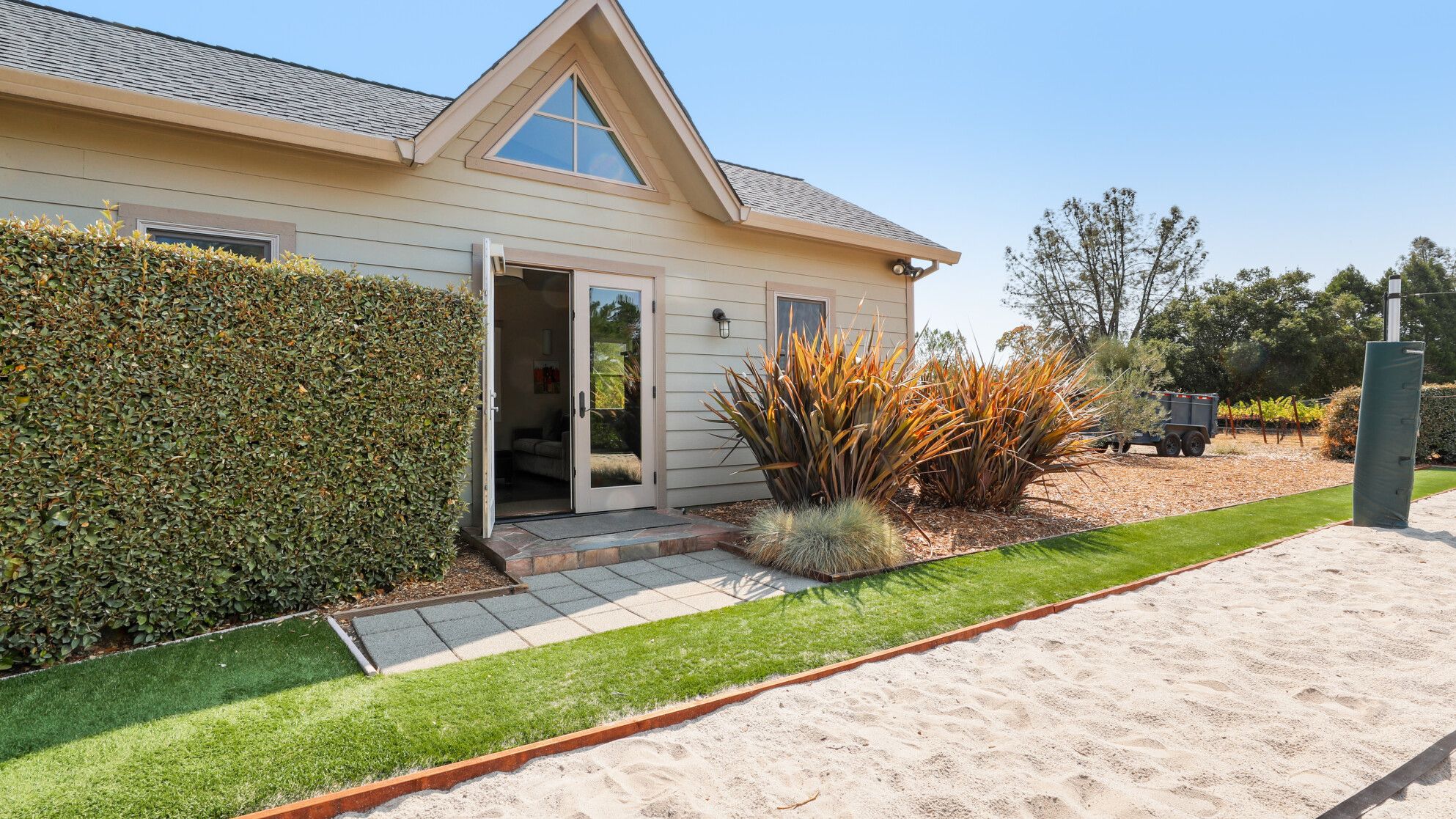 Just outside of the village of Calistoga in the northernmost tip of the Napa Valley, you'll encounter this rustic yet refined retreat surrounded by acres of verdant vineyards and lush gardens. With no nearby neighbours, enjoy that all-too-rare feeling of seclusion, yet the convenience of only being a mile and a half from downtown Calistoga. The estate is divided across three adjacent villas – which helps maintain privacy for large family get-togethers and groups of friends – while there's a yurt on the grounds that makes for an adventurous option for the kids. Everything here is set up for outdoor living. There are no fewer than twelve sets of French doors leading out onto ~1,000 sq ft of balconies and ~2,000 sq ft of patio space. The large outdoor gazebo boasts a full outdoor kitchen with a serious gas barbecue and alfresco dining area overlooking the stunning pool and Jacuzzi area. In addition to the usual high-end outdoor amenities, you'll also find professional-standard courts for sand volleyball, bocce ball and tennis. We sense a bit of friendly competition. Take a peek inside the barn, and you'll find a private games room with a pool table, ping pong, air hockey, and dartboard and a large rose garden adjacent to the villa, which provides fresh roses daily.