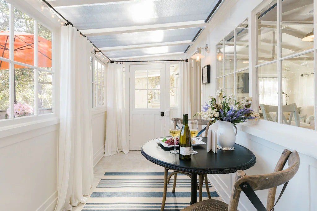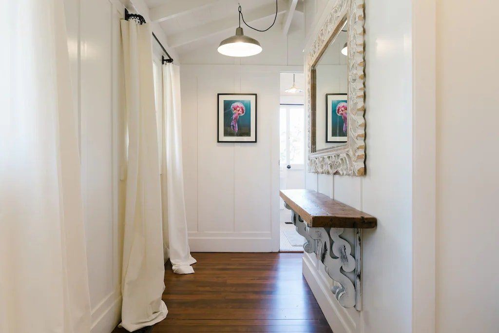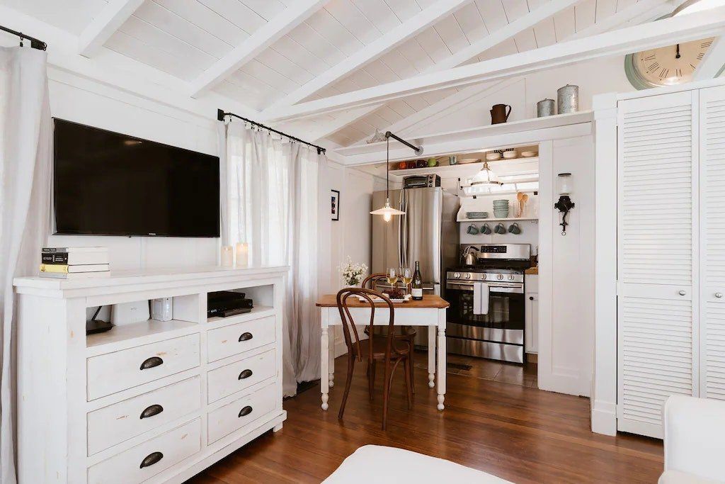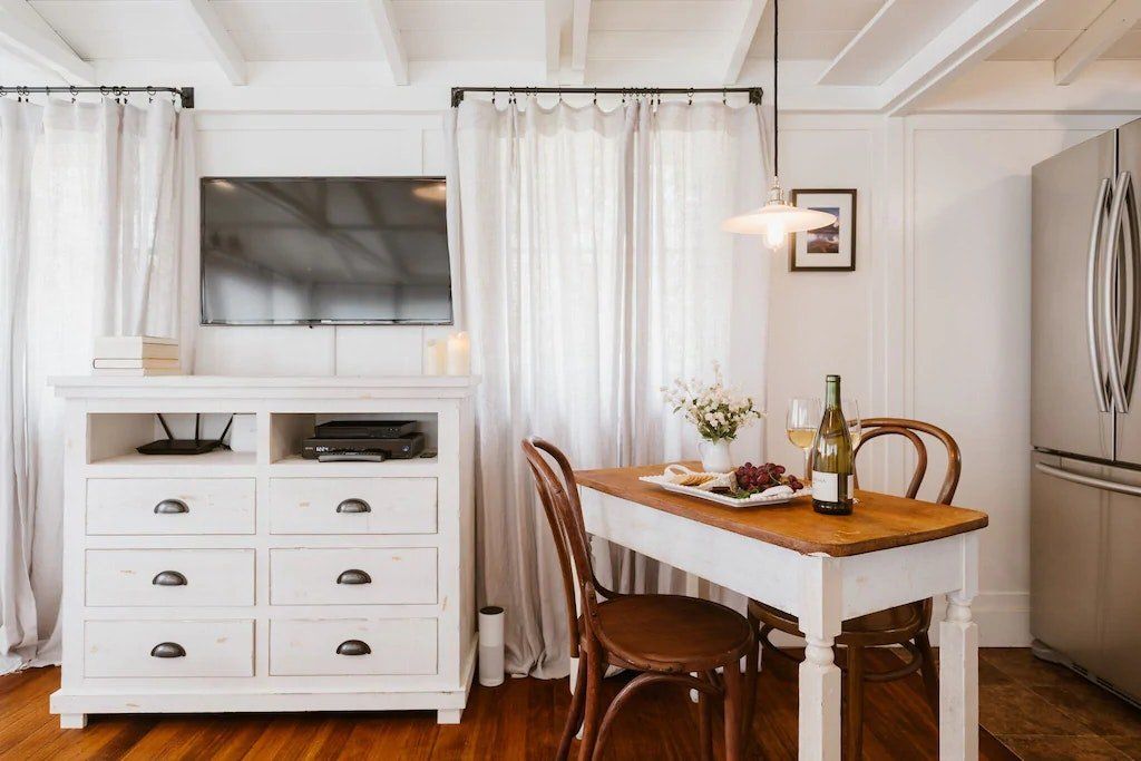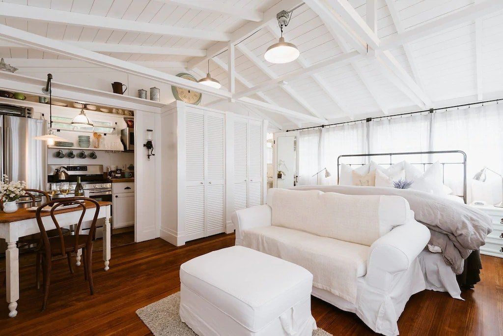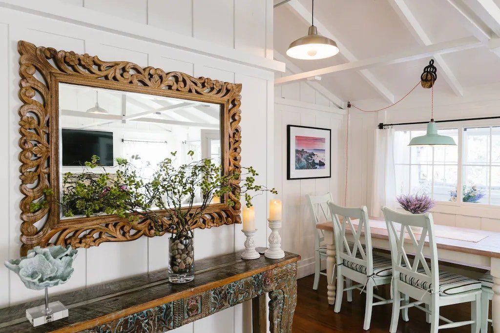 The host of this renovated beach hut in downtown Carmel-by-the-Sea has done a stellar job in retaining the home's historical character while also ensuring it belongs well and truly in the twenty-first century. Pinewood flooring, original windows and the stone fireplace are accompanied by industrial-inspired lighting, furnishings in an angelic shade of white and pops of colour from prints hanging on the wall. At the back of the house, there's a covered porch and a terrace complete with alfresco seating and a barbecue — that's summer afternoons sorted, then. When the sun does makes an appearance — which isn't unheard of in these parts — a ten-minute walk down Ocean Avenue will get you to Carmel Beach, while there are a host of art galleries and restaurants that surround the home.
