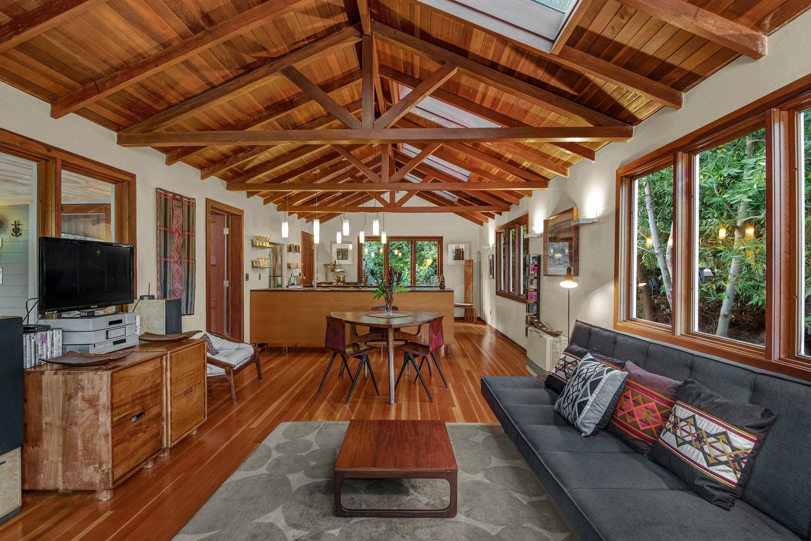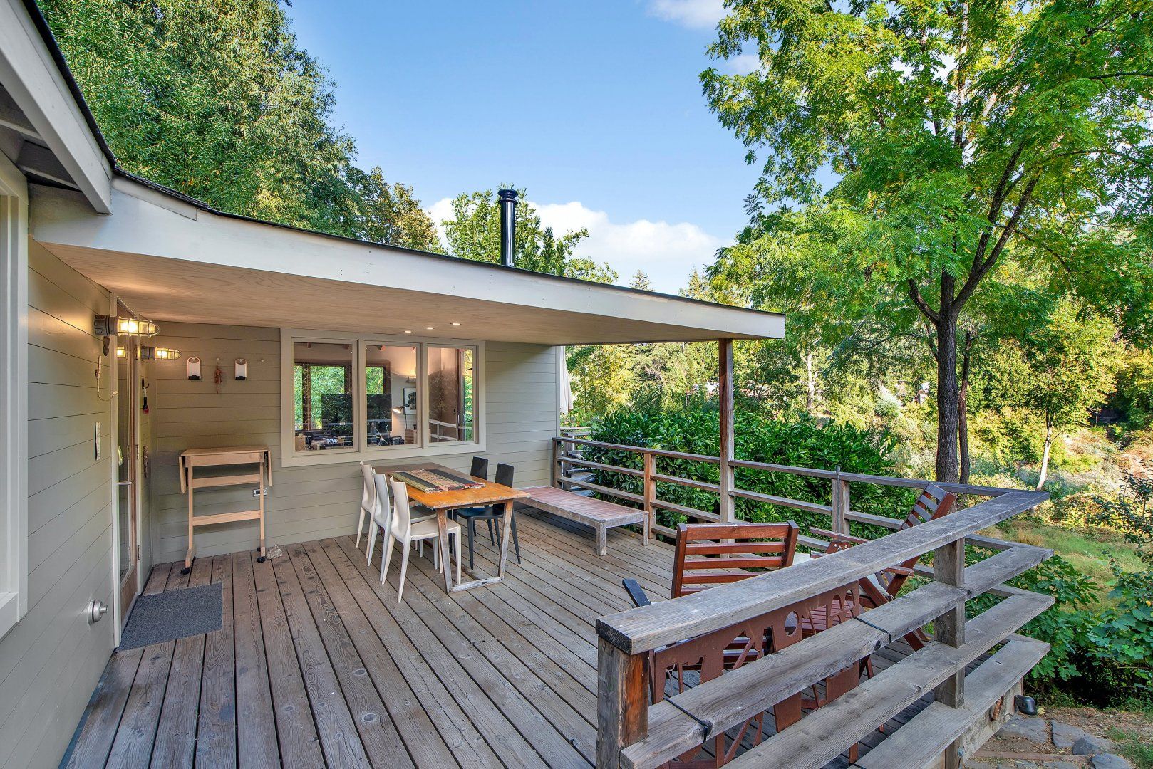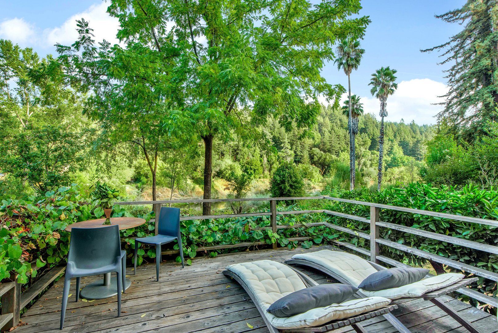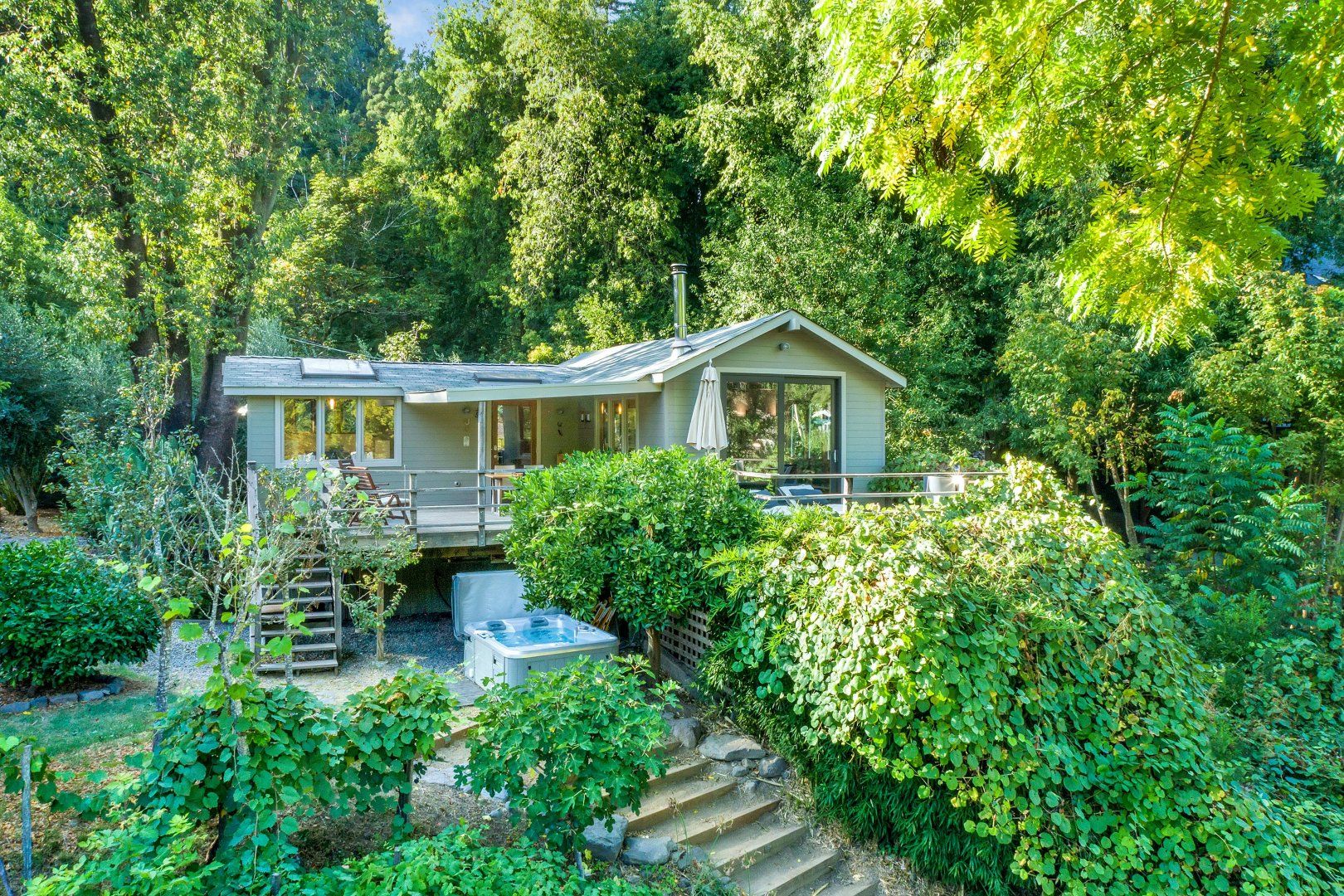 Get away from the everyday at this lovely riverside cottage, located on the shores of the Russian River in Forestville, Sonoma County. This home is sophisticated, warm and welcoming, with a covered terrace where you can admire the lush leafiness around you, as well as the views of the water. Outside, a hot tub invites you to soak away your worries, while a fire pit allows for evenings spent sipping cocoa under the stars. The shore is located at the bottom of the backyard, with a canoe for you to embark on adventures down the river.