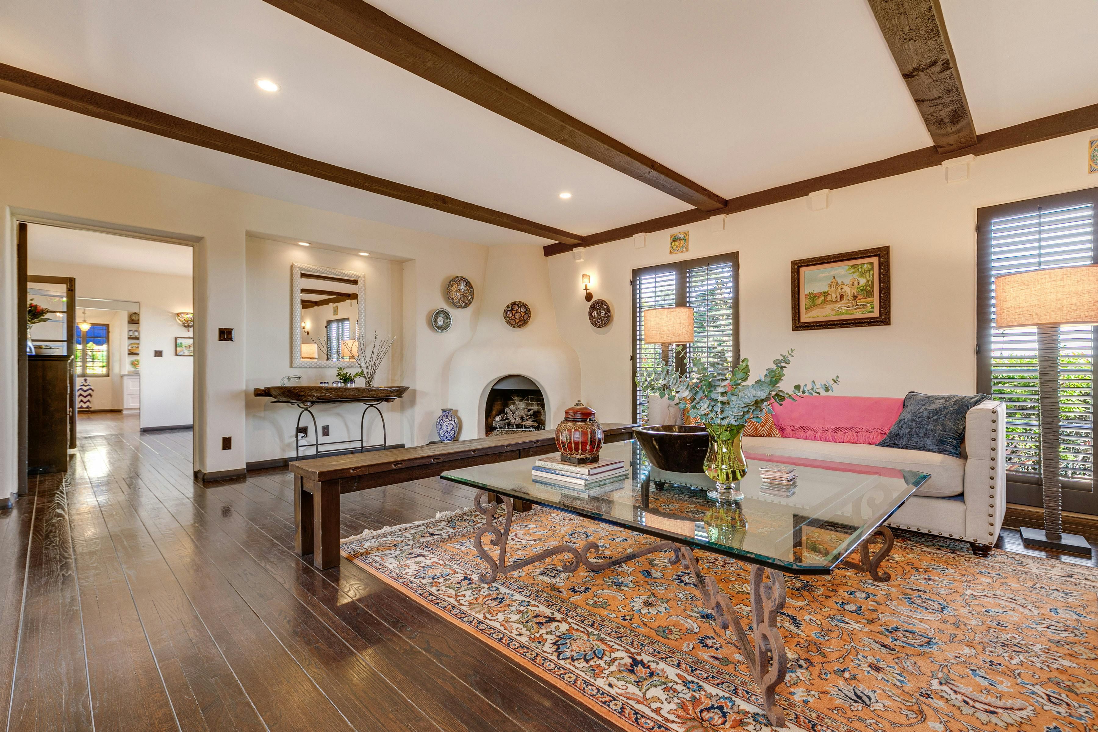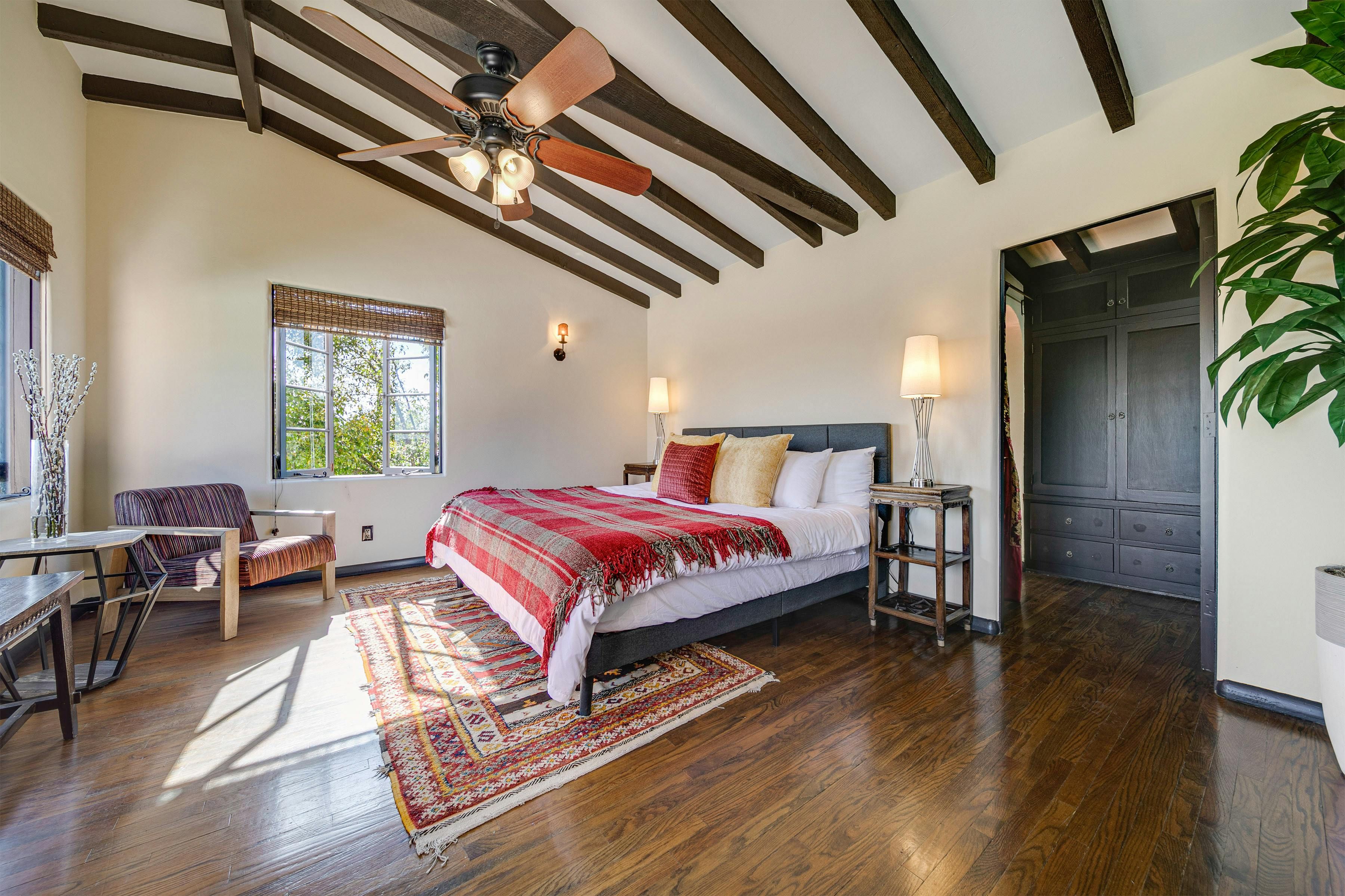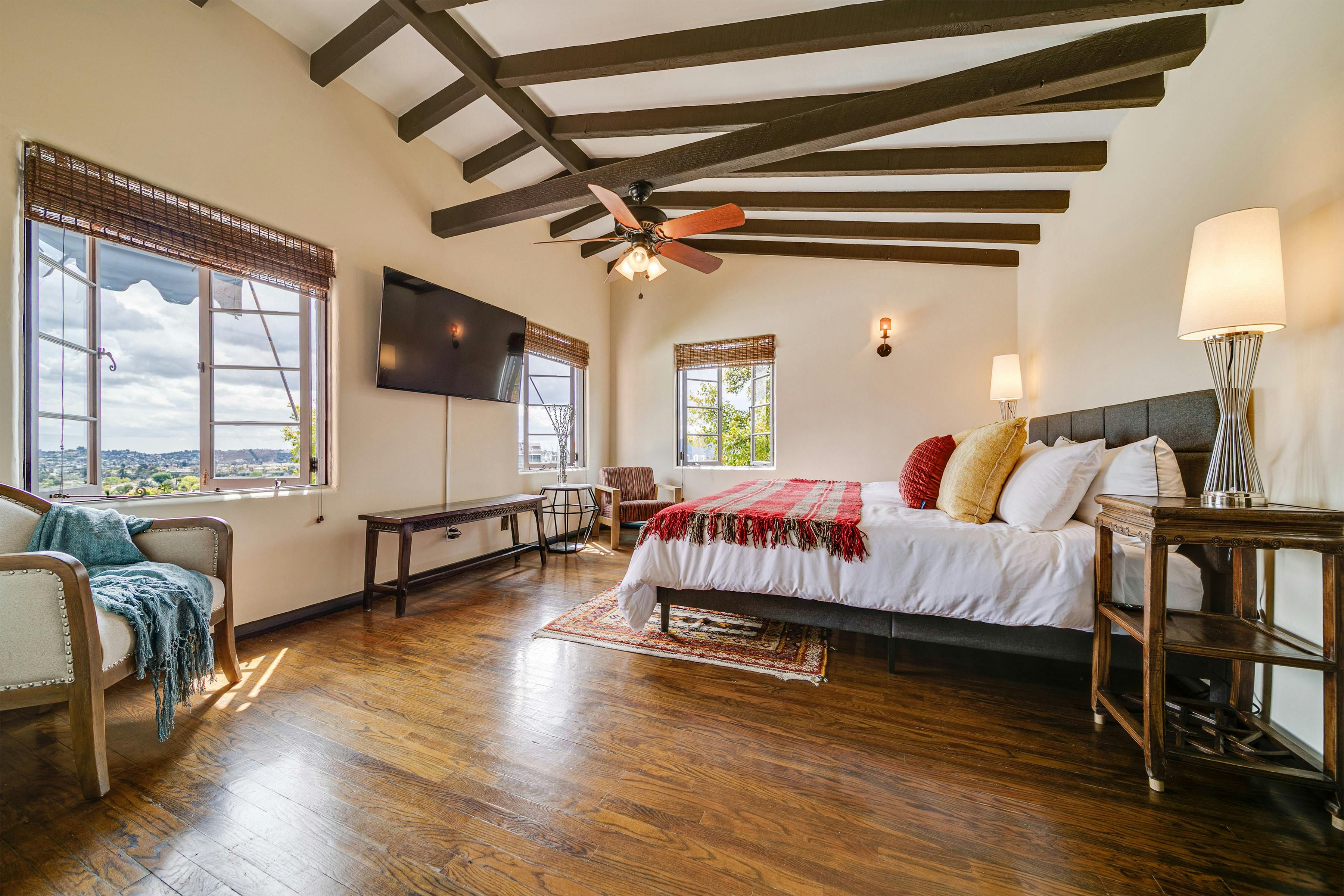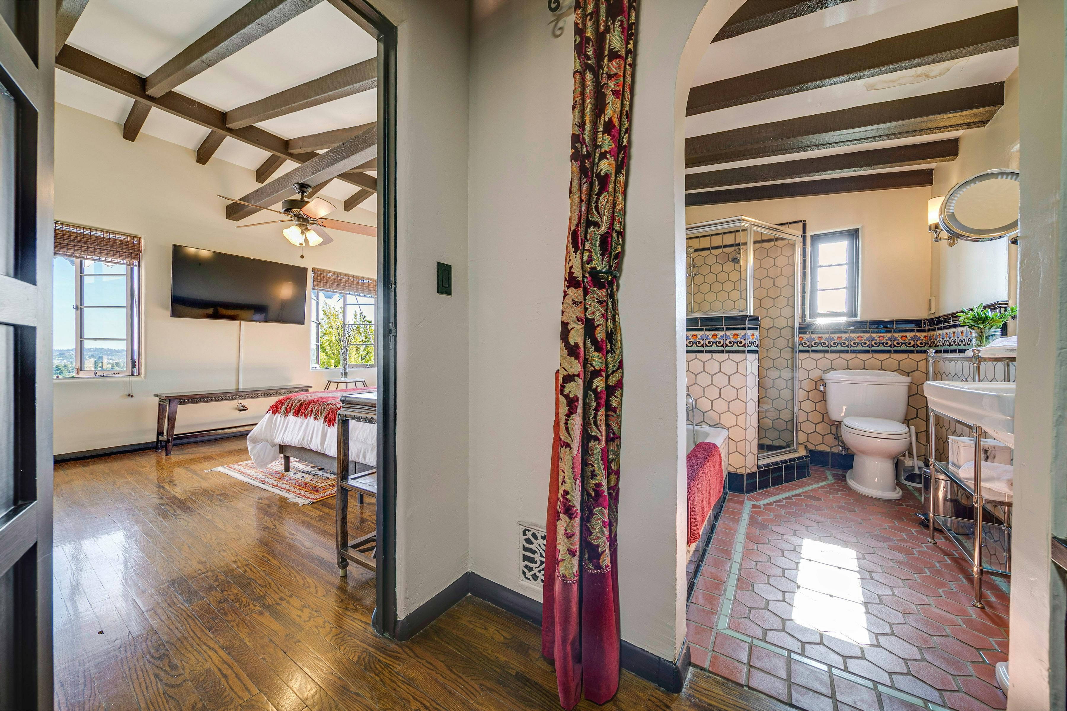Charm and character are in abundance at this luxury home in Glendale. Fusing rustic charm with contemporary touches, you can expect wooden beams, a Kiva fireplace and enclosed gardens featuring a swimming pool and hot tub. Enjoy views over Downtown Los Angeles or read a book in the California Hacienda-style courtyard that acts as a quiet retreat not far from the vibrant heart of LA. It's only a short drive to Pasadena and Griffith Park. That said, when staying in such an elegant oasis, you could just as easily stay in and enjoy the impressive surroundings of this Hollywood home.