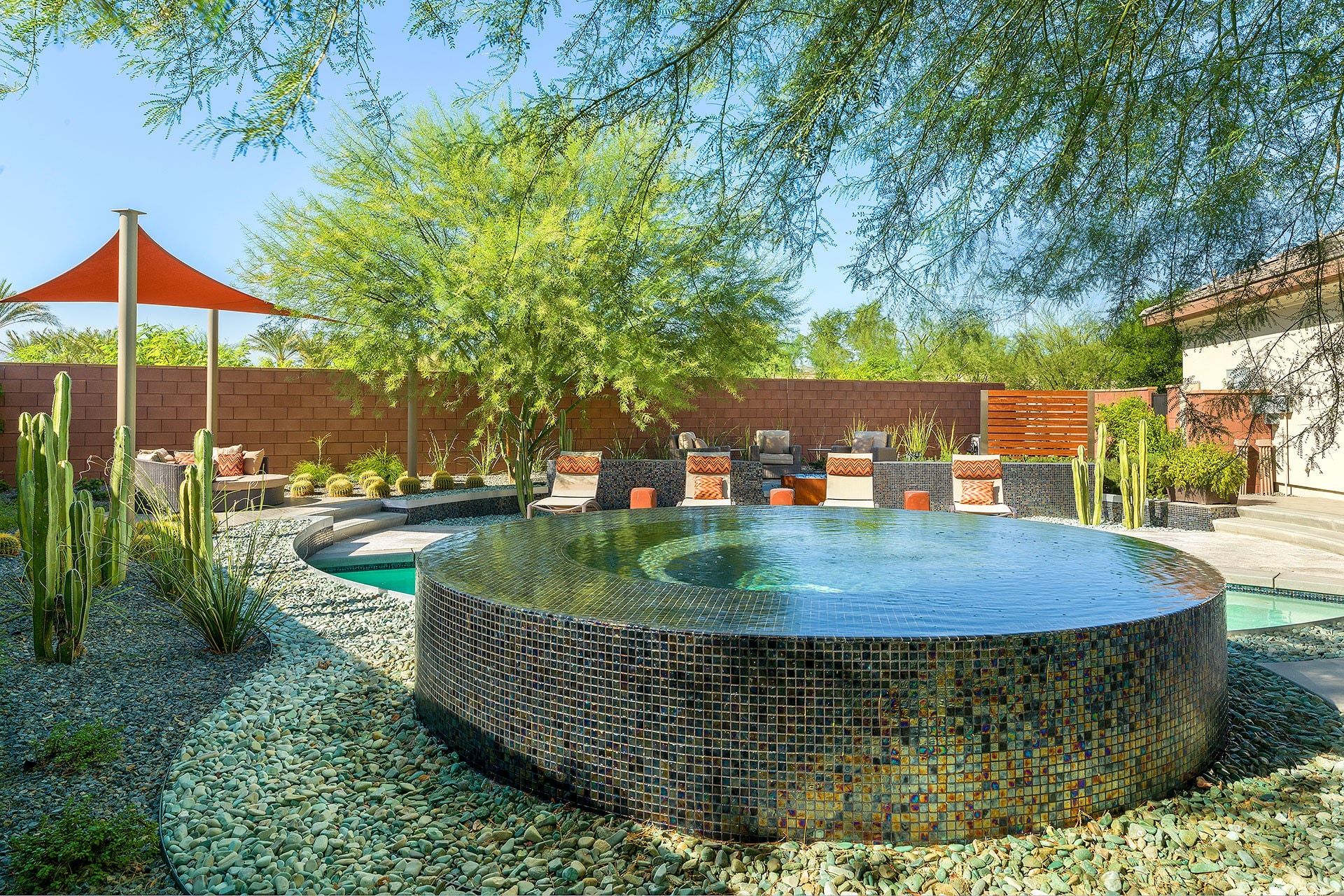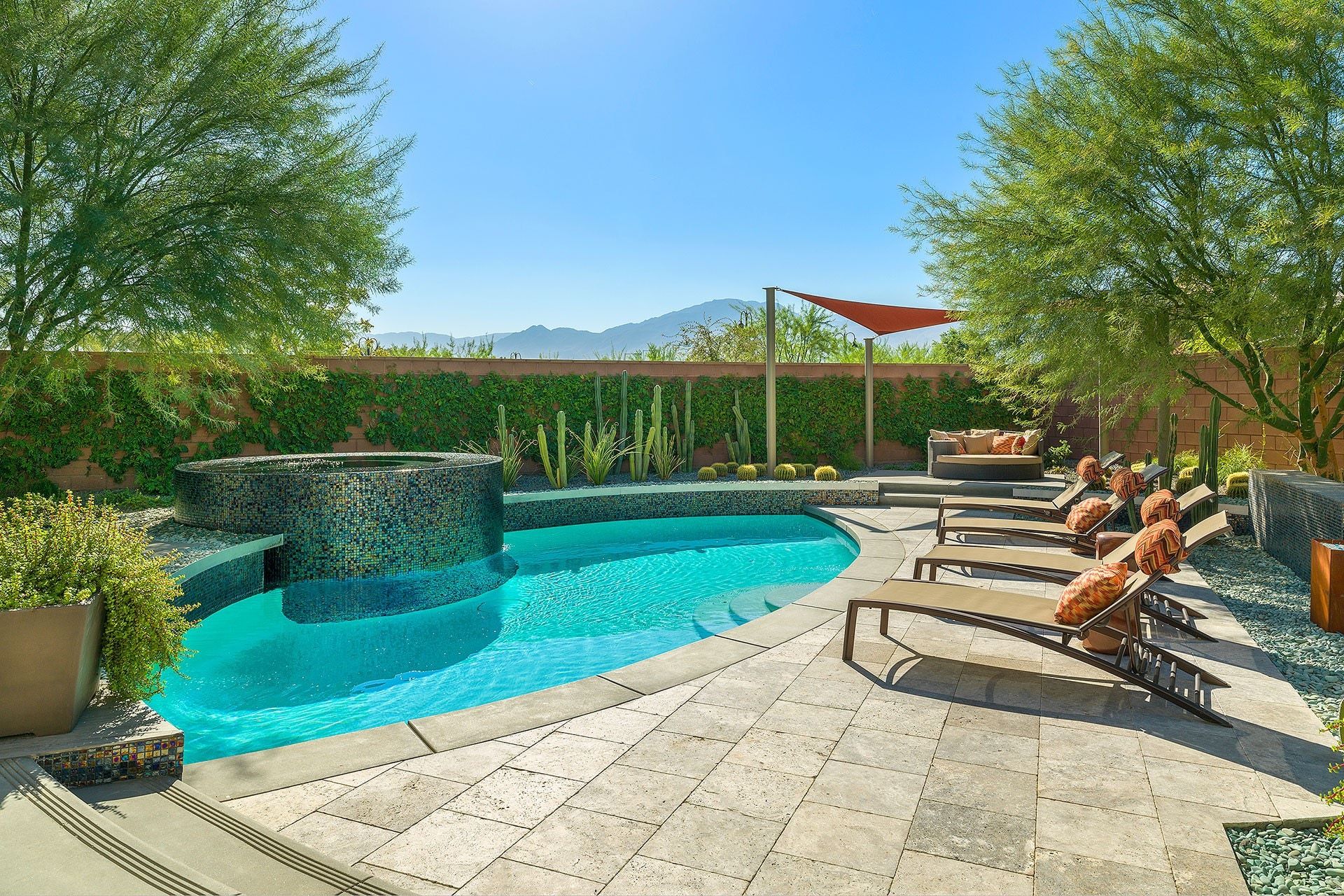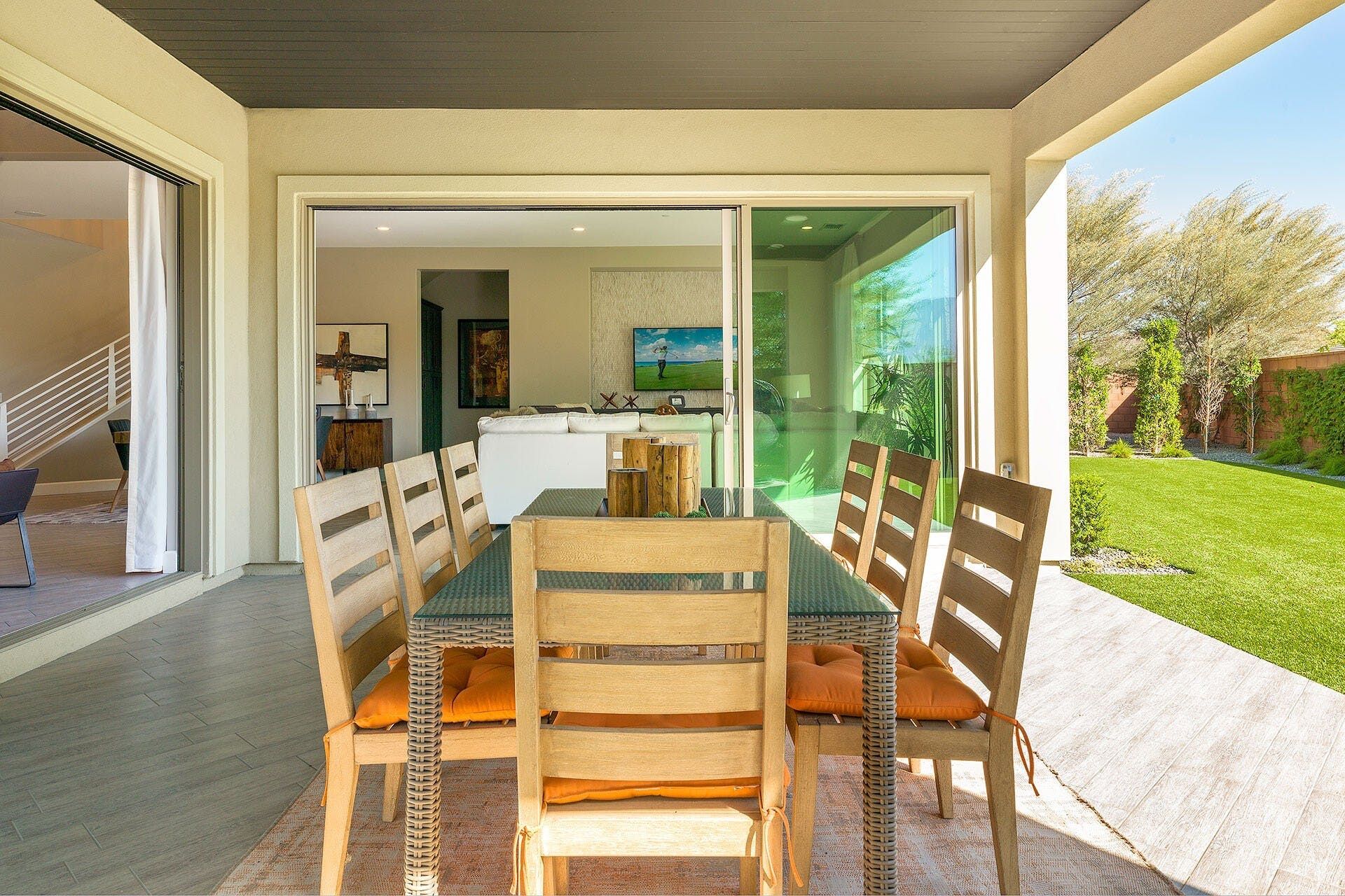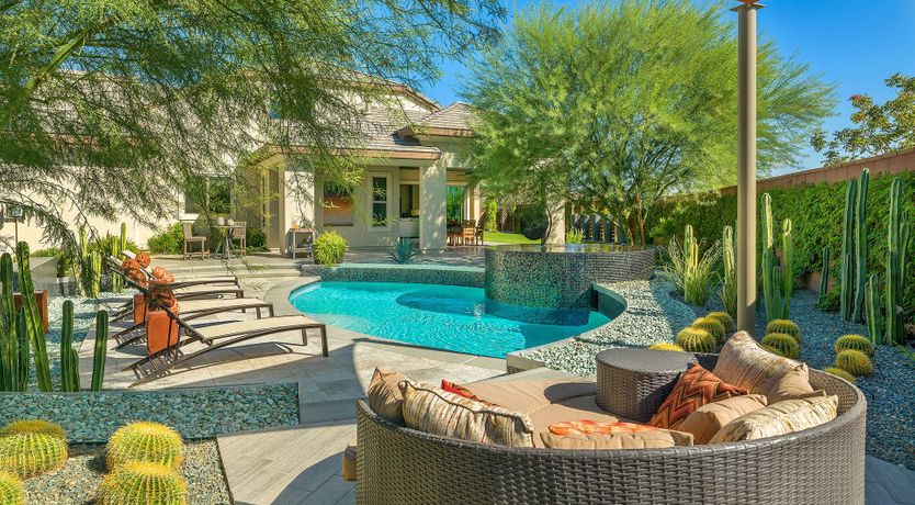 This vibrant, luscious, and luxe home is the ideal spot for a desert escape in the Coachella Valley. Your host will have sorted a fully stocked fridge, and touches like this really set the home apart. The garden feels like an oasis - definitely an overused term for desert dwellings, but no exaggeration here. The salt water flows from the spa into the pool, while branches hang overhead and stone pathways lead you around the serene garden. There’s a well-kept lawn, perfect for a game of croquet or bocce ball. The sleek and effortless home is just as gorgeous indoors, with chocolate leather furniture, a sharp kitchen and breakfast bar, a luxe freestanding bathtub, and stunning bedroom views. If you’re keen to explore beyond the grounds, there's plenty to do nearby. Several golf courses can be reached in a 5-minute drive, and the area has tennis courts, casinos, and a fantastic dining scene. If you want something a little more rugged, you can't beat the glorious landscapes and wildlife of Joshua Tree National Park, just a 30-minute drive away. Prepare yourself for a seriously stylish, elegant, and unforgettable break in this oasis.