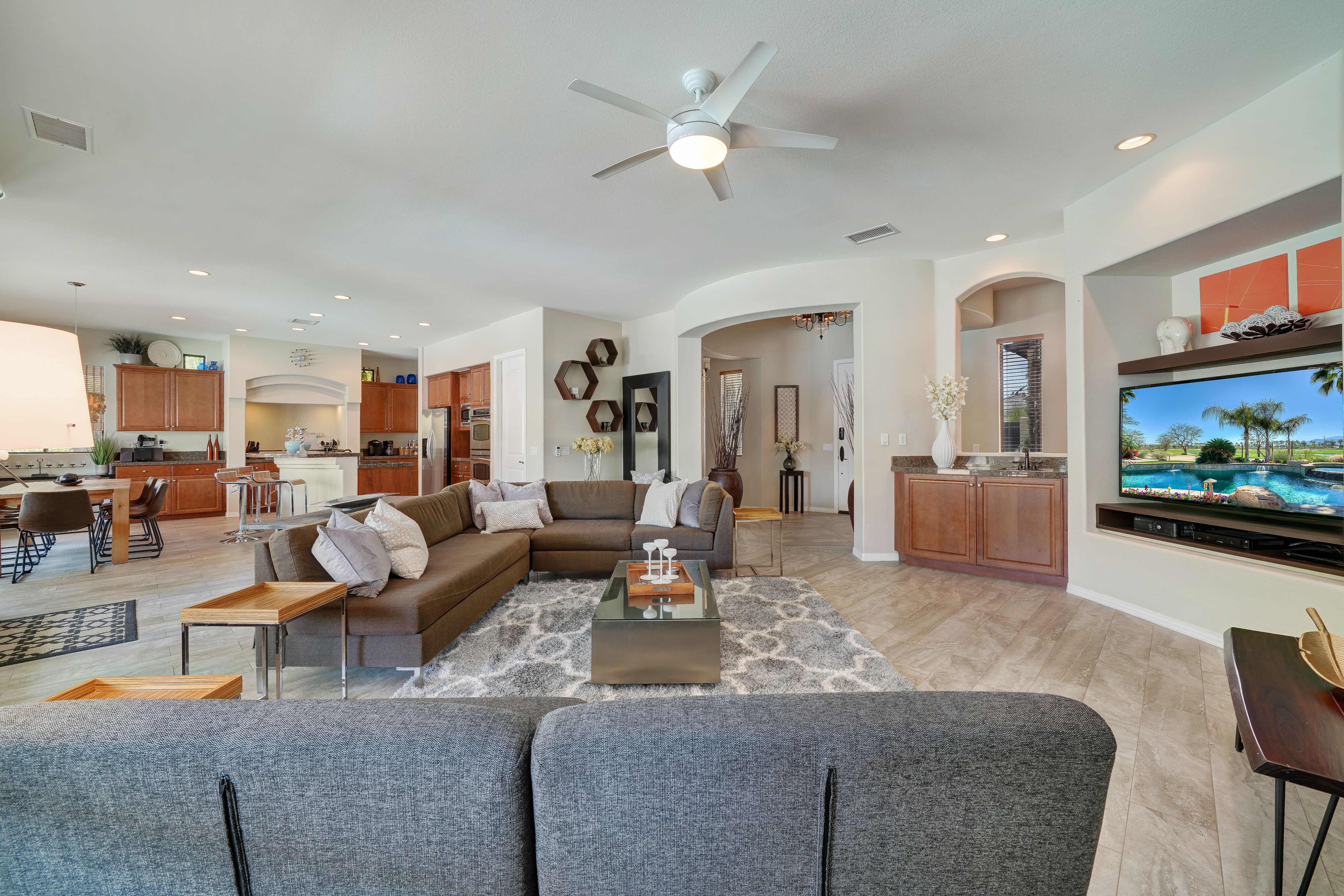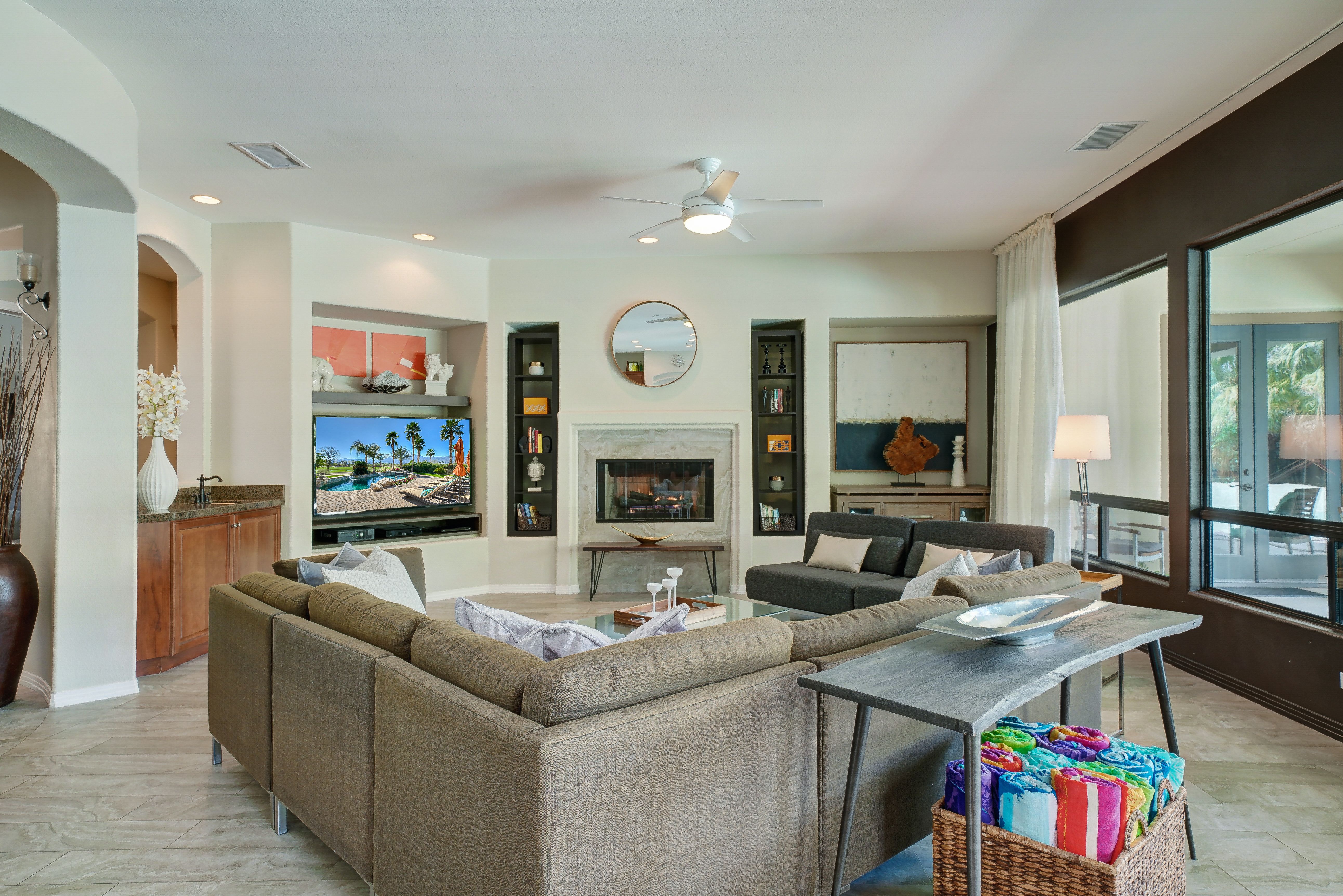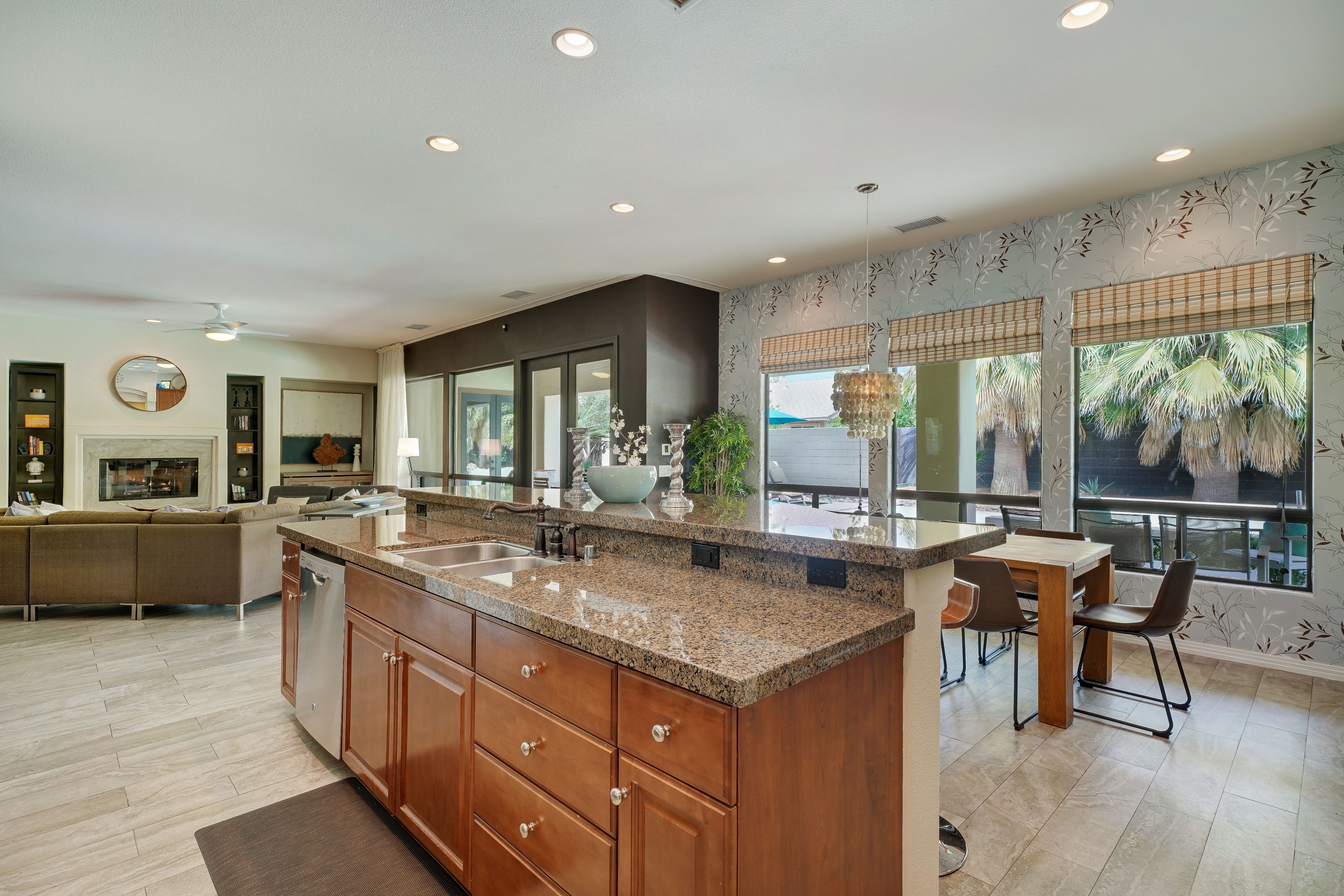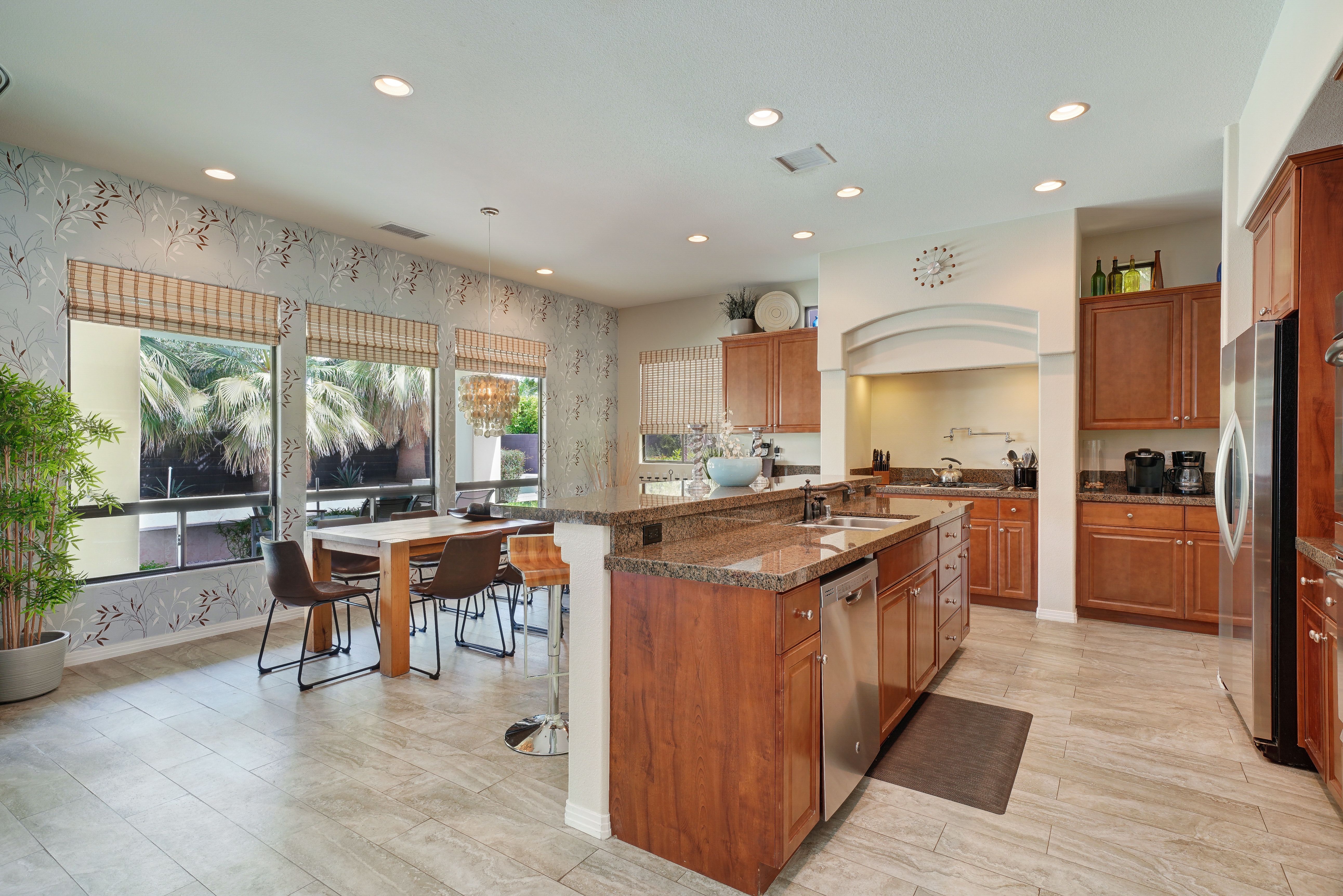Nestled in the heart of the Coachella Valley, this home is full of European charm but with stunning views of the Californian mountains. If you’re here to experience the Cali lifestyle, The Encore is the perfect desert base. But if you’re here for a relaxing escape from reality, this home has everything you need without ever leaving its grounds. We love the large saltwater pool, which has water jets and a removable volleyball net to keep the kids entertained, as well as a tanning area and hot tub for the adults. Start your days here with a yoga flow on the garden’s lush grass, then end your days around the fire pit and dining alfresco with food you prepared on the barbeque.
