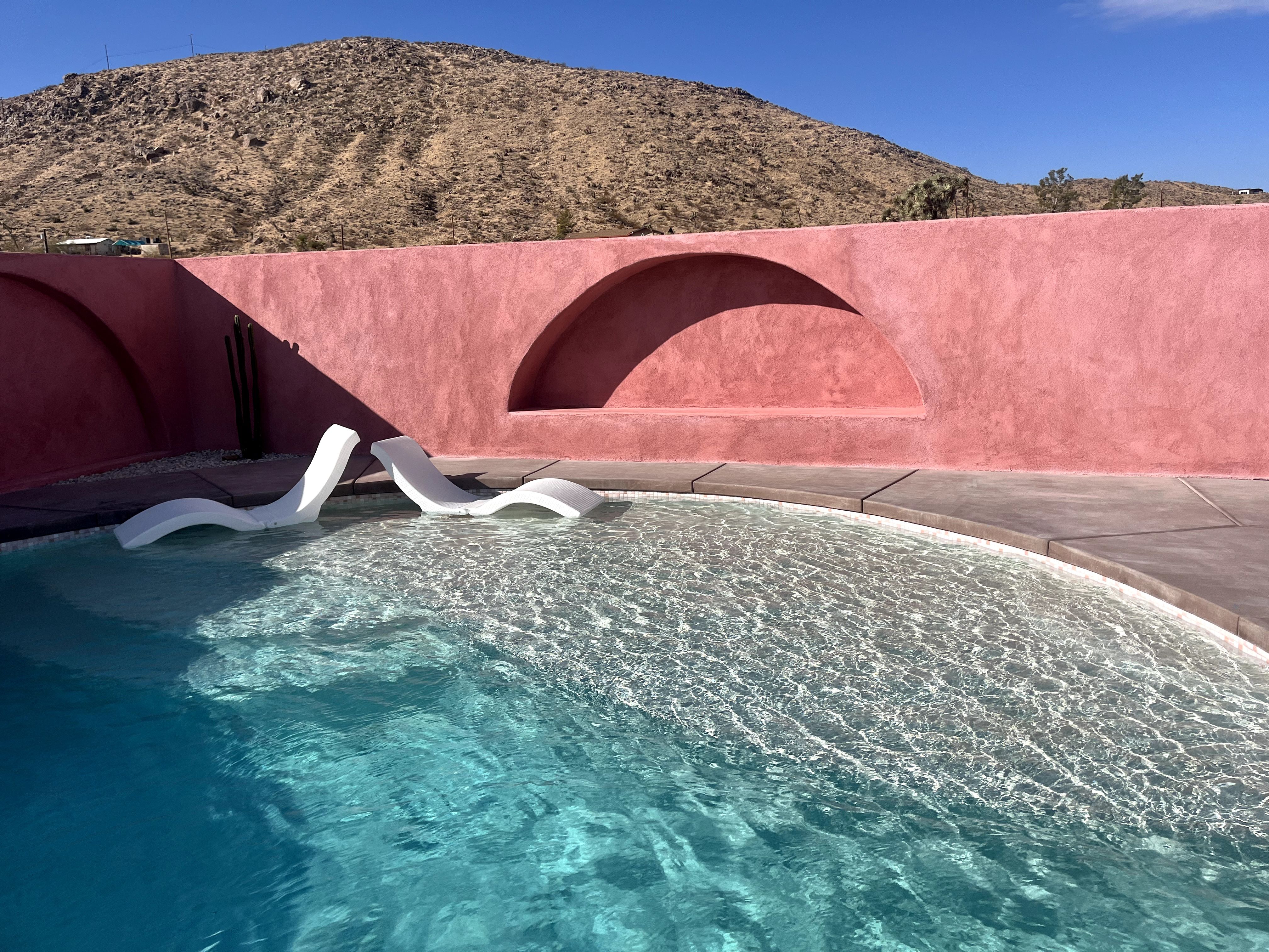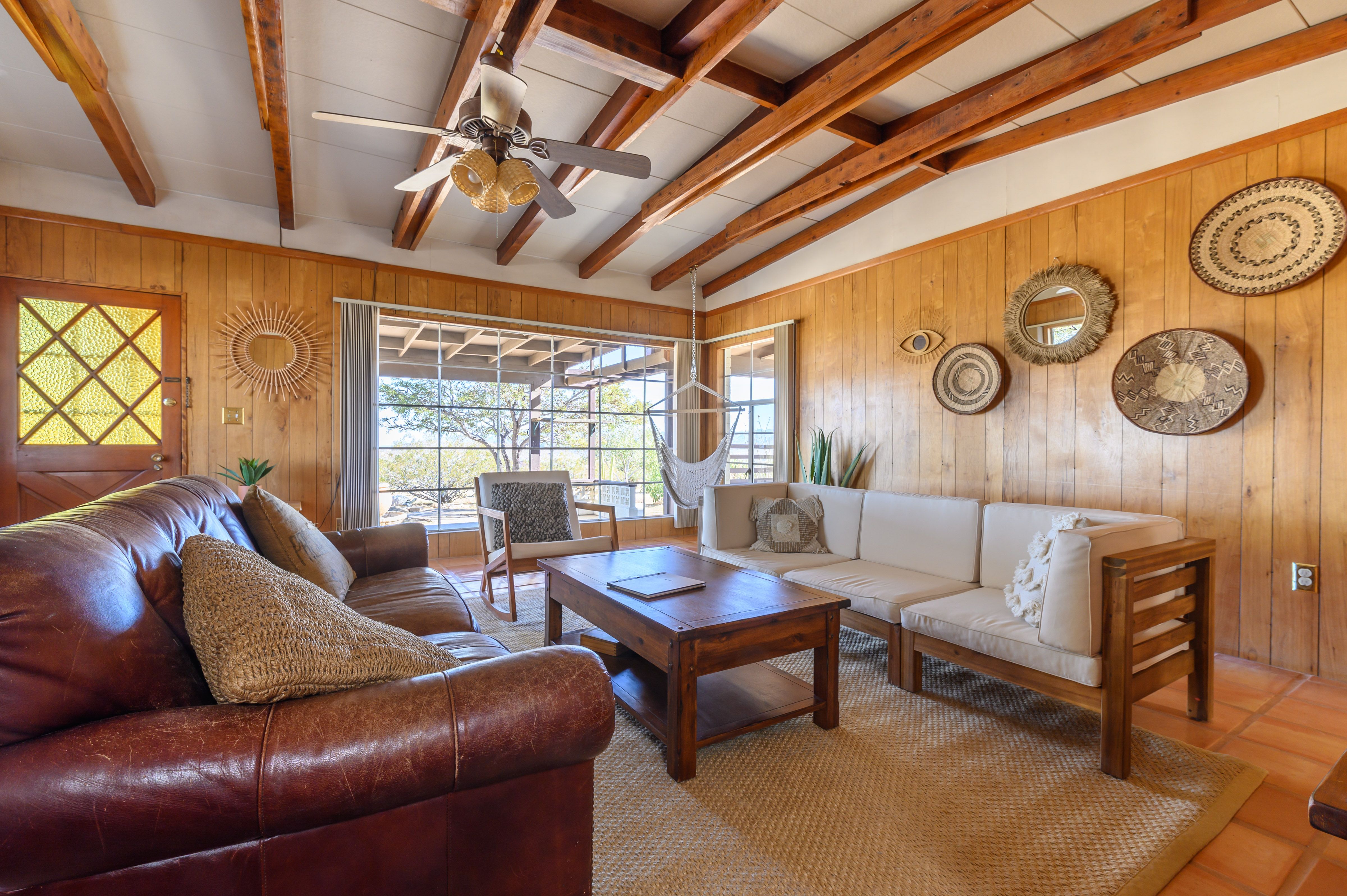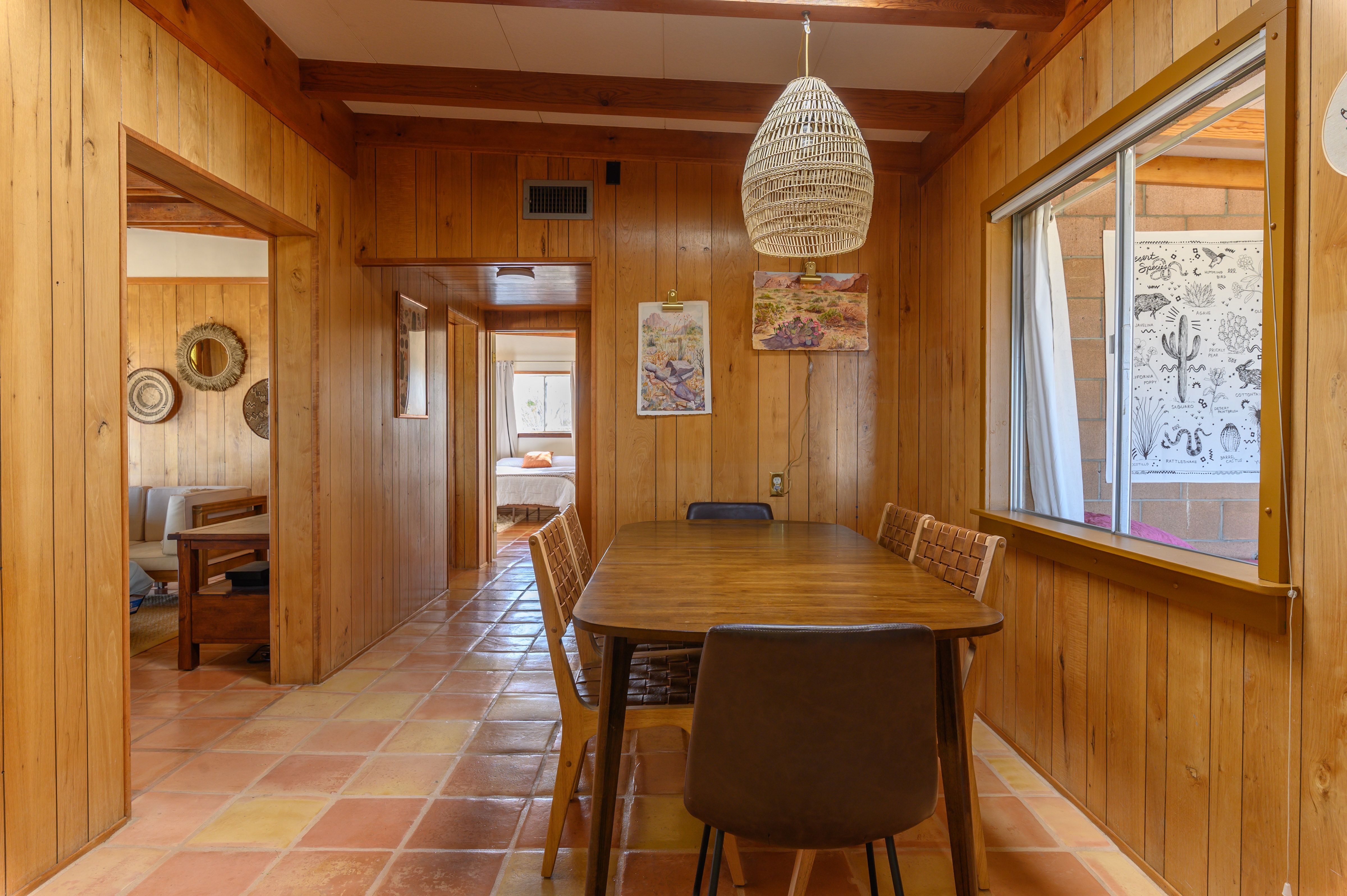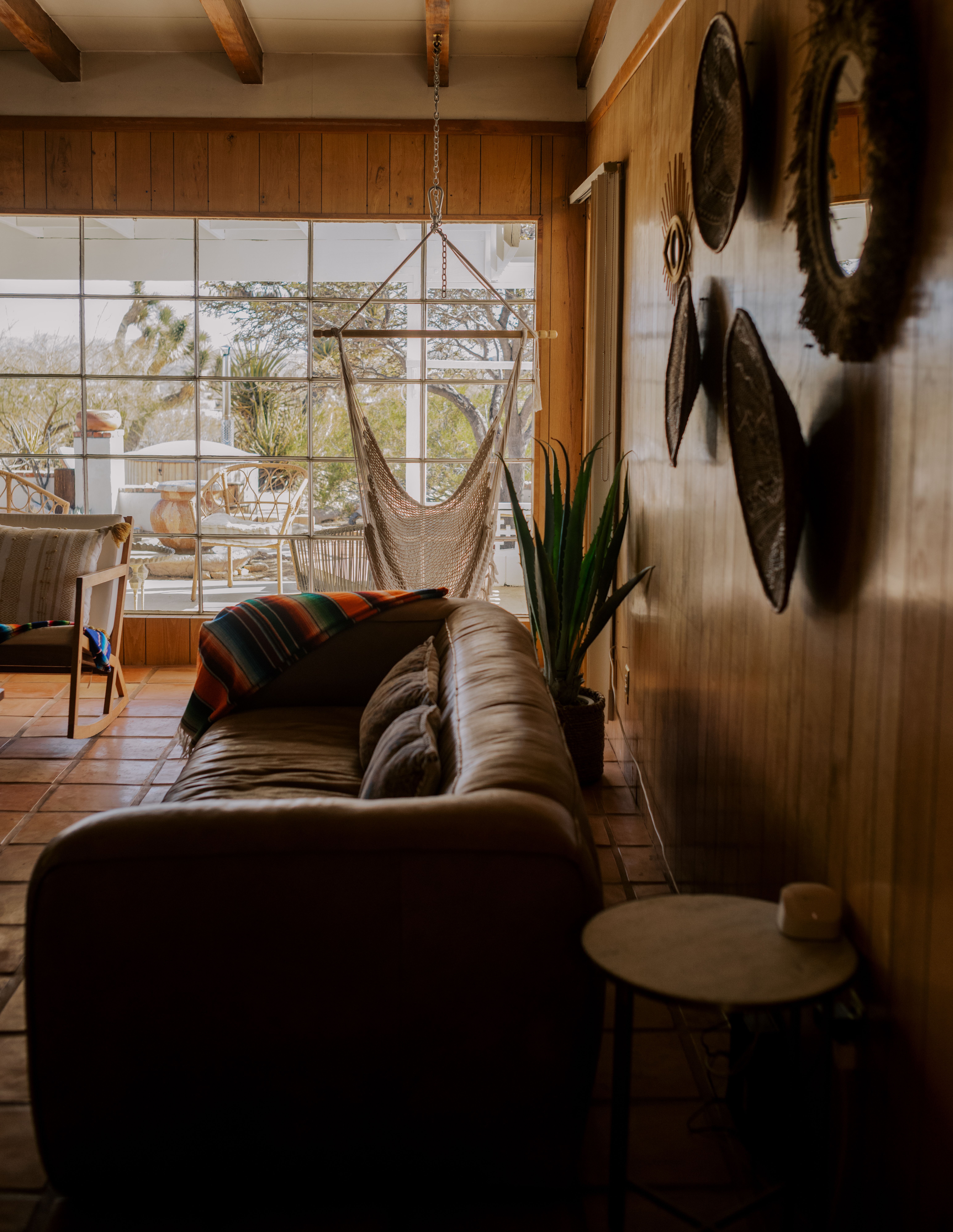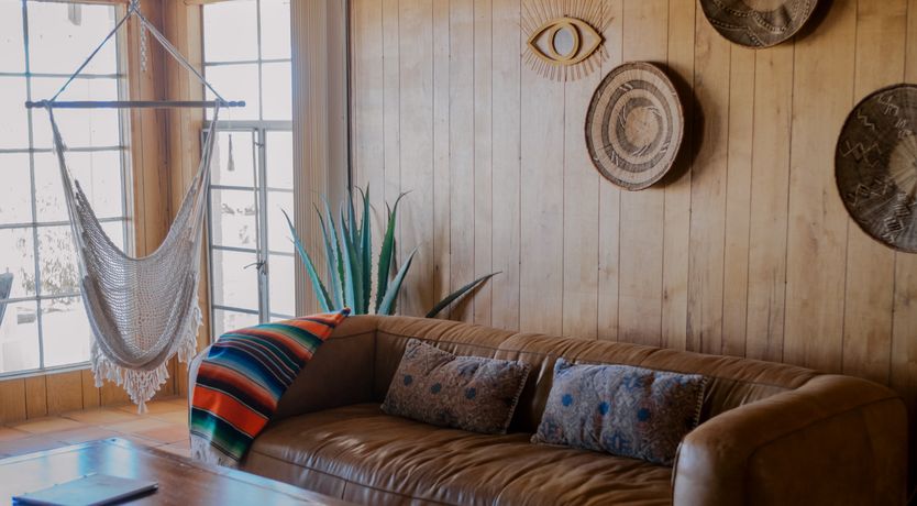 There are cacti, desert and mountain views aplenty in this fabulous home in the heart of the Yucca Valley. Just over six kilometres from the Joshua Tree Visitor Centres and nearby cafes, and even closer to the nearest desert museum, you get the full Joshua Tree experience without being completely cut off from civilisation. The house is set on a five-acre plot and decorated in the laid-back and comfortable style you'd expect. While the home is equipped with all the usual mod cons, it's retained plenty of quaint charm with wood-panelled walls, a record player and retro games console sitting alongside a lightning-fast internet connection and various streaming options. There's also a separate casita ideal for couples. We loved the wicker mirrors, wall hangings, hammock-style hanging seats and the peaceful, minimalist bedroom interiors. Outside you'll find a wood-fired hot tub ideal for chilly evenings and a pink stucco in-ground pool for afternoons. When you're not neck-deep in water, the wooden seating area and firepit is a perfect place to admire the pink and red sunset skies.