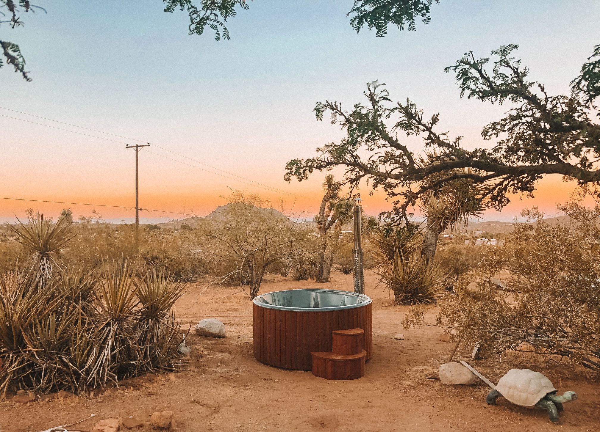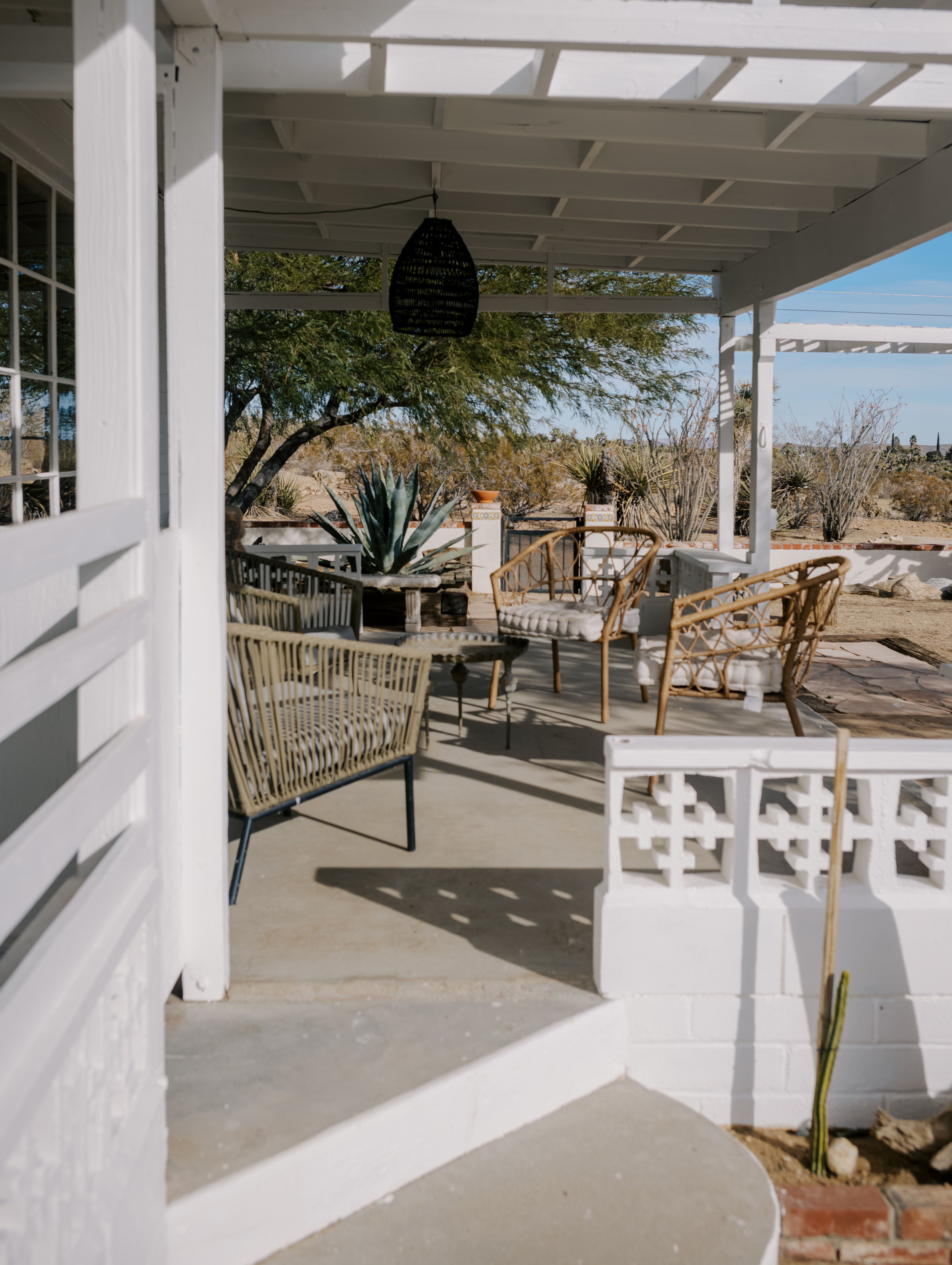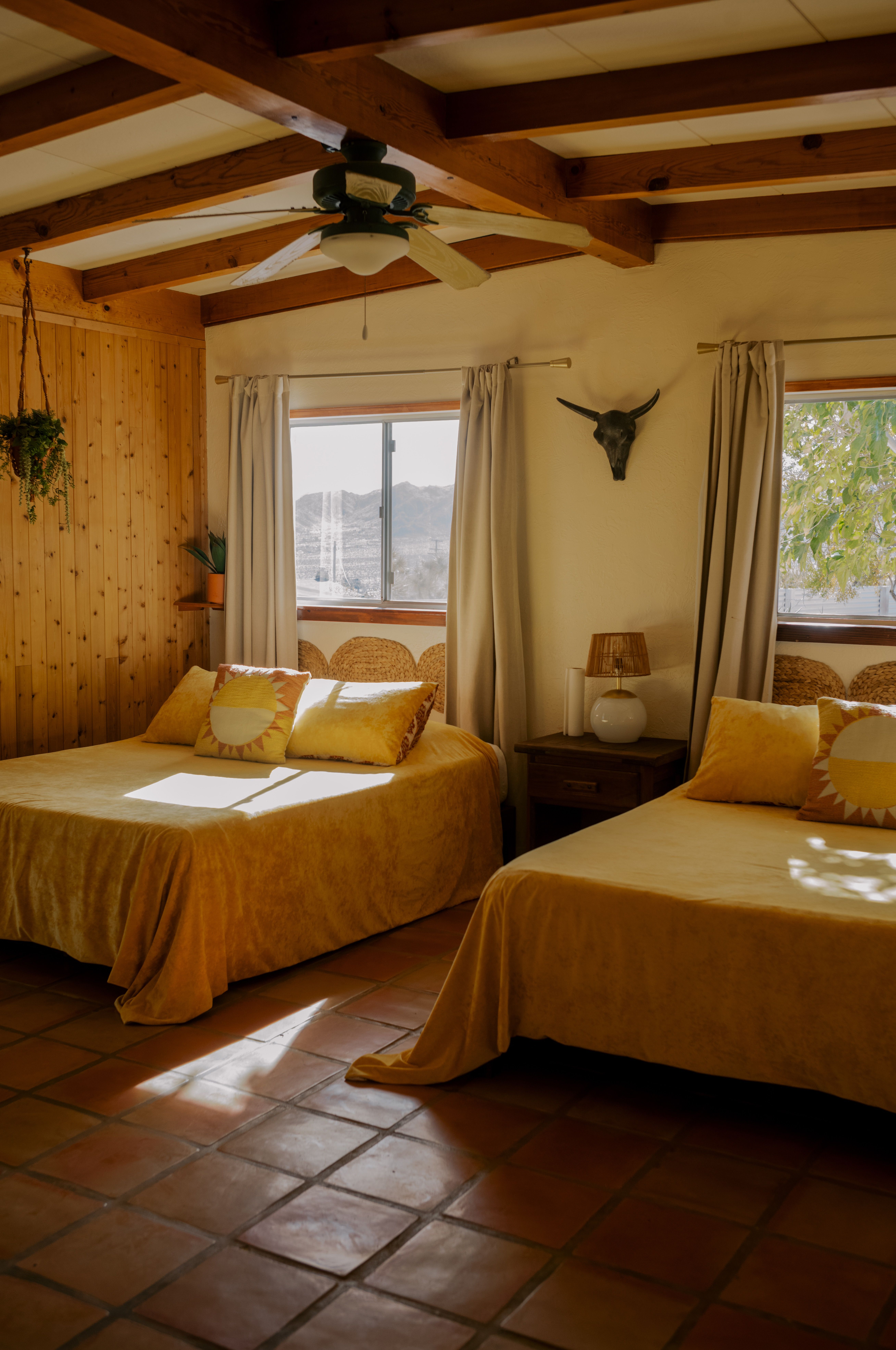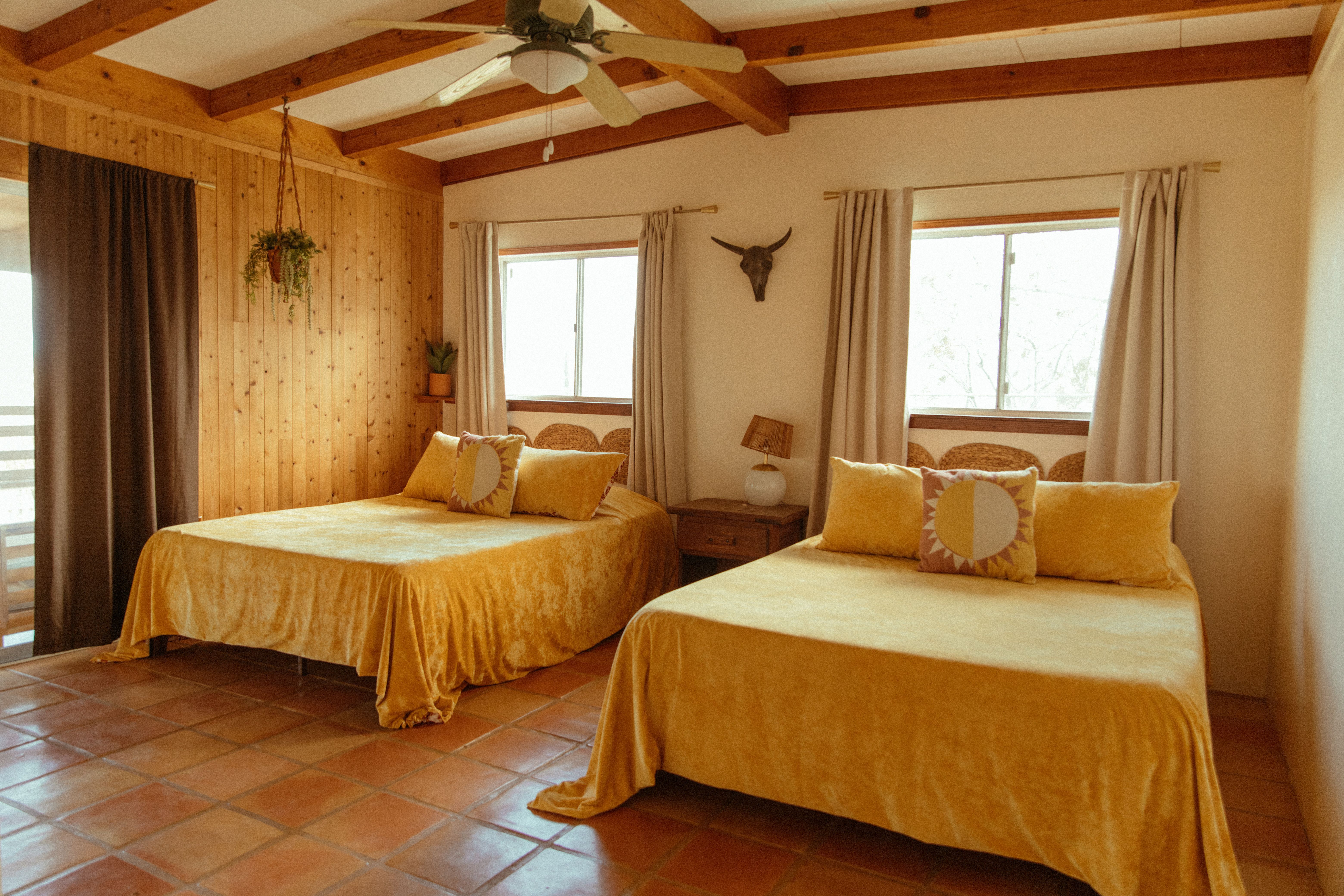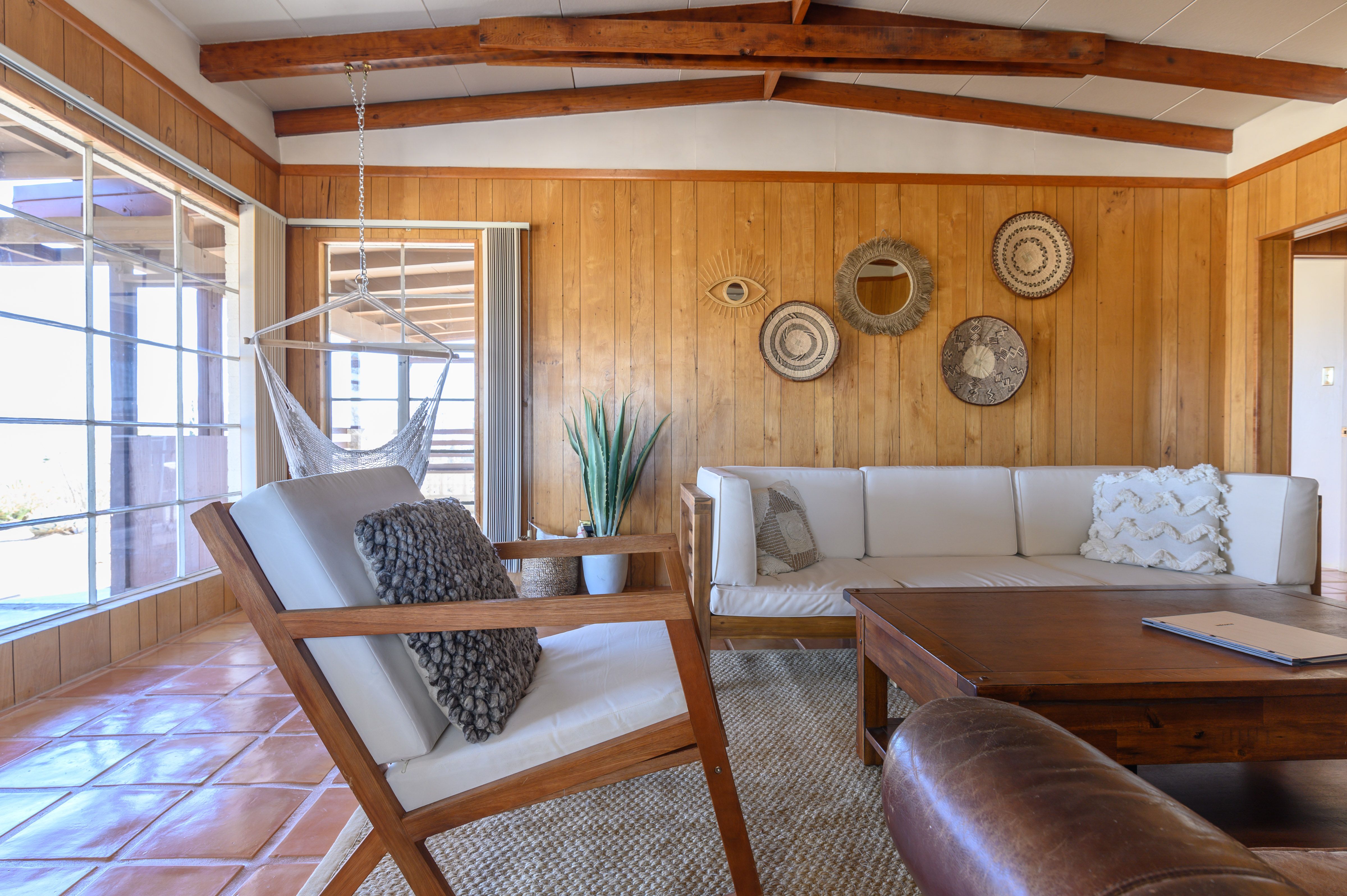 There are cacti, desert and mountain views aplenty in this fabulous home in the heart of the Yucca Valley. Just over six kilometres from the Joshua Tree Visitor Centres and nearby cafes, and even closer to the nearest desert museum, you get the full Joshua Tree experience without being completely cut off from civilisation. The house is set on a five-acre plot and decorated in the laid-back and comfortable style you'd expect. While the home is equipped with all the usual mod cons, it's retained plenty of quaint charm with wood-panelled walls, a record player and retro games console sitting alongside a lightning-fast internet connection and various streaming options. There's also a separate casita ideal for couples. We loved the wicker mirrors, wall hangings, hammock-style hanging seats and the peaceful, minimalist bedroom interiors. Outside you'll find a wood-fired hot tub ideal for chilly evenings and a pink stucco in-ground pool for afternoons. When you're not neck-deep in water, the wooden seating area and firepit is a perfect place to admire the pink and red sunset skies.