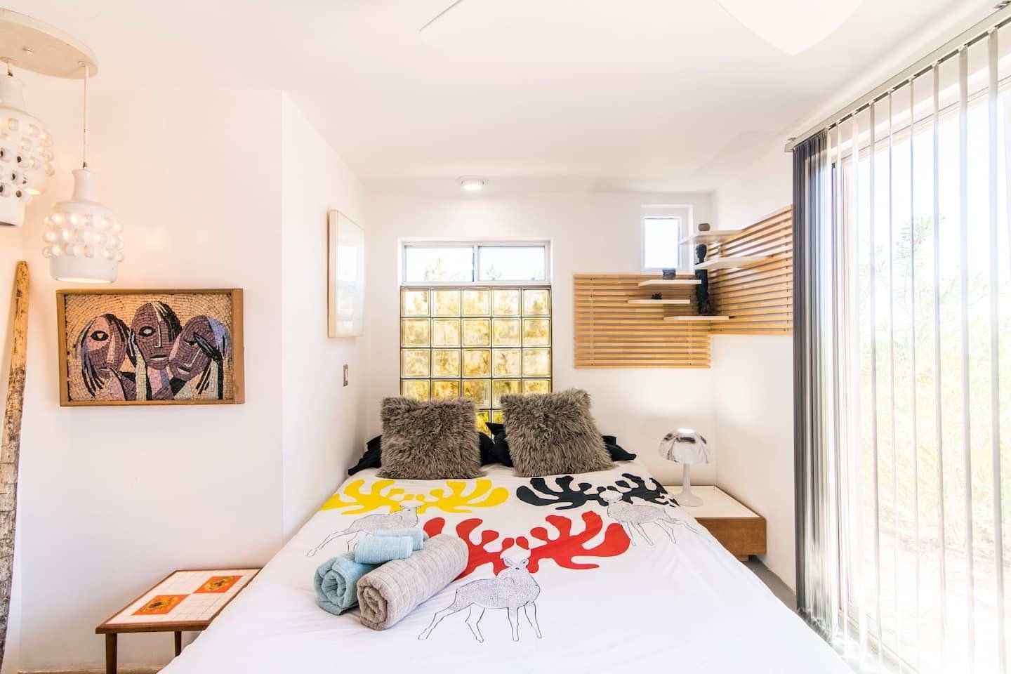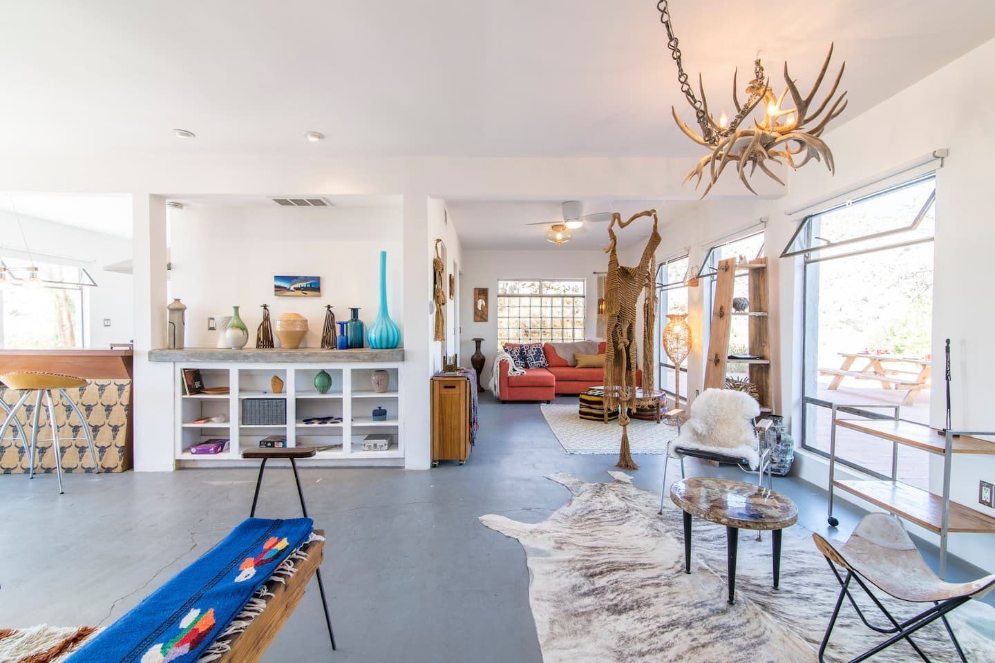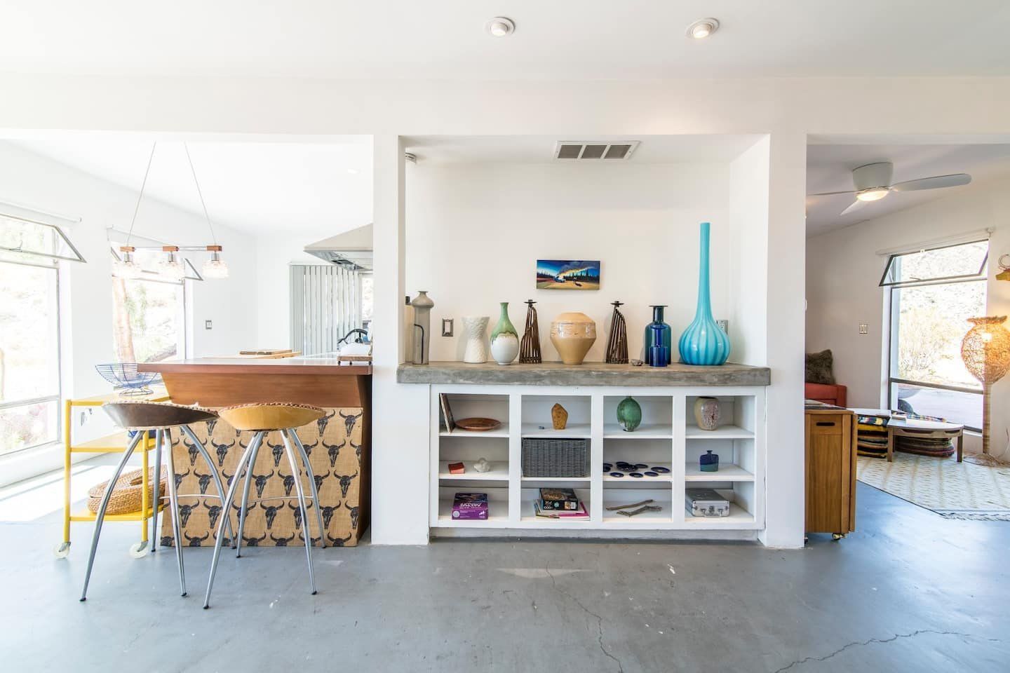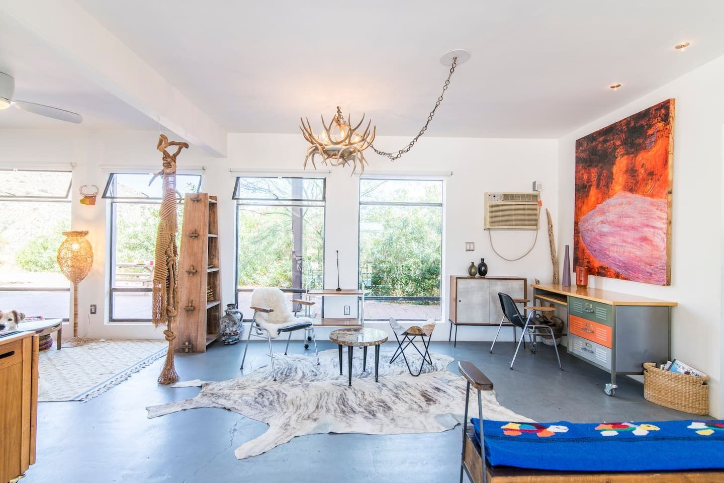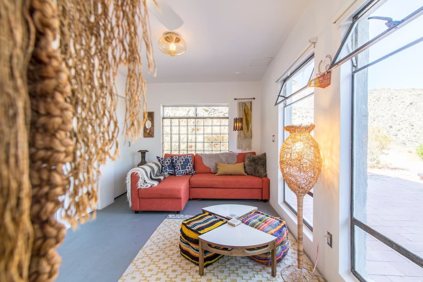 The original design prototype had a pioneering metal canopy system, with canvas curtains which used to completely close around the house – which explains the oversized roof. It’s still a totally unique space today, with huge windows flooding the rooms with warm light. The interior has been carefully curated to spark inspiration, with a bohemian mix of canvases, ceramics and macramé artworks. But with all the arty vibes, there is still plenty of space to snuggle up and enjoy relaxing, comfy evenings and movie nights. Should the chill of the desert night catch you by surprise, there is a fireplace for extra cosiness.