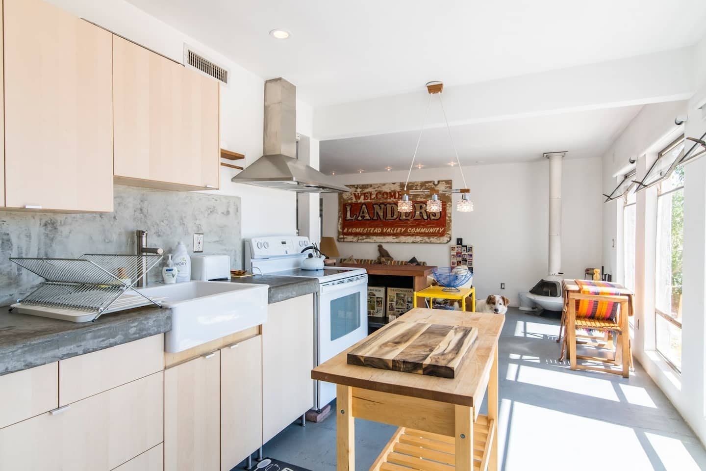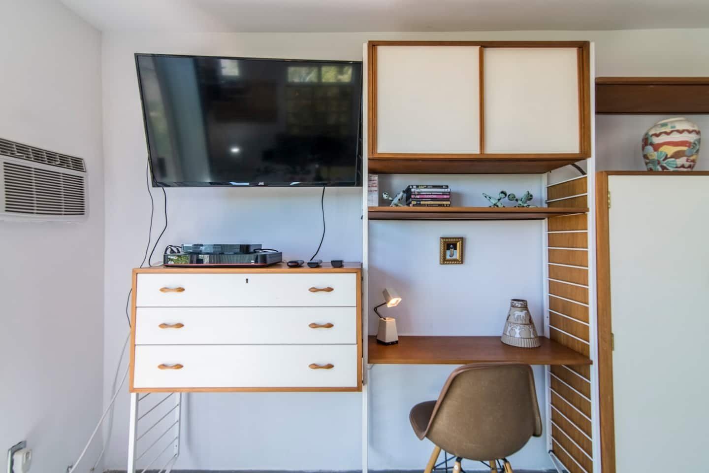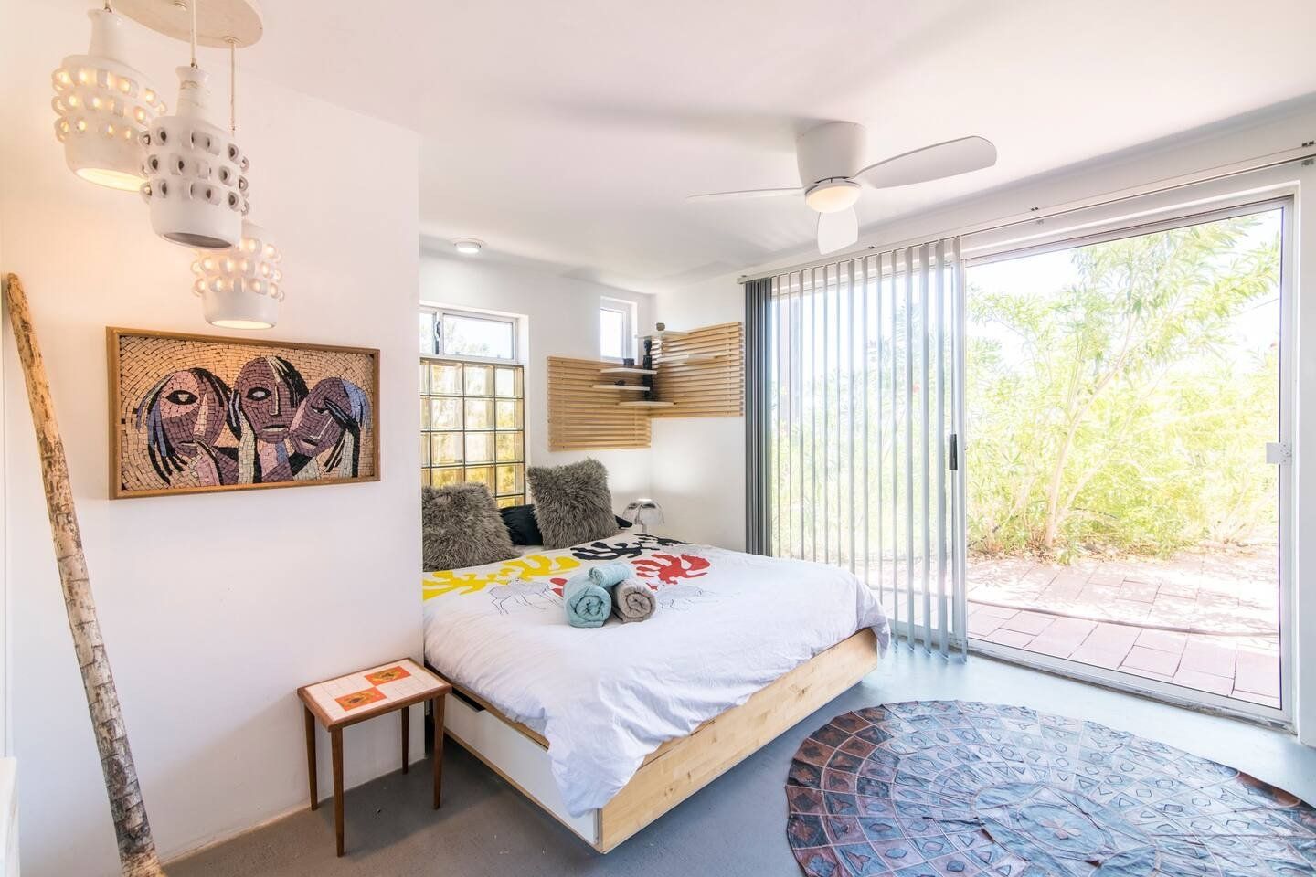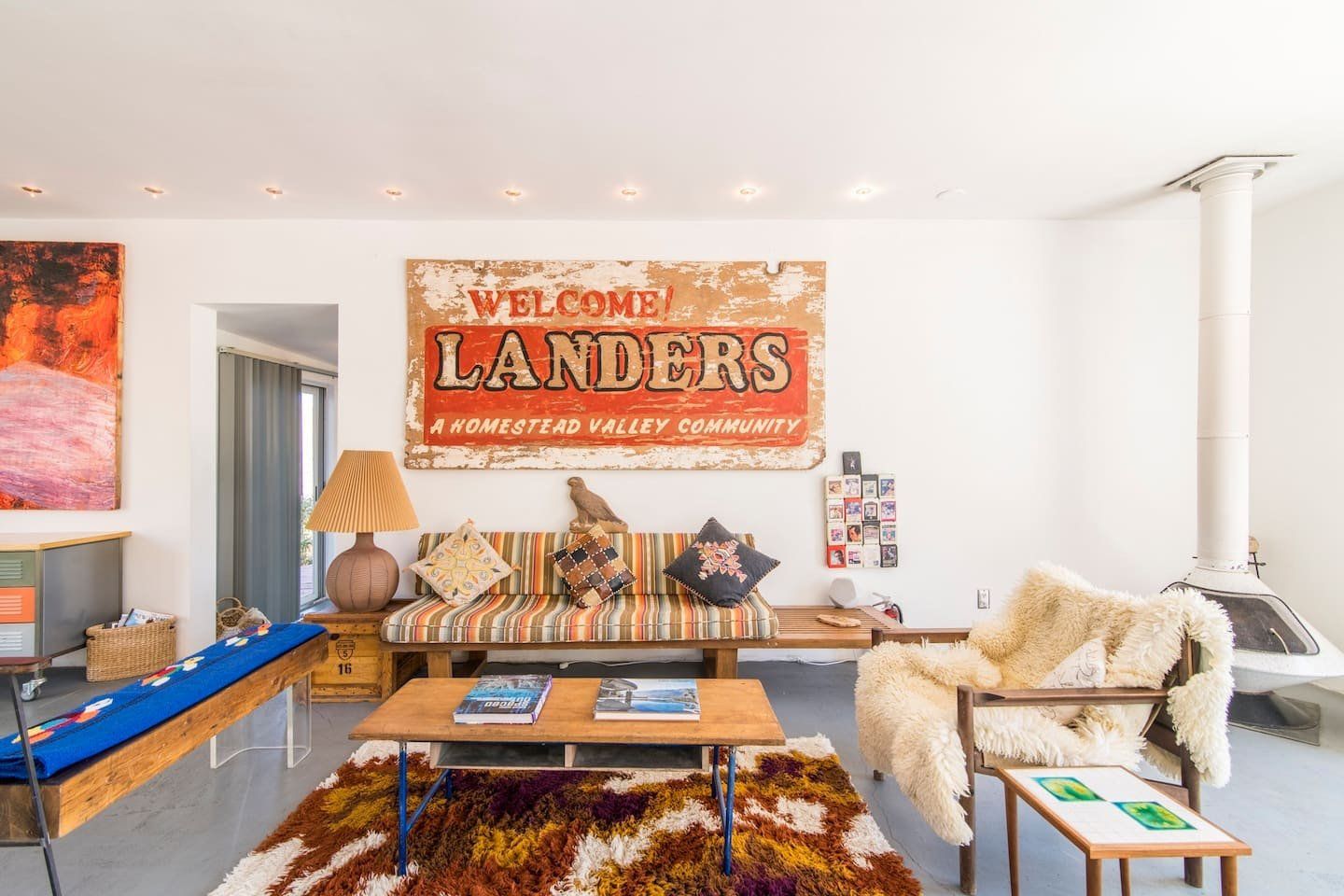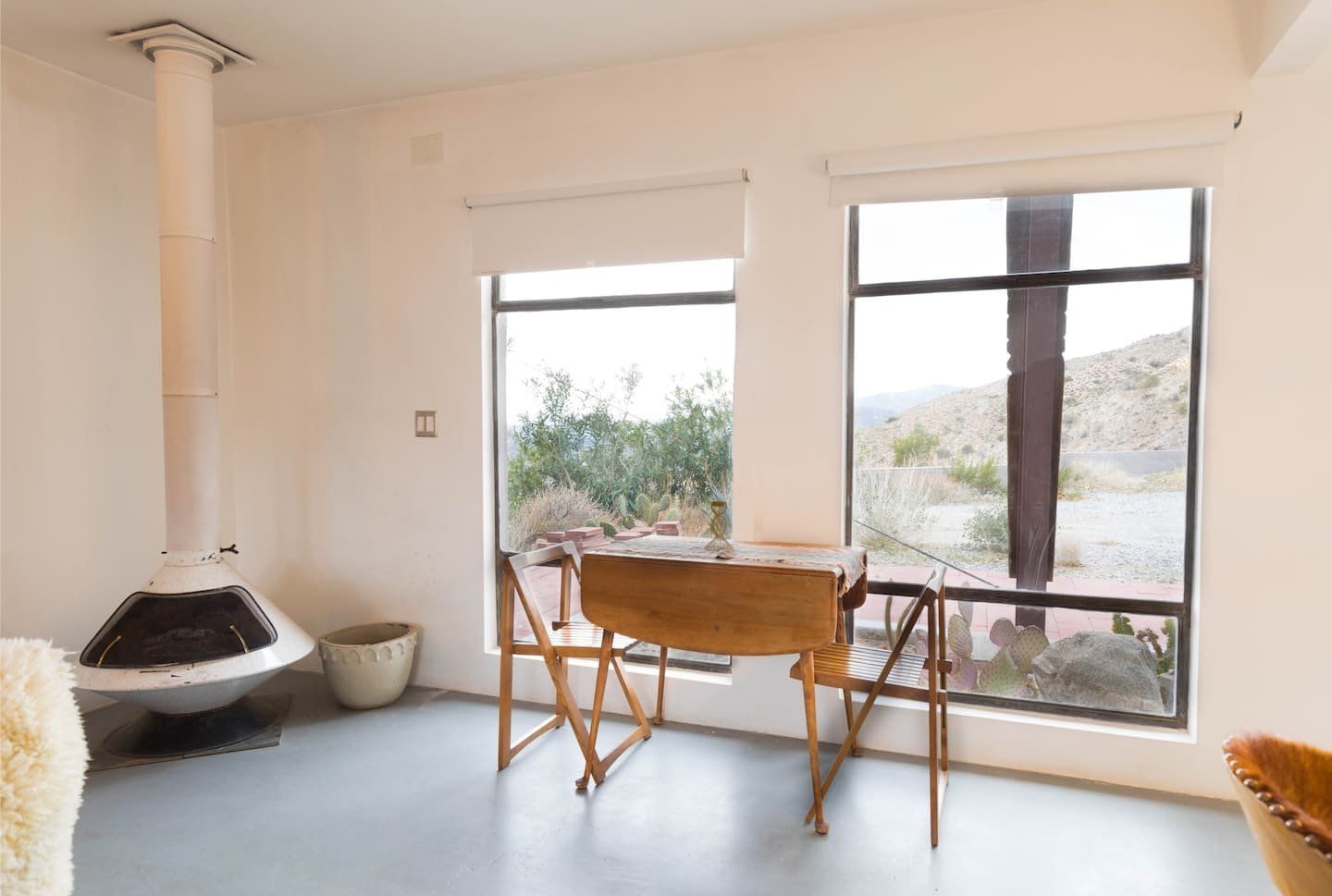 The original design prototype had a pioneering metal canopy system, with canvas curtains which used to completely close around the house – which explains the oversized roof. It’s still a totally unique space today, with huge windows flooding the rooms with warm light. The interior has been carefully curated to spark inspiration, with a bohemian mix of canvases, ceramics and macramé artworks. But with all the arty vibes, there is still plenty of space to snuggle up and enjoy relaxing, comfy evenings and movie nights. Should the chill of the desert night catch you by surprise, there is a fireplace for extra cosiness.