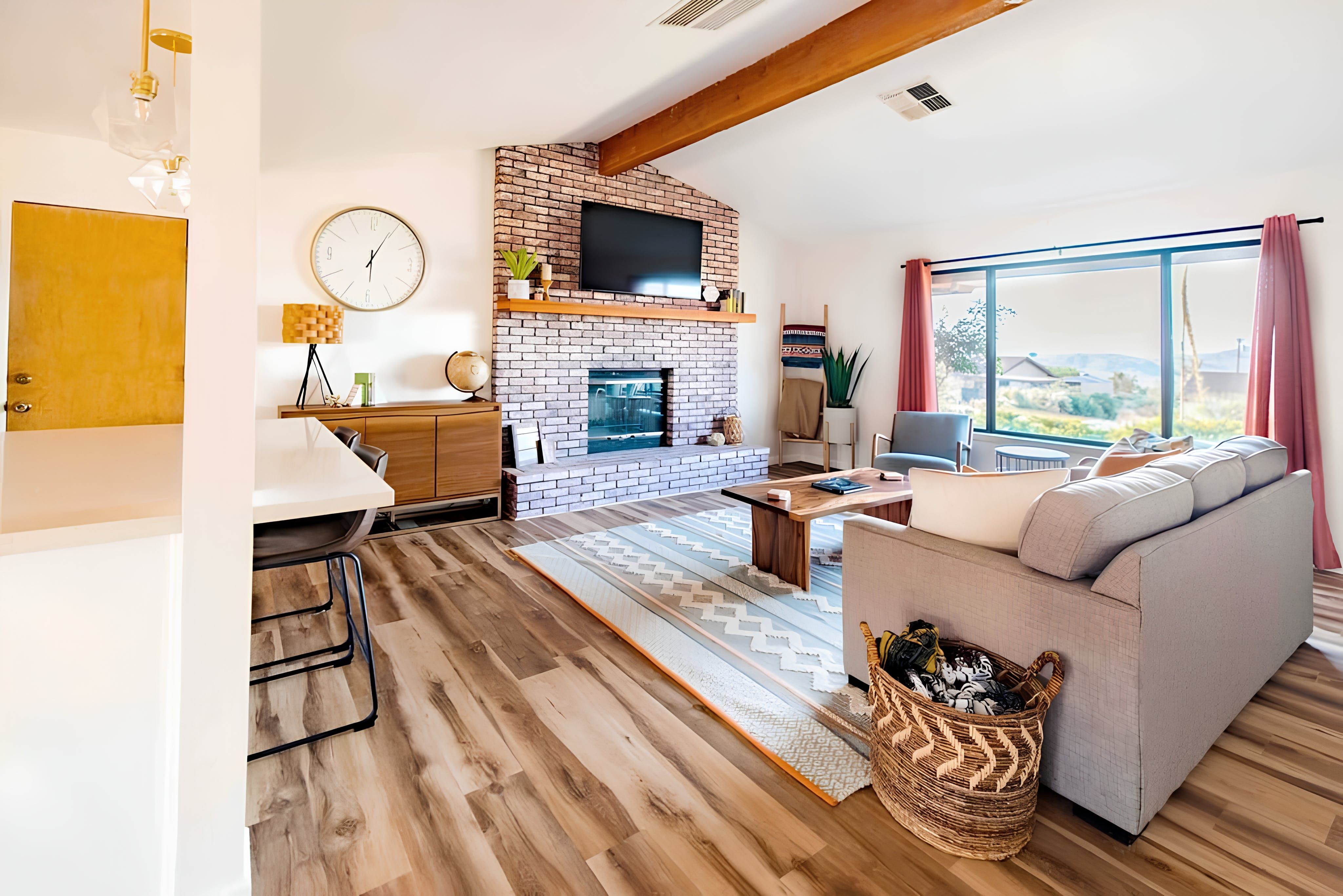 This desert retreat is located just 4 miles from Joshua Tree National Park and a thirty-minute drive from Palm Springs. It offers a peaceful atmosphere and stunning views of the surrounding landscape. You can immerse yourself in the tranquillity of the desert while relaxing in the outdoor gazebo or enjoying a refreshing dip in the cowboy pool. There’s a hot tub here as well –unwind here with a glass of wine at sunset. Inside, you'll find a large open-plan living area, perfect for spending quality time with family or friends. Experience the magic of Joshua Tree at this little oasis.