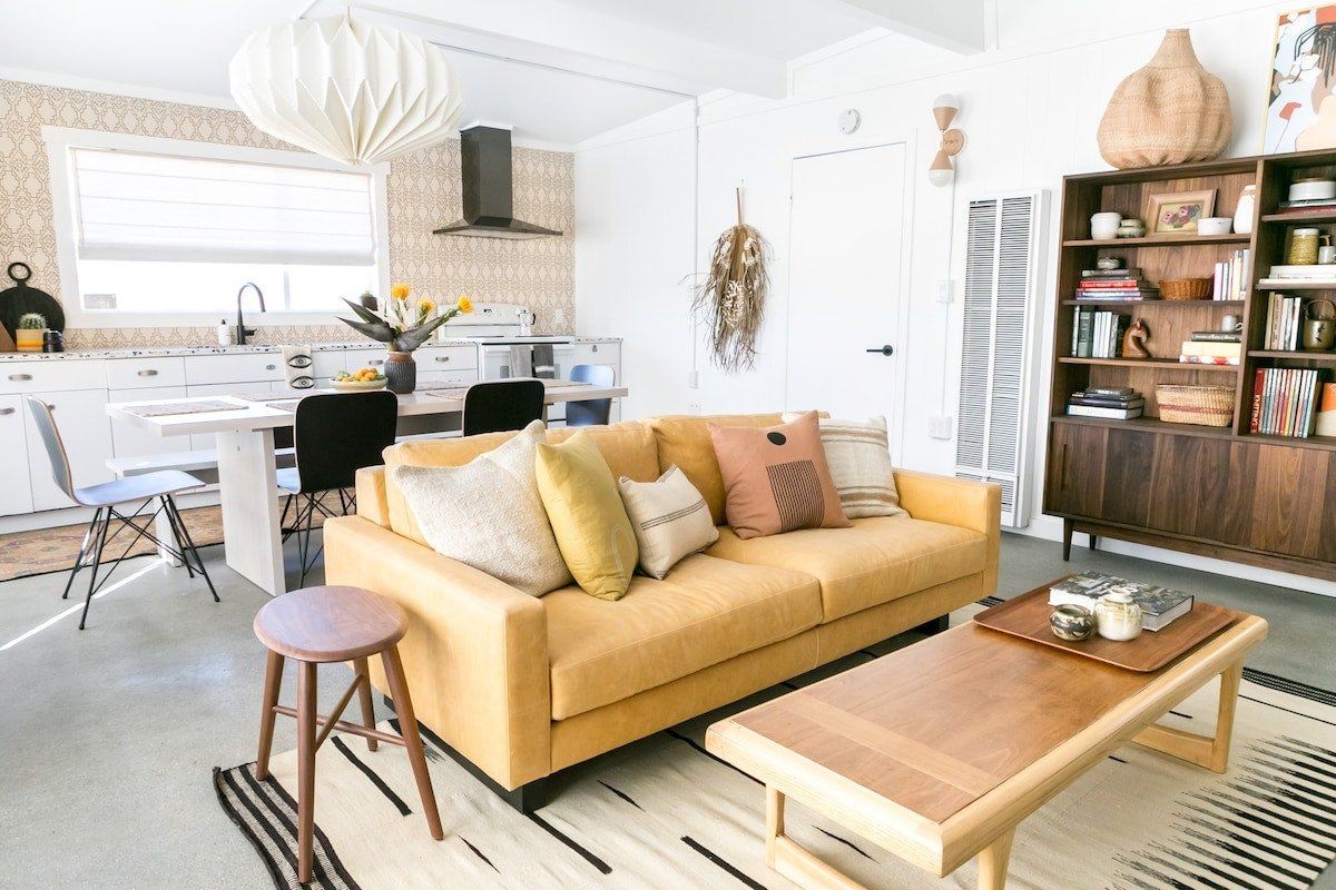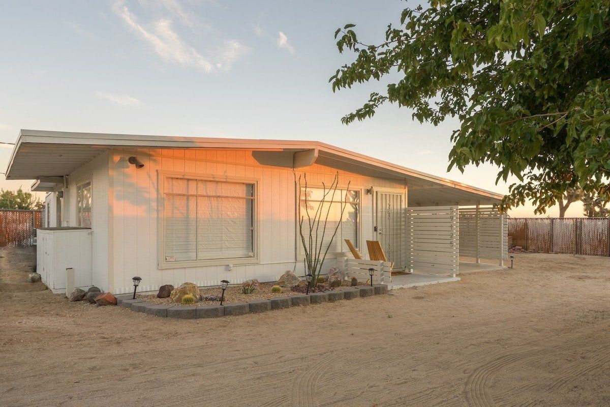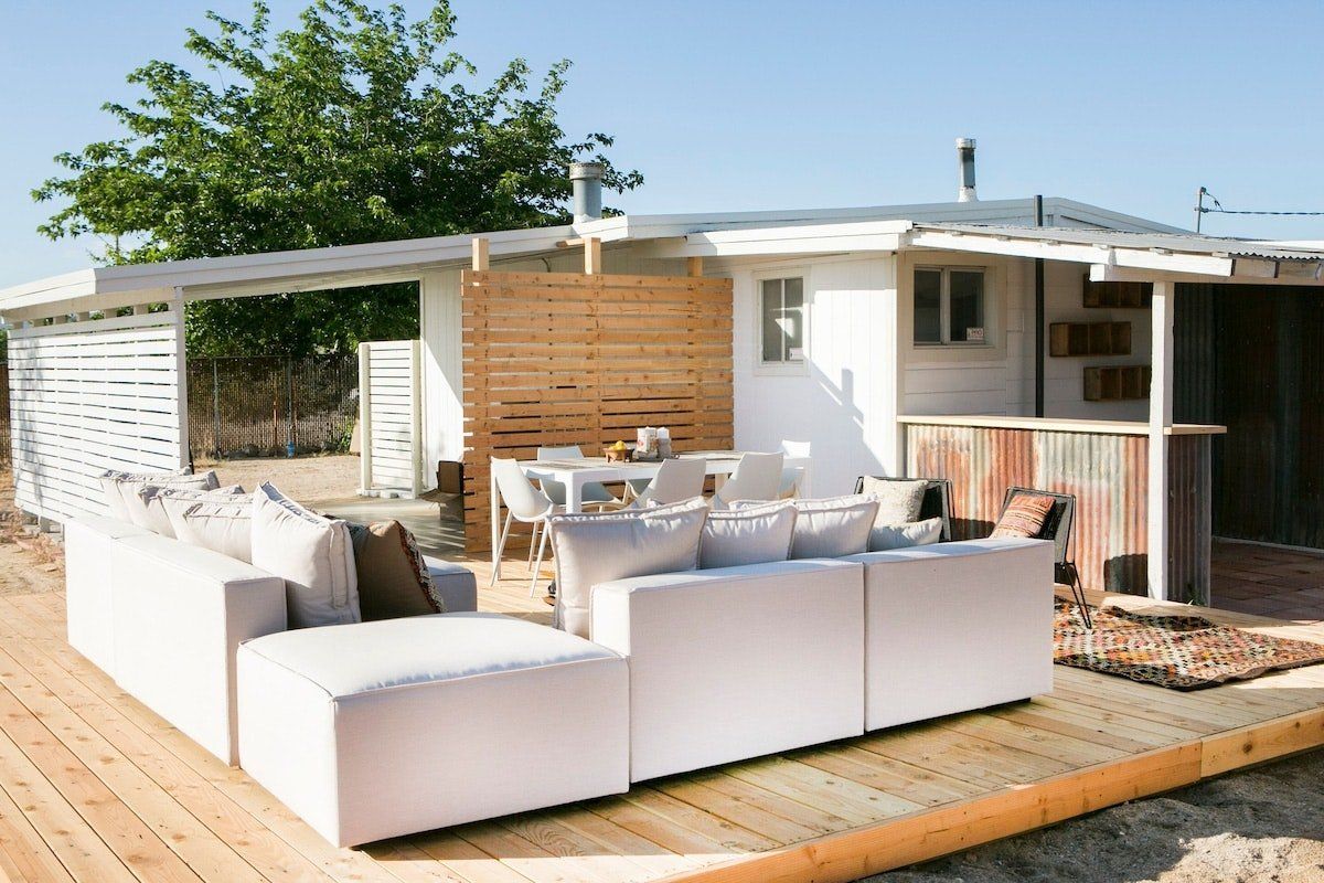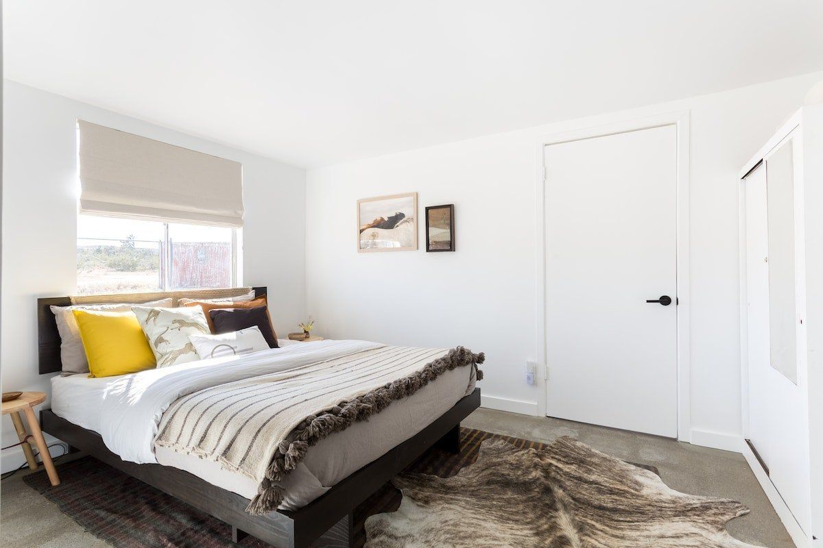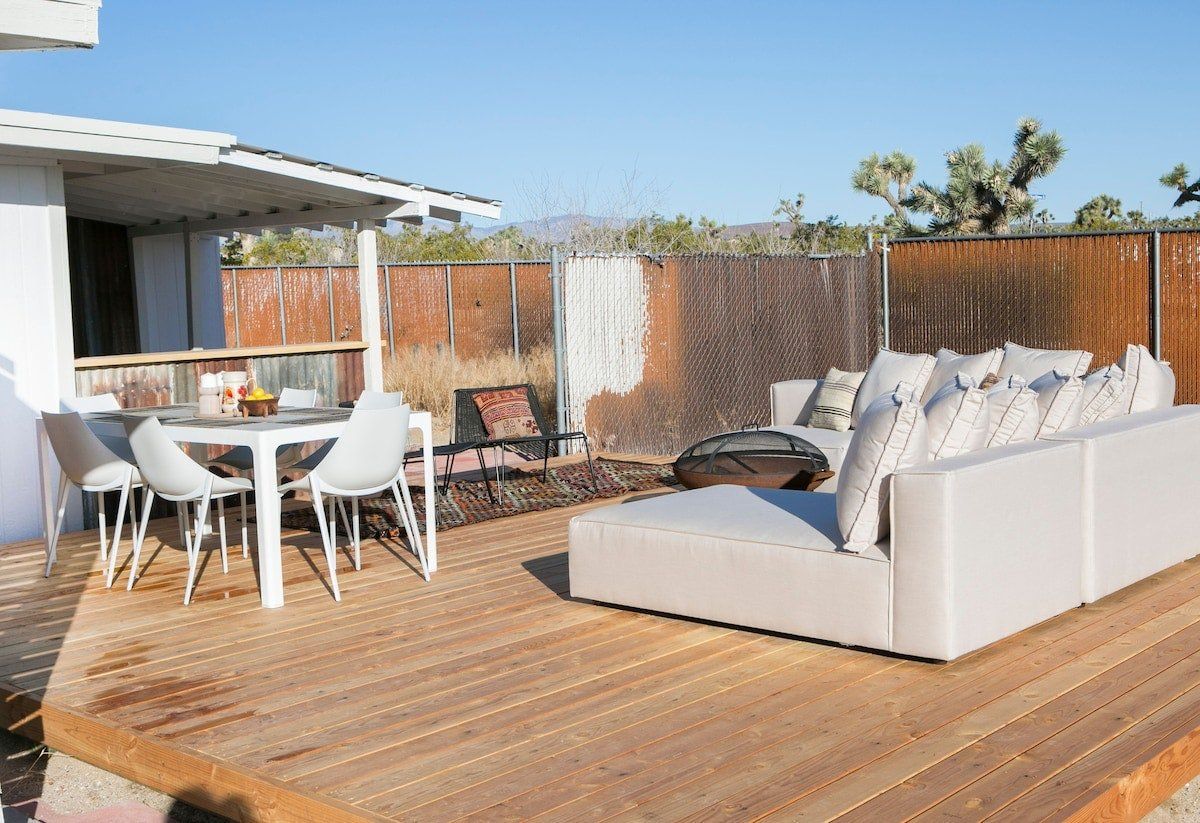 Mid-century modern meets boho chic at this cabin in the heart of the Yucca Valley. From the tile backsplash and terrazzo worktops in the kitchen to the concrete flooring and exposed brick around the Franklin stove, we love how the design honours the home’s retro roots in a modern way. We like all the personal touches, too — such as the vinyl record player and Public Goods toiletries. Our favourite bit, though, has to be the backyard. It's essentially a second living space, with a large sectional sofa, six-seater dining table, and cosy fire pit to enjoy. We can just imagine whiling away the evenings out there, watching the unforgettable desert sunset, chatting around the fire, or dining under the stars. Joshua Tree National Park is just a 15-minute drive away and is perfect for outdoor enthusiasts wanting to hike, cycle, or even horseback ride. Culture vultures will love the area's selection of art galleries and vineyards, too. No matter how you spend your day, we know you'll love coming home and unwinding at this unique desert hideaway.