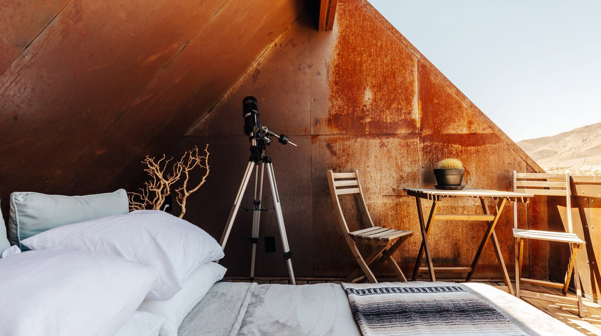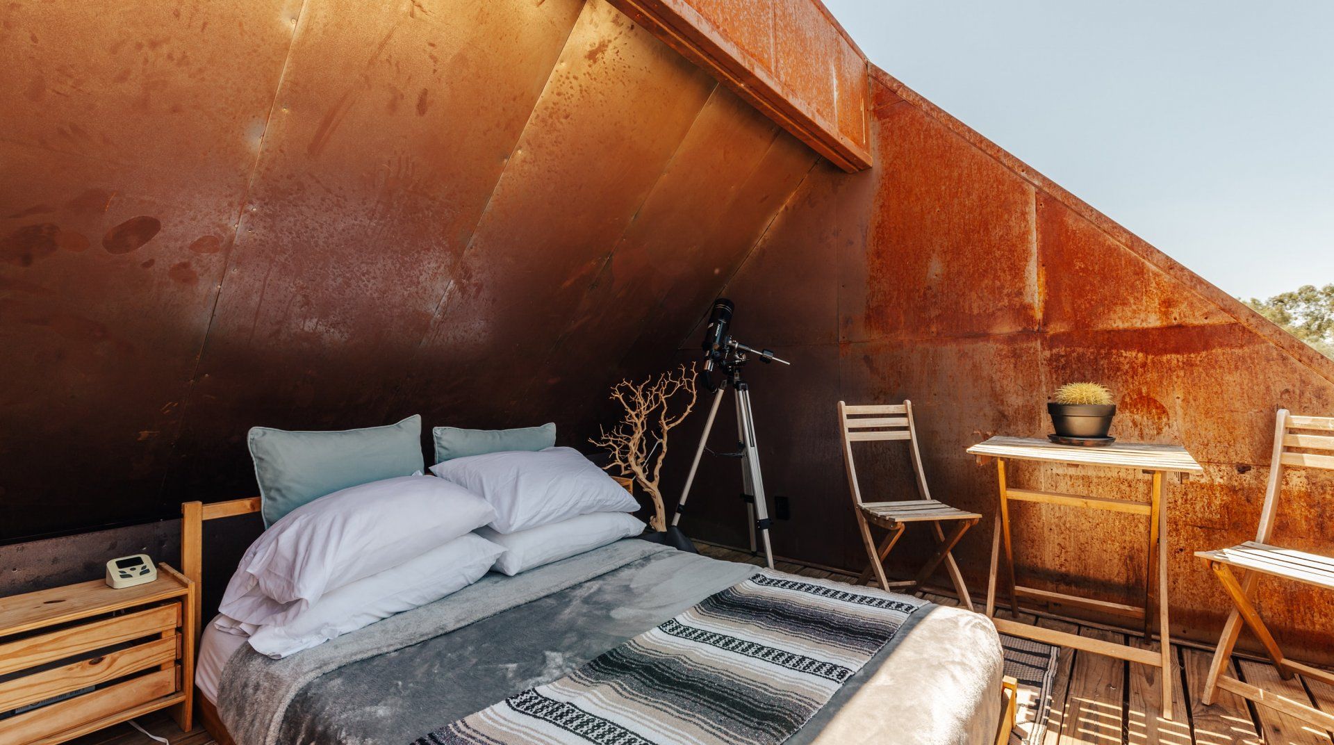 When architect, Malek Alqadi combined astute environmentalism with his exquisite taste, he didn't just create this home, he sparked a revolution in sustainable tourism. Set on the edge of the Joshua Tree National Park, guests take the lead in operating this clean yet luxurious off-grid space. Think serious stargazing sessions through a telescope, showering by a boulder, and falling asleep under the desert sky with a crackling fireplace at your feet—the second bedroom is open to the elements, with no walls or ceiling. And it's packed with technology too. You can measure your energy consumption, change your light settings and set cooling and heating temperatures of the space. Wrapped in salvaged weathering steel and up-cycled details, it raises the bar on stylish, conscious travel.