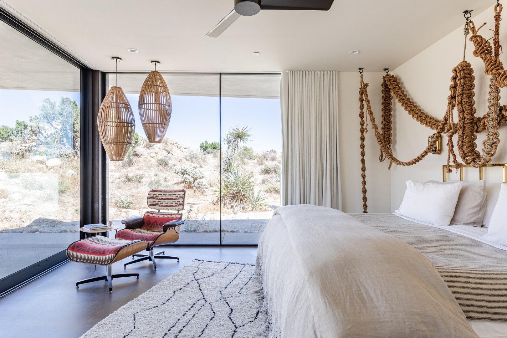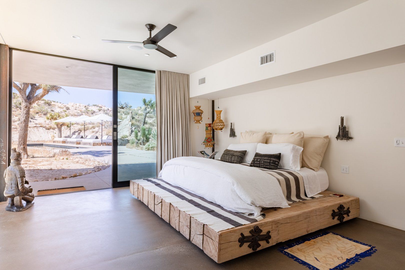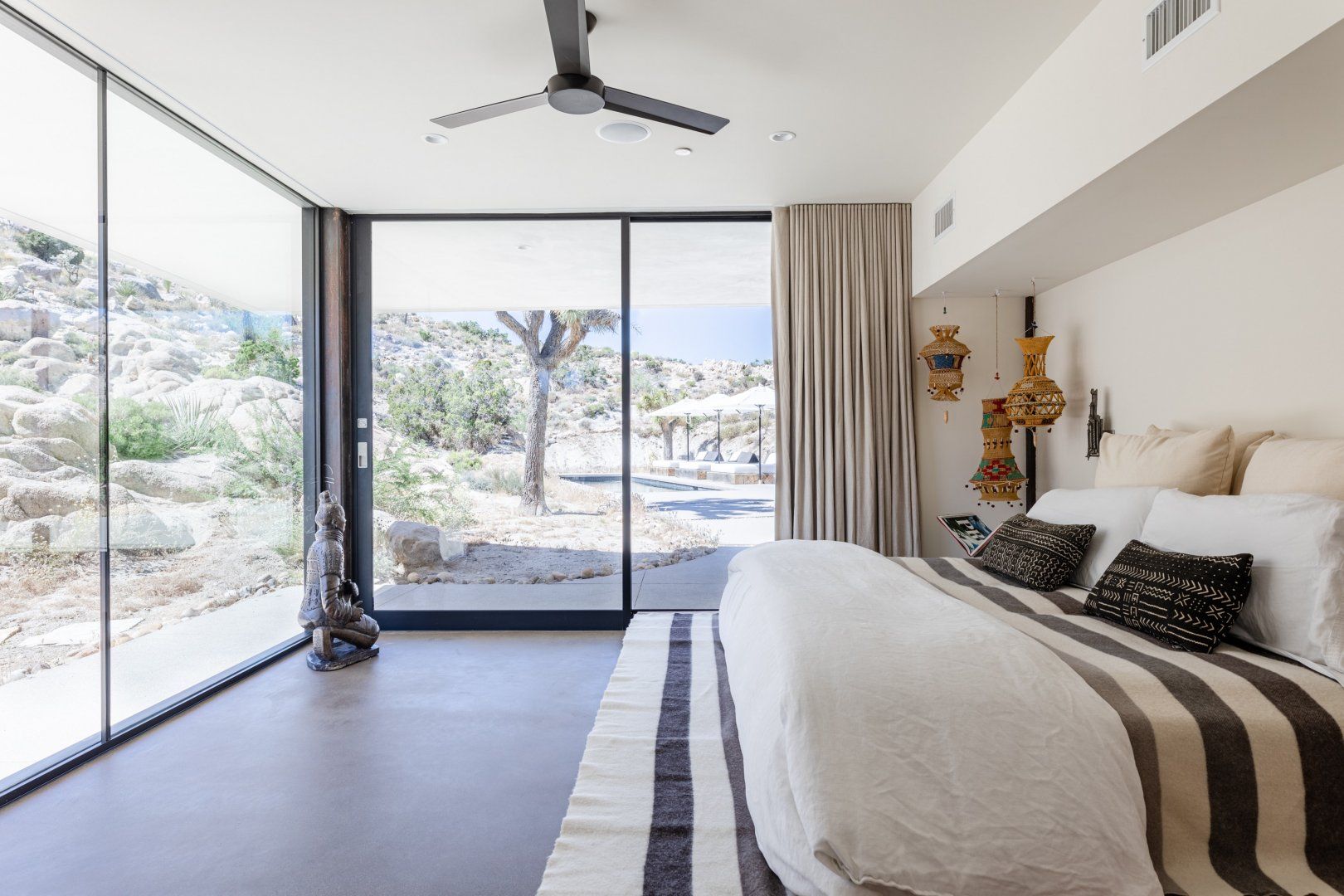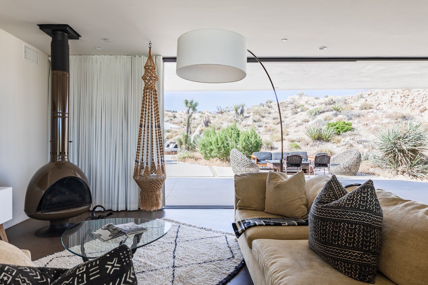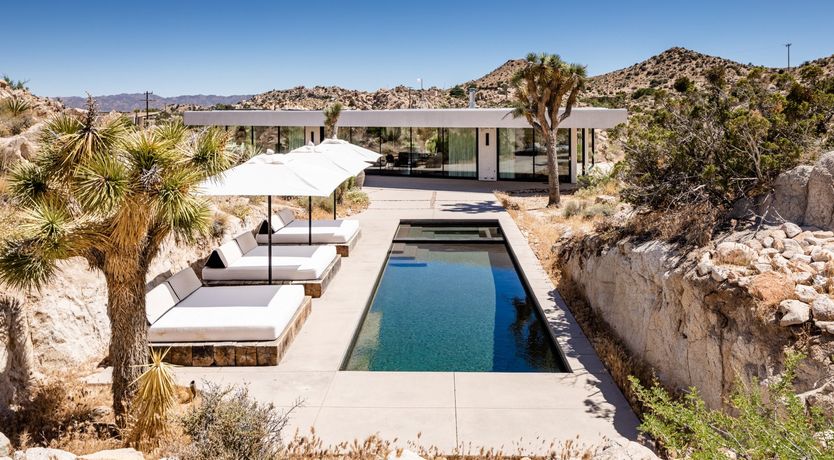Nestled among large boulders and desert sands, this home is a true Joshua Tree getaway with a private saltwater pool/spa and outdoor shower. With no neighbours around, it's an escape from civilisation that's at one with nature and design. The floor-to-ceiling moving glass walls blur the lines between the indoors/outdoors, allowing you to take advantage of the surroundings at all times. Inside, works by local artists and famous designers merge, while the kitchen sets the scene for great meals. We could go on and on about this home – but you should really check it out for yourself!