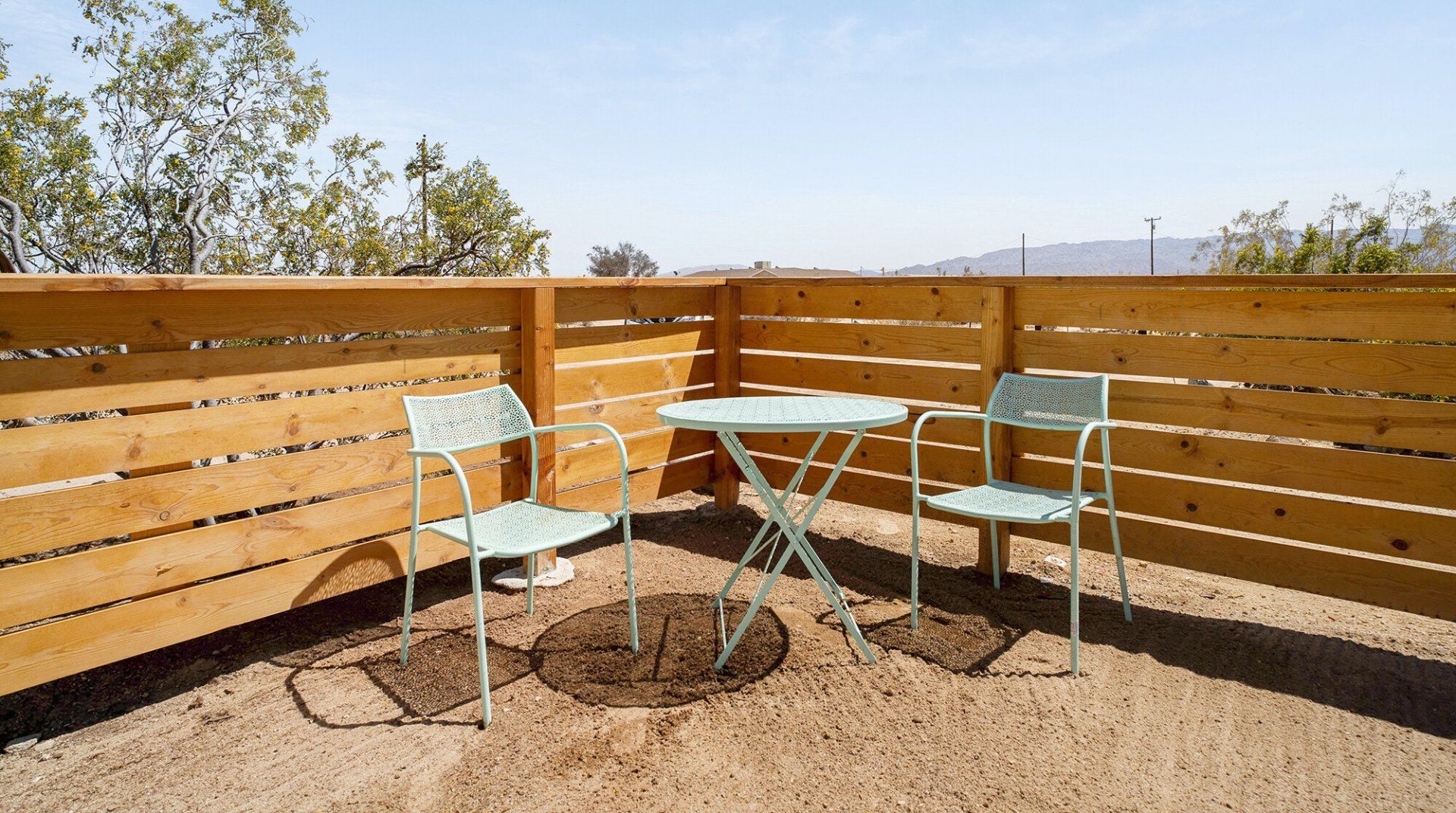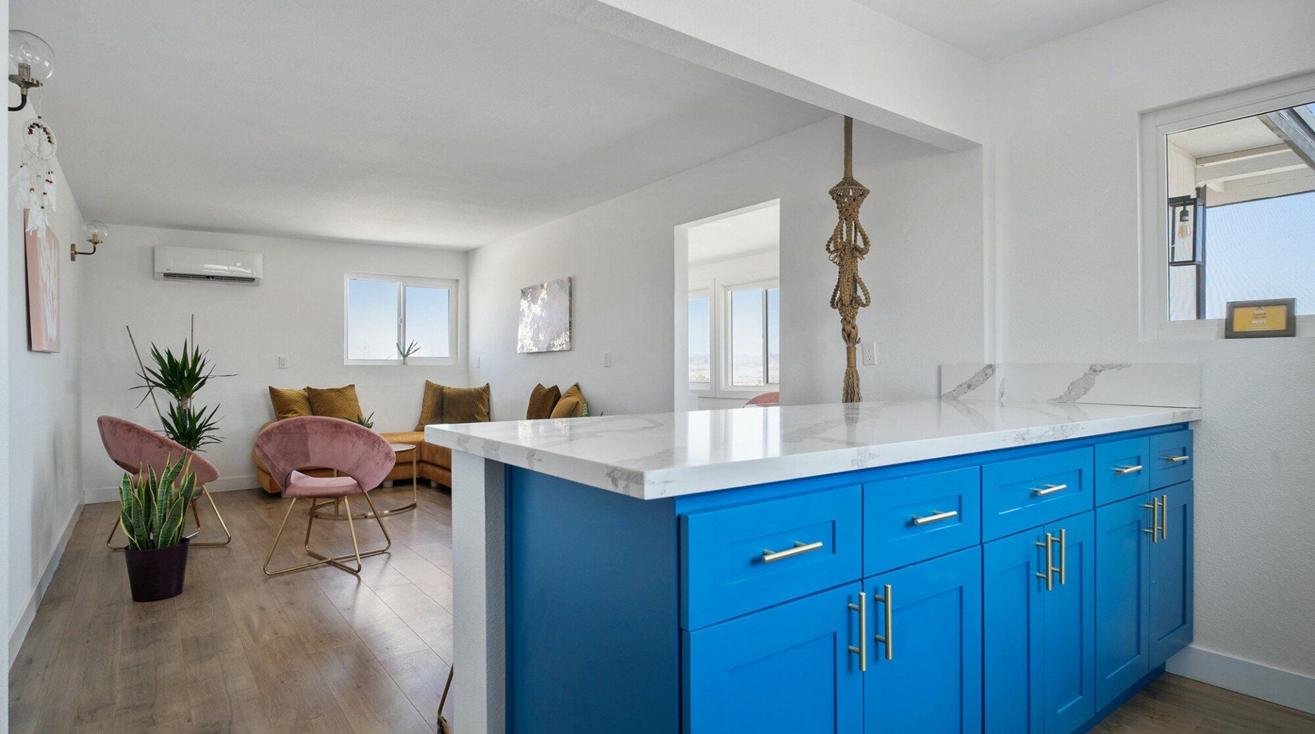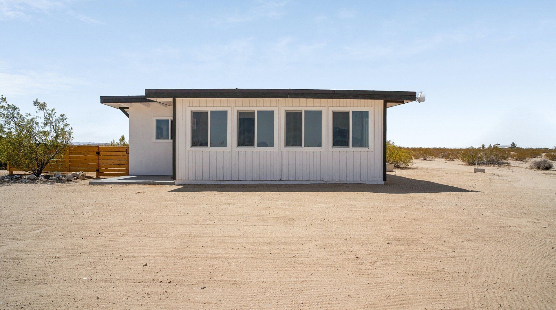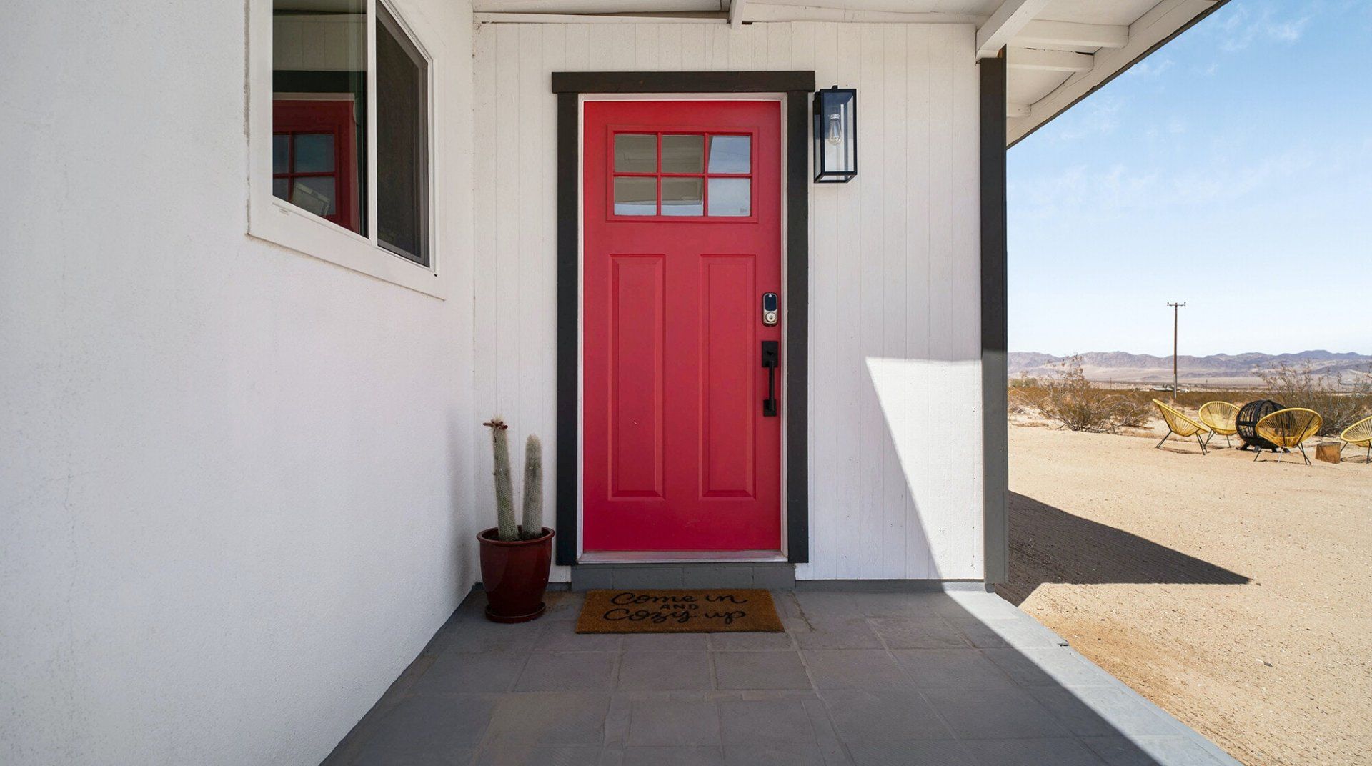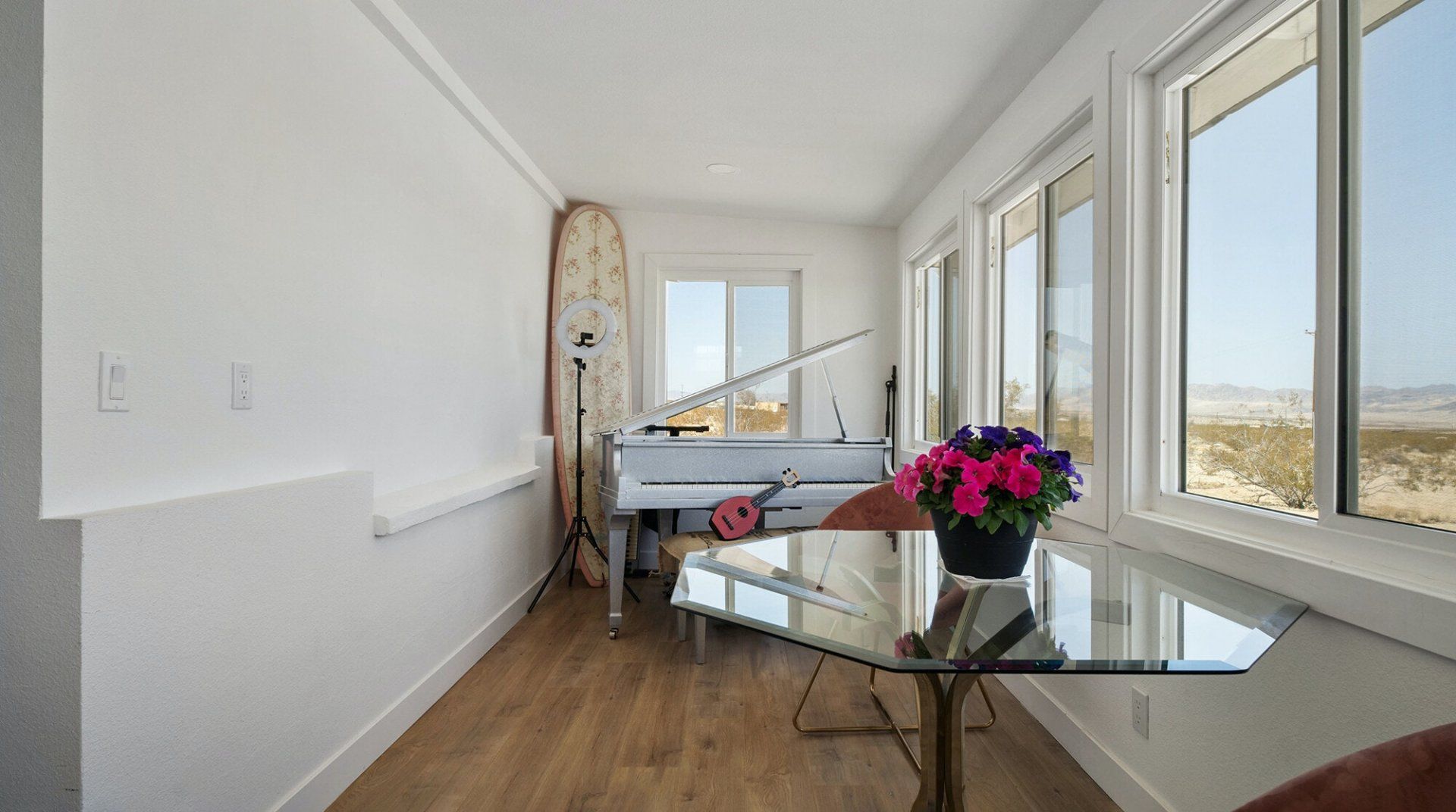 Turn down the dirt road to this dinky desert home and feel yourself unwind instantly. With rugged views in every direction, and arty touches like the mural by Pablo Damas and the custom glitter piano, it’s the kind of place where creative inspiration strikes. Maybe it’s the pastel sunrises, the painterly palette of the interior, or the huge blue skies. Either way, there's no better spot to take it all in. Spend your days exploring the unique landscapes of Joshua Park (twenty minutes’ drive), stargazing in the cowboy tub, or exploring your two acres of personal wilderness. As the sun sets, gather round the firepit with the ukulele and some marshmallows and watch the stars pop out one by one.