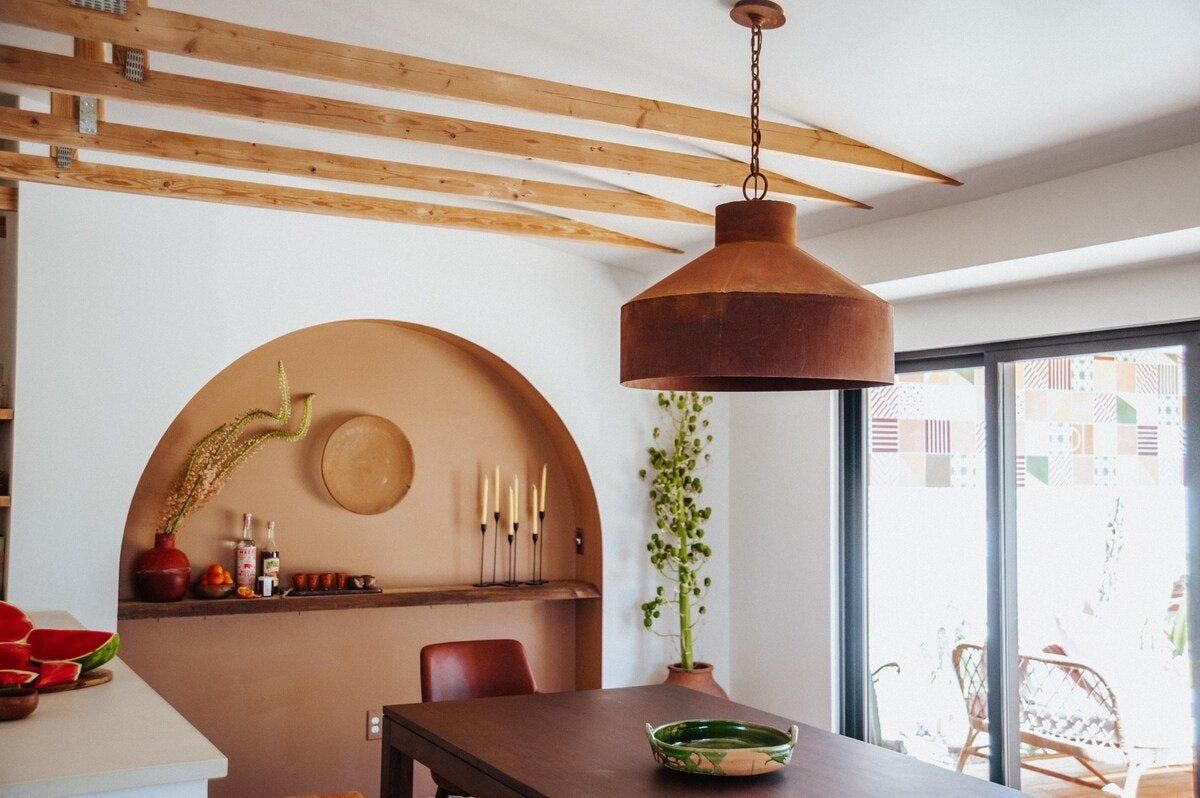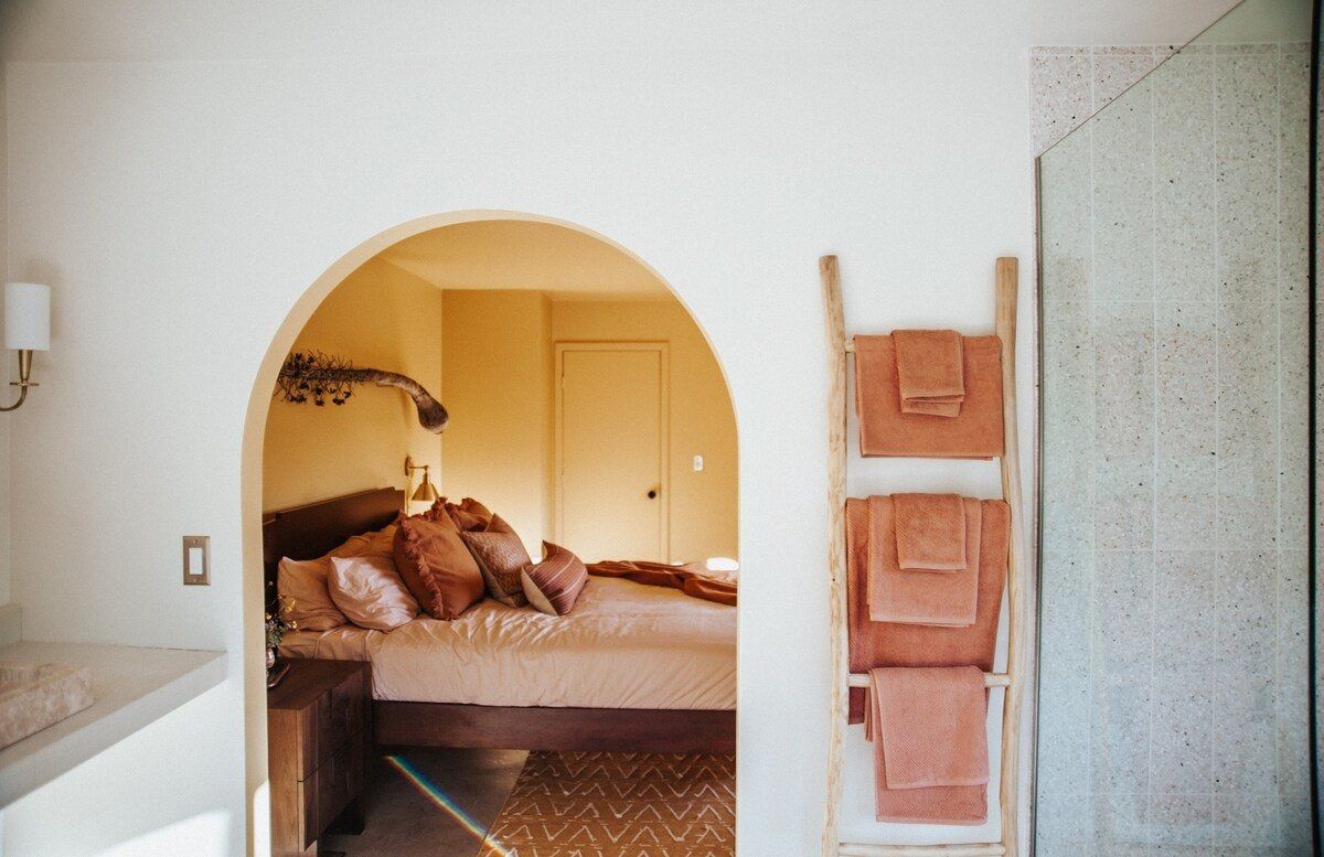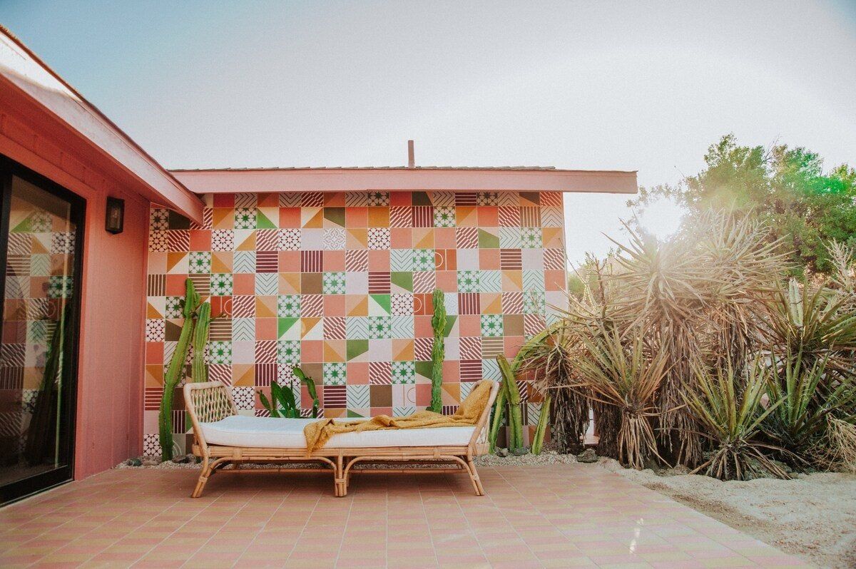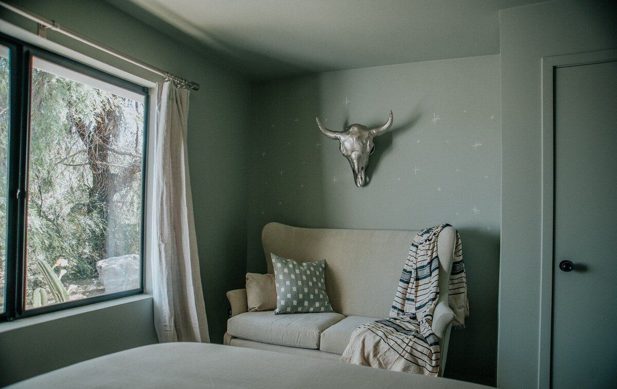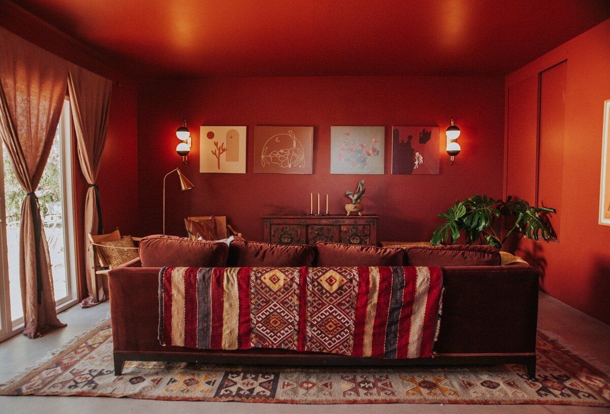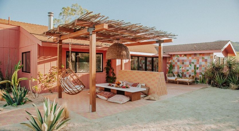 Arriving at this home will feel like you're walking into the pages of a glossy magazine. Utterly luxurious, effortlessly cool and Instagram-chic, this home is a sensory experience. First up, there are the joyful colours – every room makes its own mark, from the sumptuous red of the living room to the creamy vanilla, cool avocado green and tart raspberry pink of the bedrooms. The attention to detail is second-to-none, with carefully curated pieces such as a 1970s fireplace, a custom boulder coffee table and Guatemalan drapes creating a stylish yet serene atmosphere that's in harmony with the landscapes outside. The home sits on five acres of private land and is surrounded by dramatic mountains, vibrant wildflowers, dusty cactus and wildlife including coyotes, cottontail rabbits and lizards. Our hot tip? Take in all this natural wonder from the flower-filled stock tank swimming pool at sunset. And, with the gates of Joshua Tree National Park just a half-hour drive away, you can easily explore more of these stunning, almost lunar landscapes.