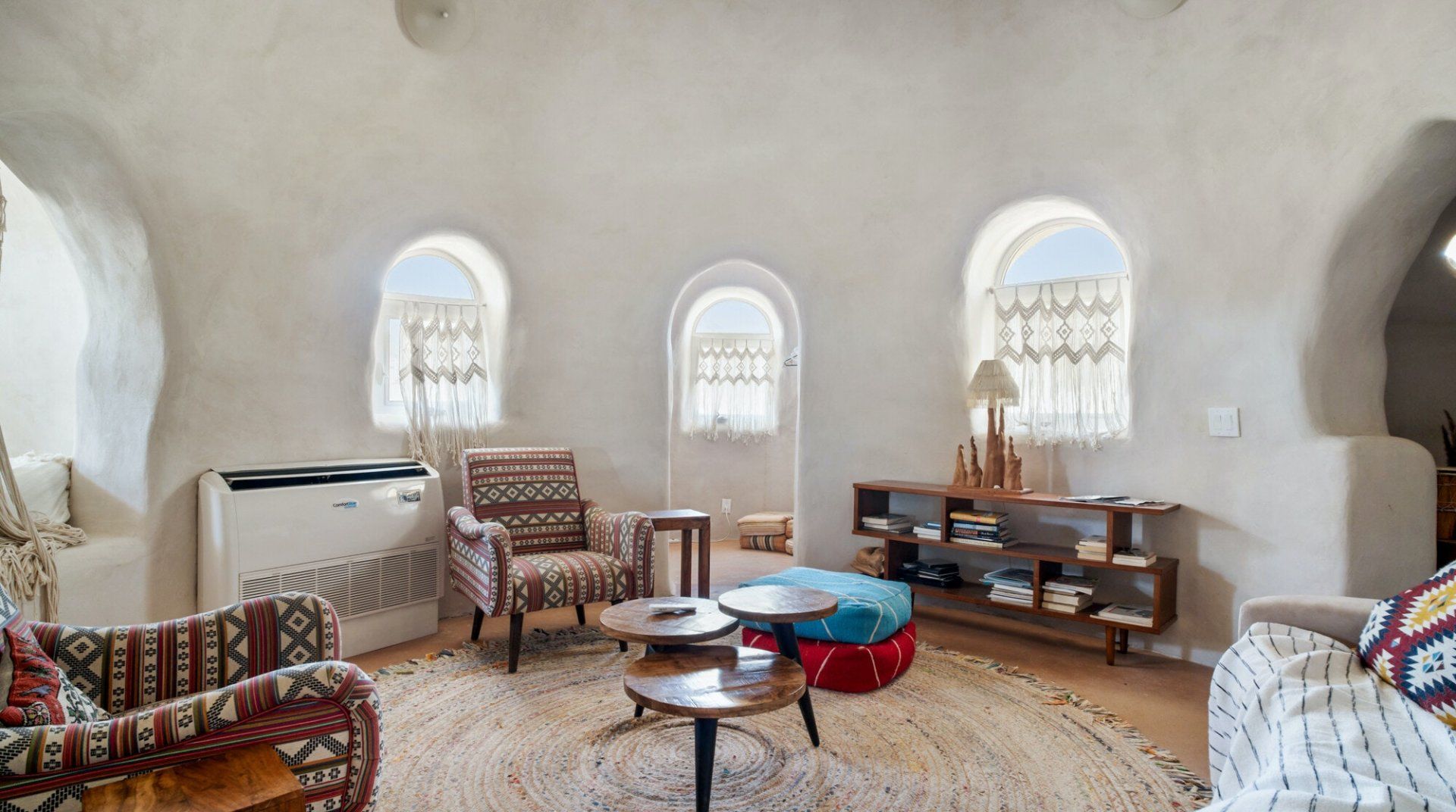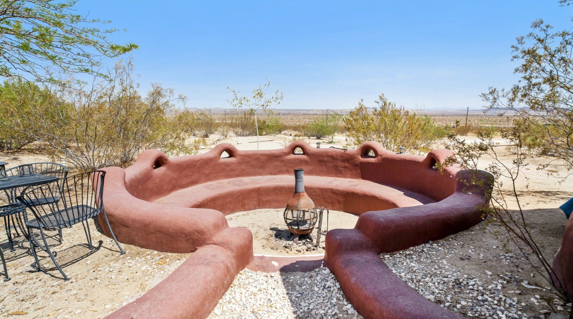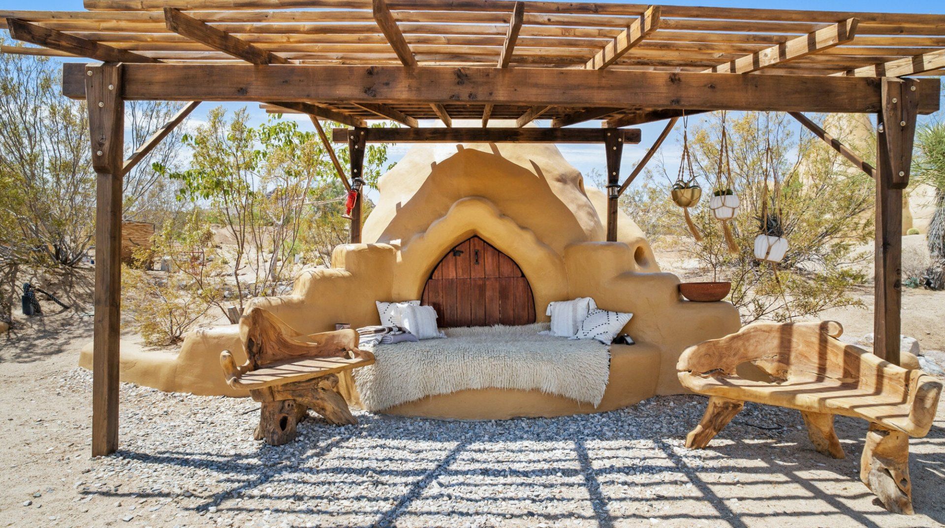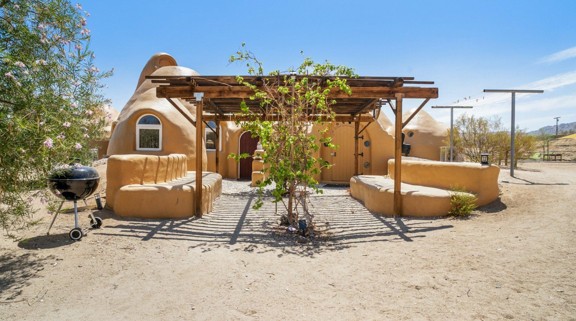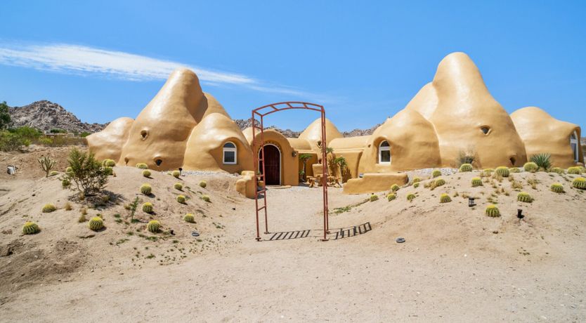 In the vast landscape of Joshua Tree, this incredibly unique home rises from the dust like a mirage before your very eyes. These sand-coloured domes are not dunes, but the roof of your house. This turquoise water is not an oasis, but your private pool. Under the blistering sun, find serenity and wonder in this architectural marvel. Before you even go inside, explore the glorious grounds. Among exotic desert foliage, there's a swimming pool with an integrated Jacuzzi, handcrafted swinging chair, a huge terracotta-coloured fire pit, and a cosy snug under a pagoda-like trellis. Where will you choose to sip tequila with your friends at sunset, or stargaze at midnight while meteors pass overhead?