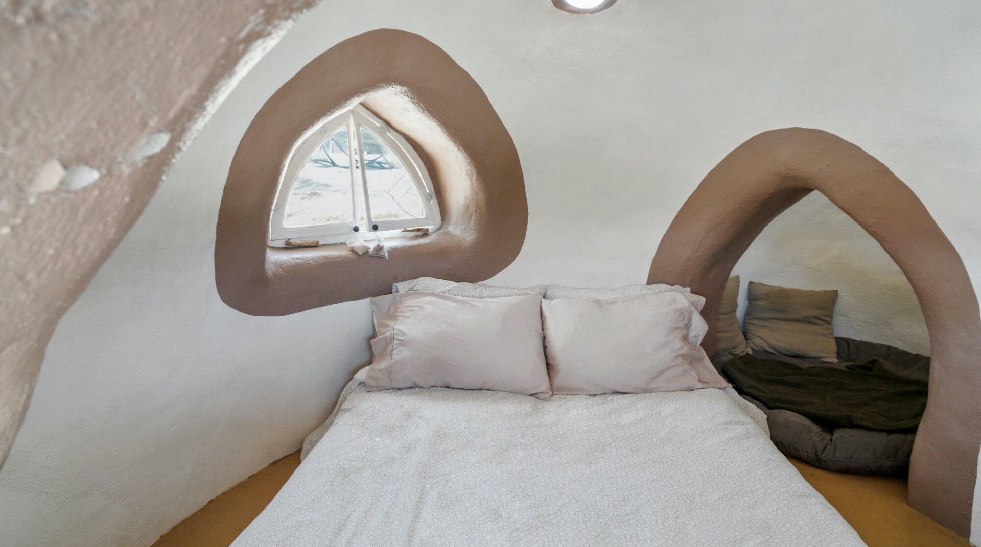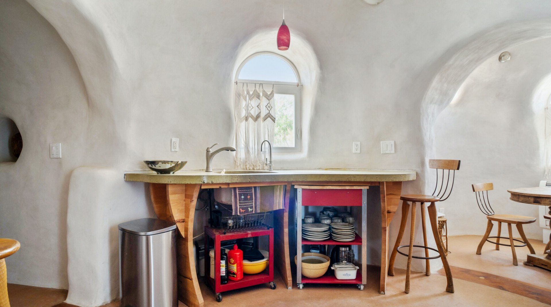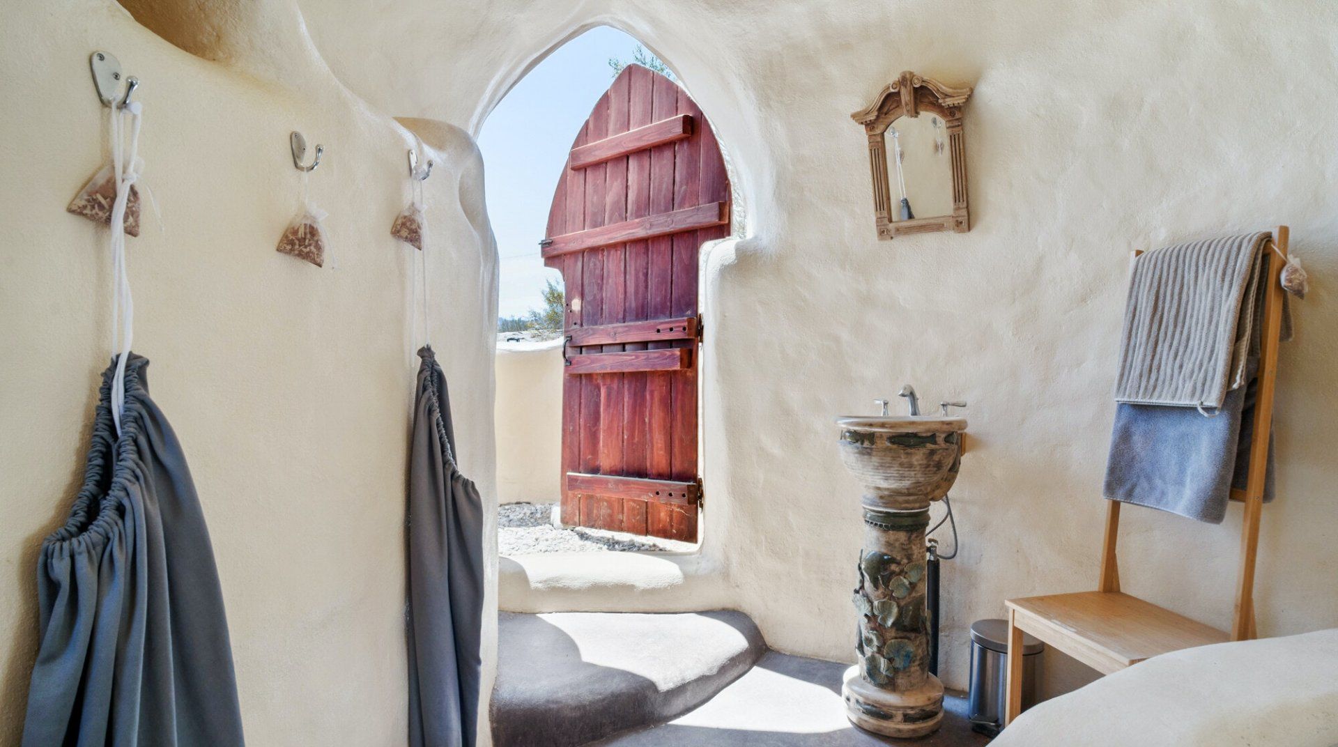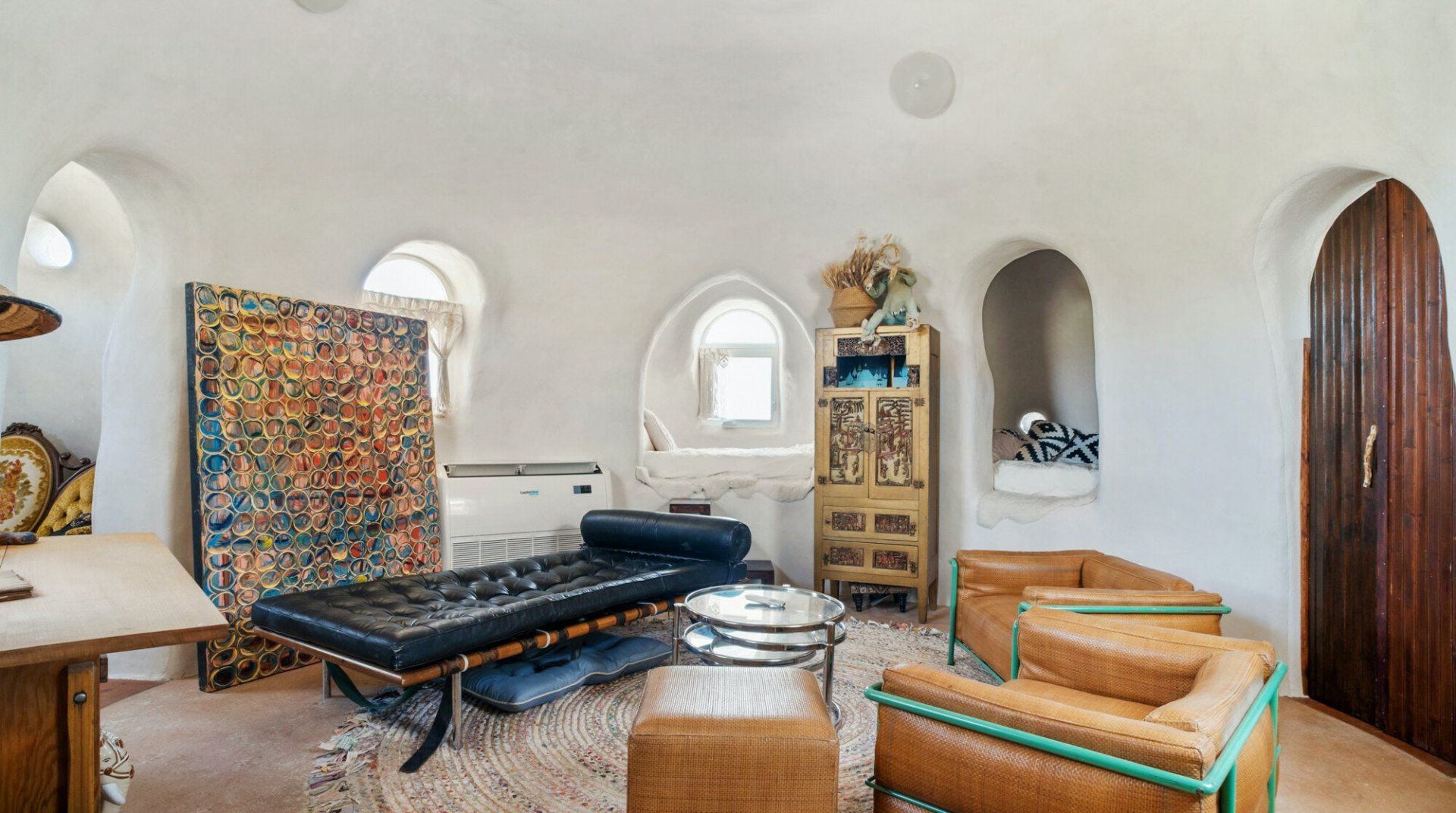 In the vast landscape of Joshua Tree, this incredibly unique home rises from the dust like a mirage before your very eyes. These sand-coloured domes are not dunes, but the roof of your house. This turquoise water is not an oasis, but your private pool. Under the blistering sun, find serenity and wonder in this architectural marvel. Before you even go inside, explore the glorious grounds. Among exotic desert foliage, there's a swimming pool with an integrated Jacuzzi, handcrafted swinging chair, a huge terracotta-coloured fire pit, and a cosy snug under a pagoda-like trellis. Where will you choose to sip tequila with your friends at sunset, or stargaze at midnight while meteors pass overhead?
