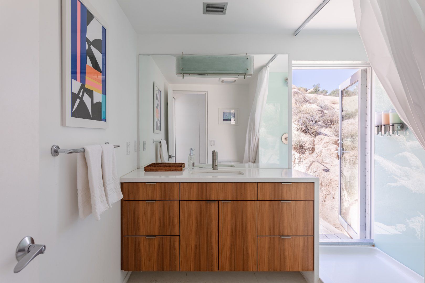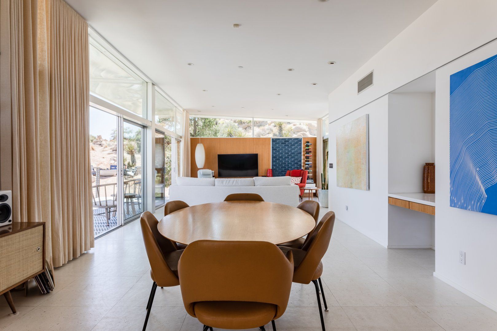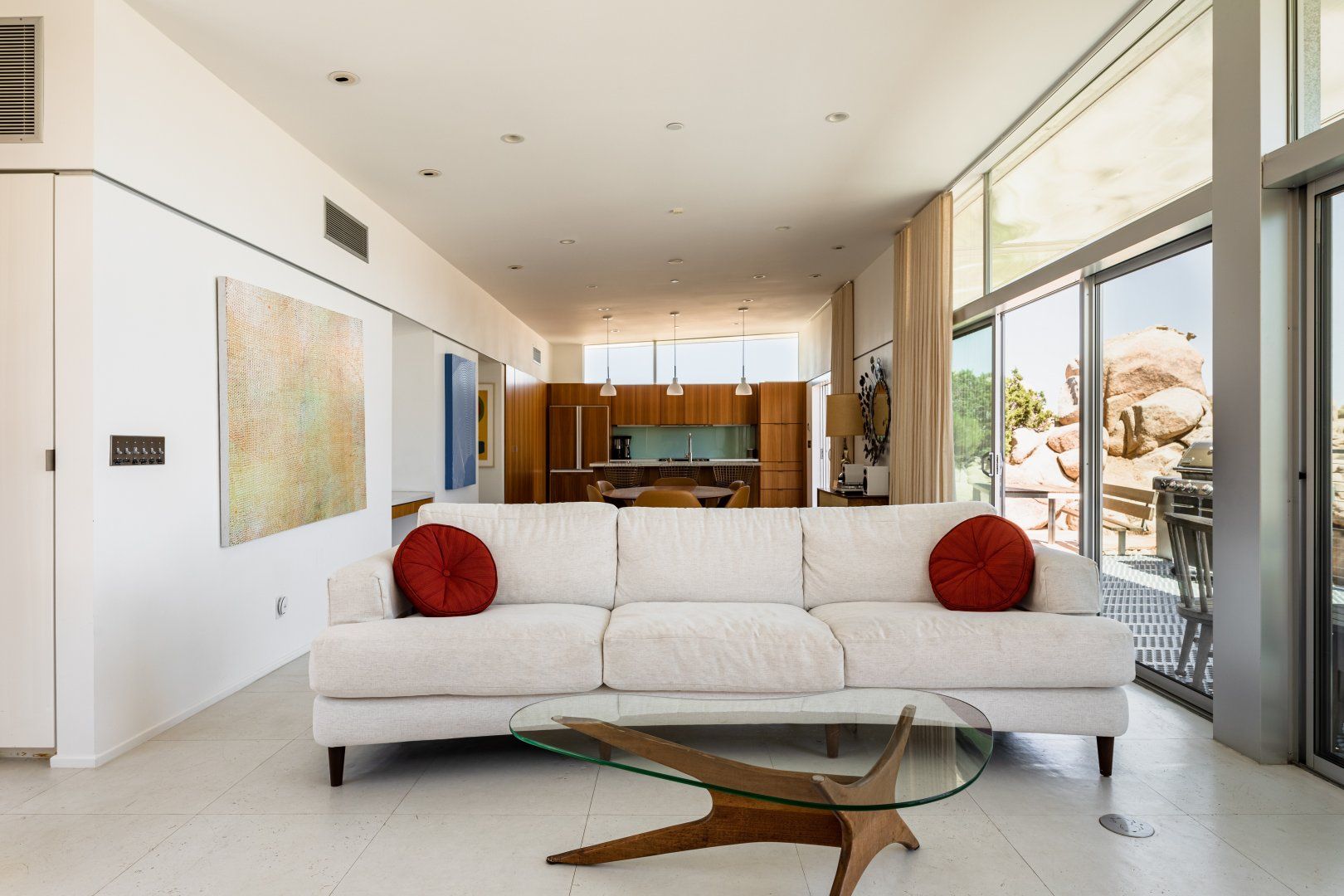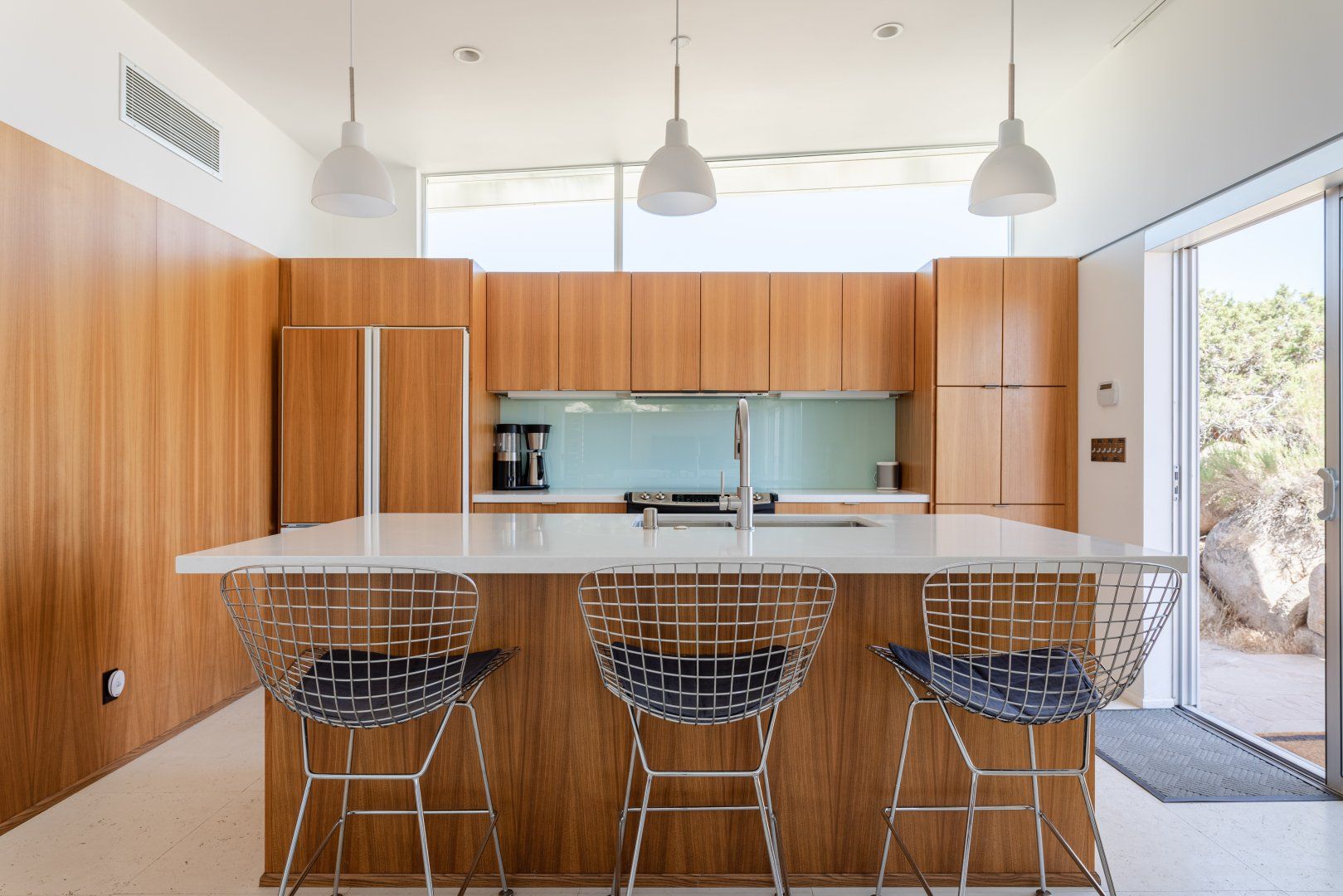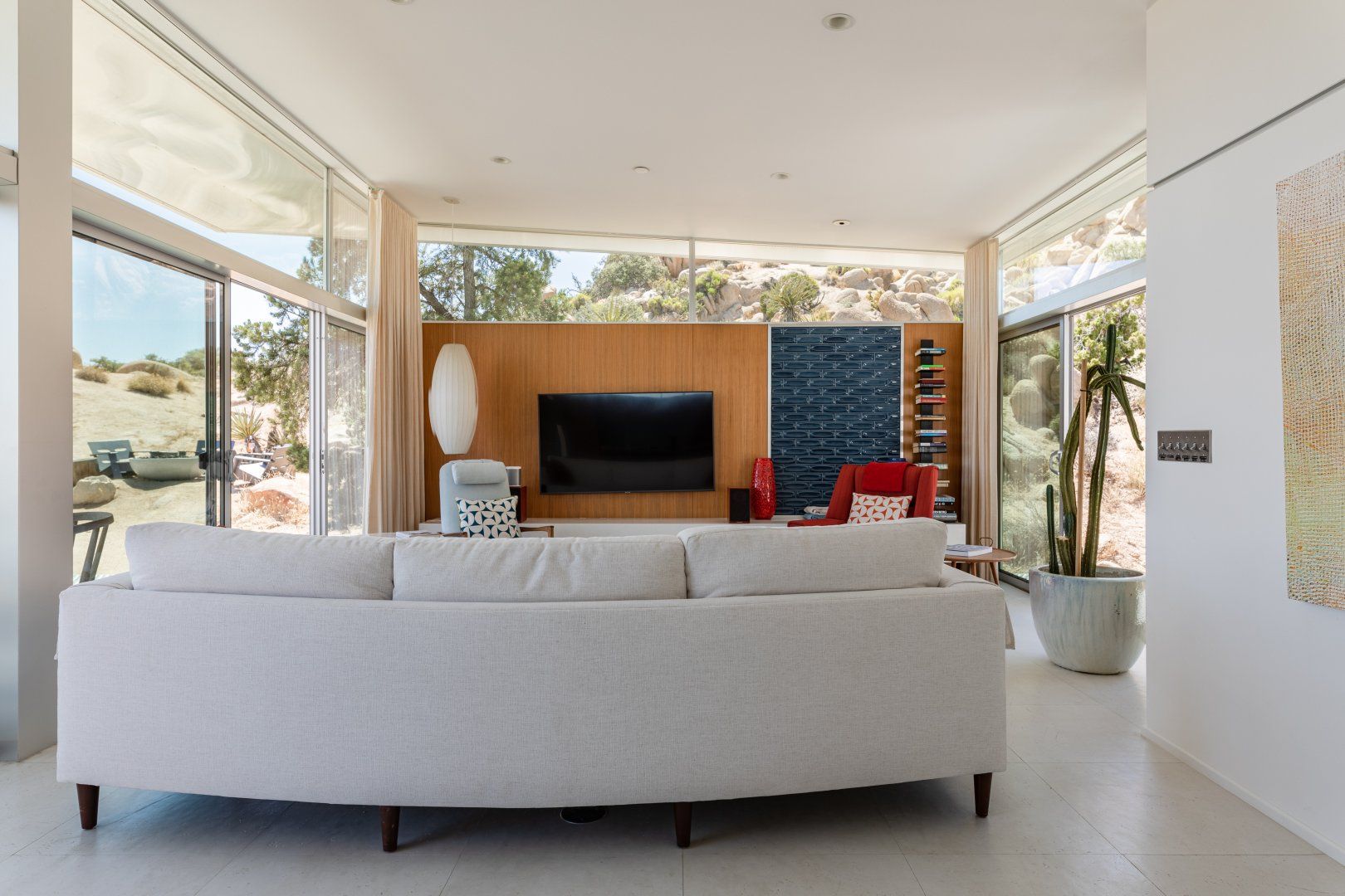 Surrounded by ten acres of stunning desert landscape in the Yucca Valley, this remarkable net-zero energy home really is the epitome of a secluded getaway. It’s been profiled in Dwell Magazine as well as on countless high-end websites, and you can immediately see why. With glass sliding doors in each room inviting you to step out into the wild beauty outside, there’s a seamless flow between indoors and outdoors making this home feel completely at one with the Mojave Desert. We love the balcony equipped with a sun chair – accessed via the master bedroom and living room – and the outdoor shower that will get any morning off to a refreshing start. Spend the day hiking around your sun-drenched house, taking in the majesty of the ancient junipers, weathered boulders, desert oaks and piñon pines, or hop in your car to visit Joshua Tree National Park, just a twenty-minute drive away. After a day of adventuring, come back home for drinks around the fire pit before firing up the barbecue for an alfresco feast. Then end the night with a soak in the hot tub while you watch the night sky turn into a blanket of shimmering stars.