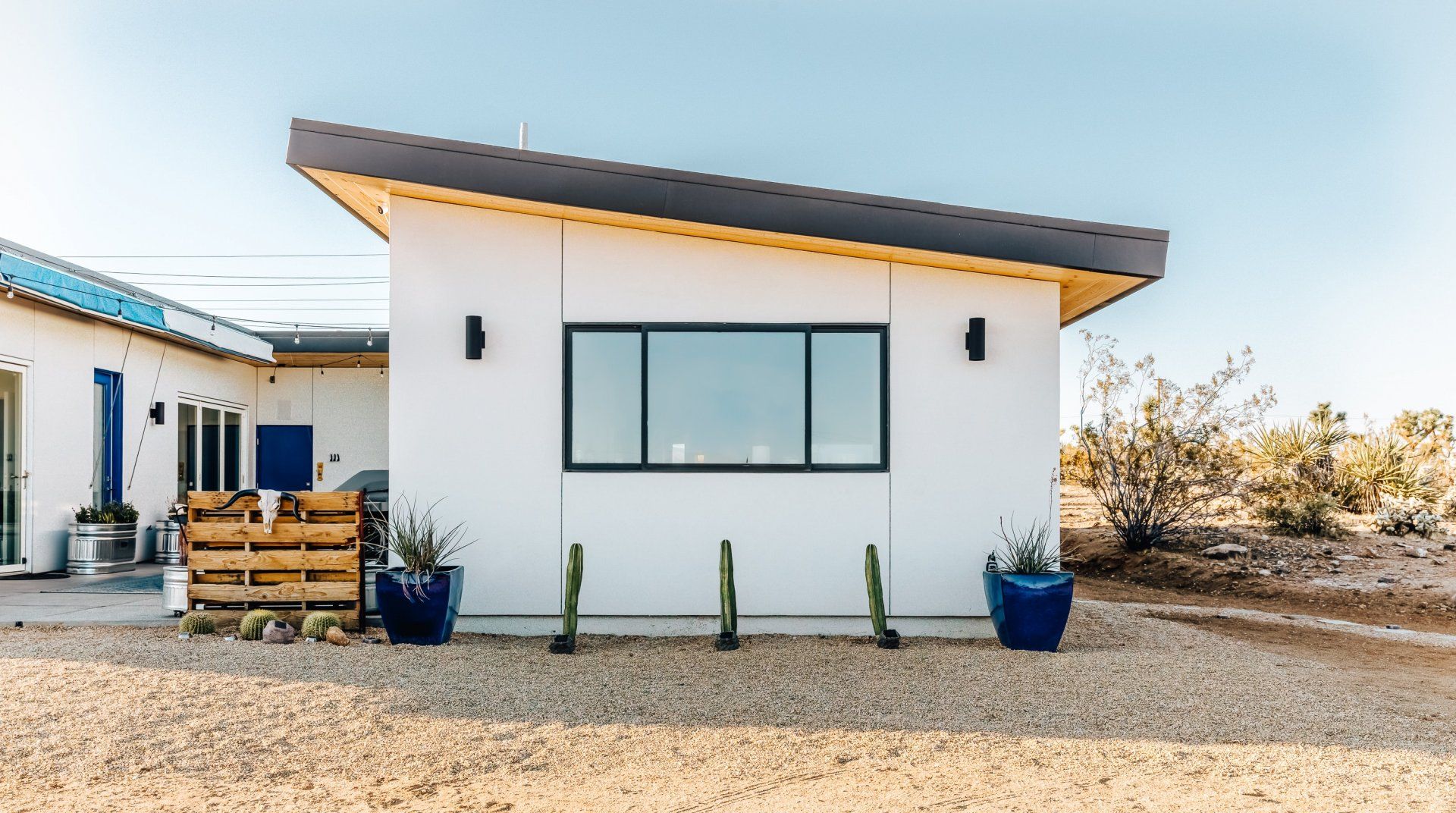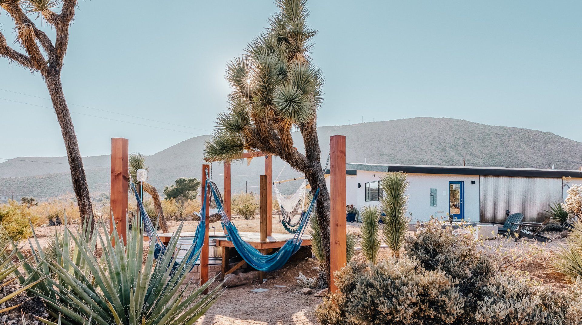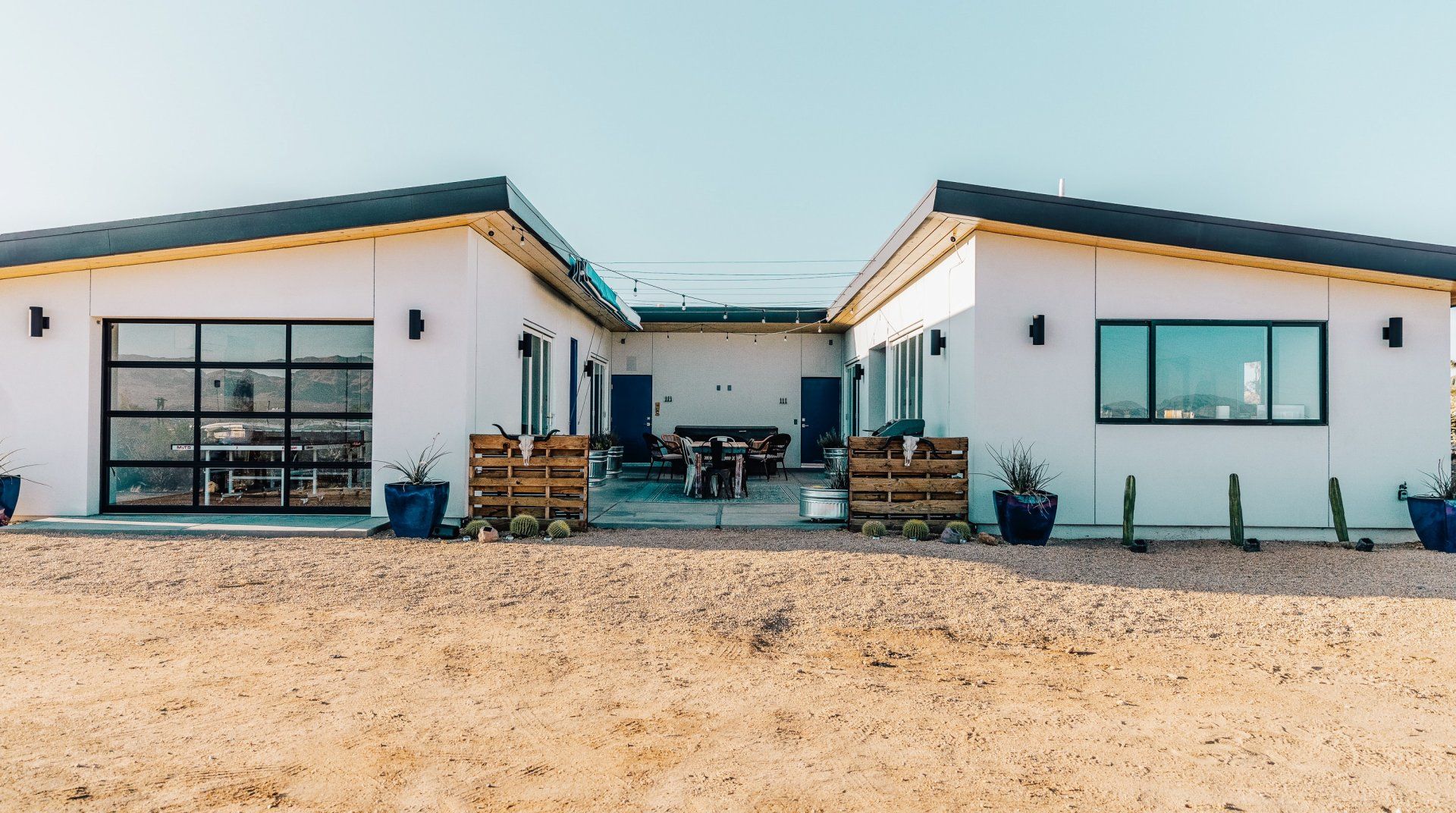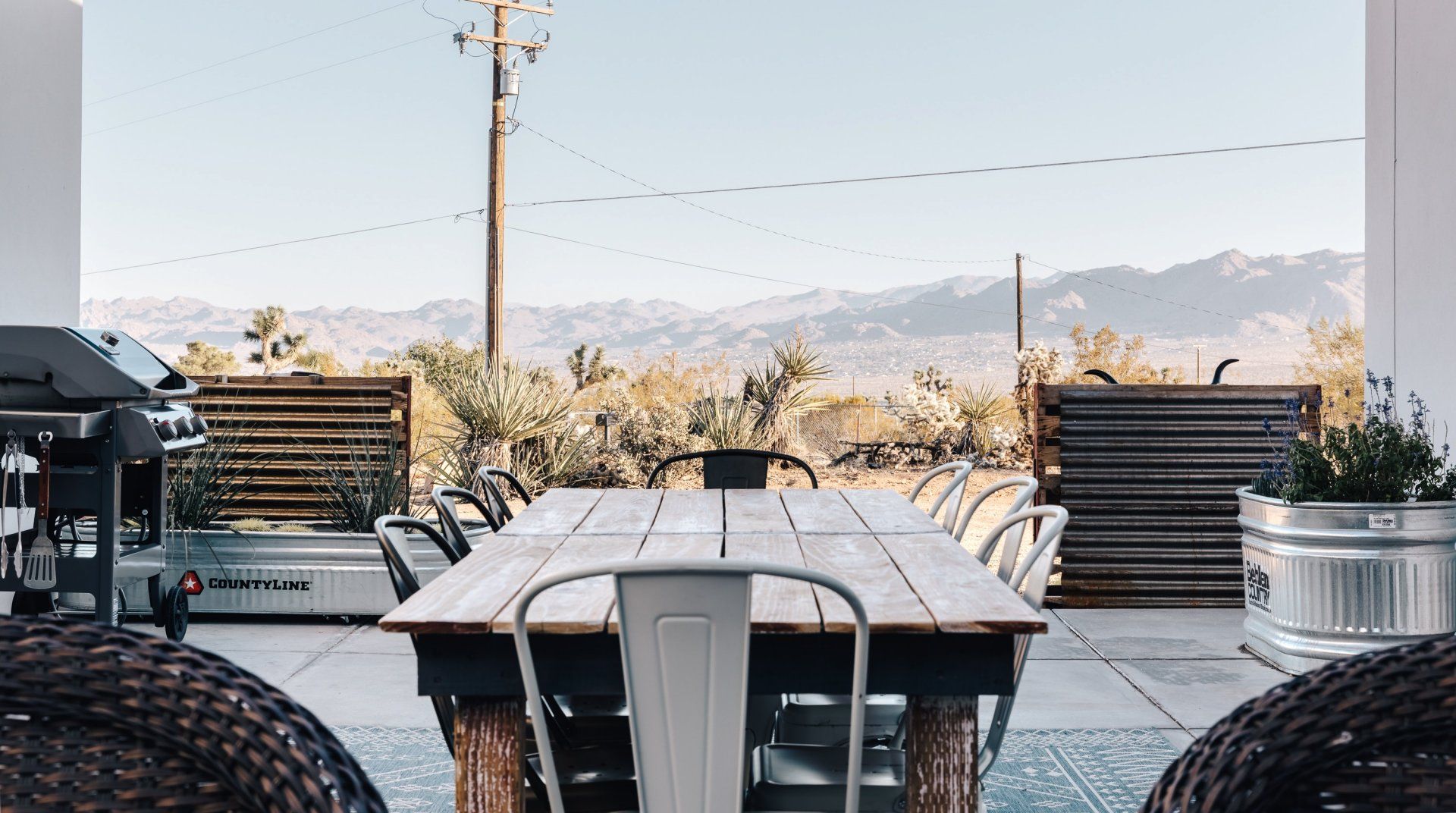 Resting on two acres of land with impressive views of the Joshua Tree Park mountains, this unique C-shaped home invites you to enjoy a relaxing break with luxurious amenities. Designed to combine indoor and outdoor living, you'll find "La Cantina" door walls in every room – so you can create the coolest indoor/outdoor bar in the desert. In the centre, you'll find a wind-buffered patio with a rustic dining table and retractable canopy, so you can seek shade from the sun by day and reveal the spectacular starry skies by night. Soak in the hot tub or cowboy bath, gather around the fire pit to share stories, or doze off in the hammock. Inside, the home is equally impressive, with a desert chic vibe and plenty of room to dance and socialise while enjoying this joyful space.
