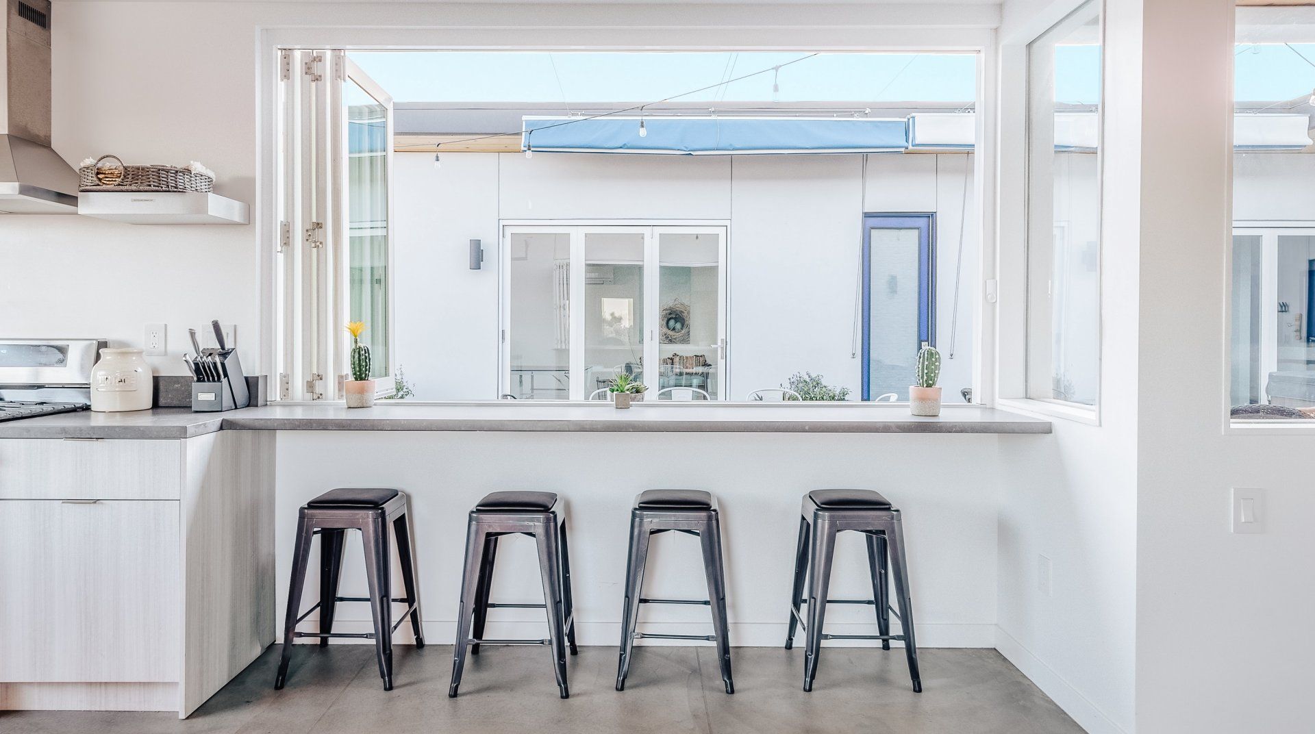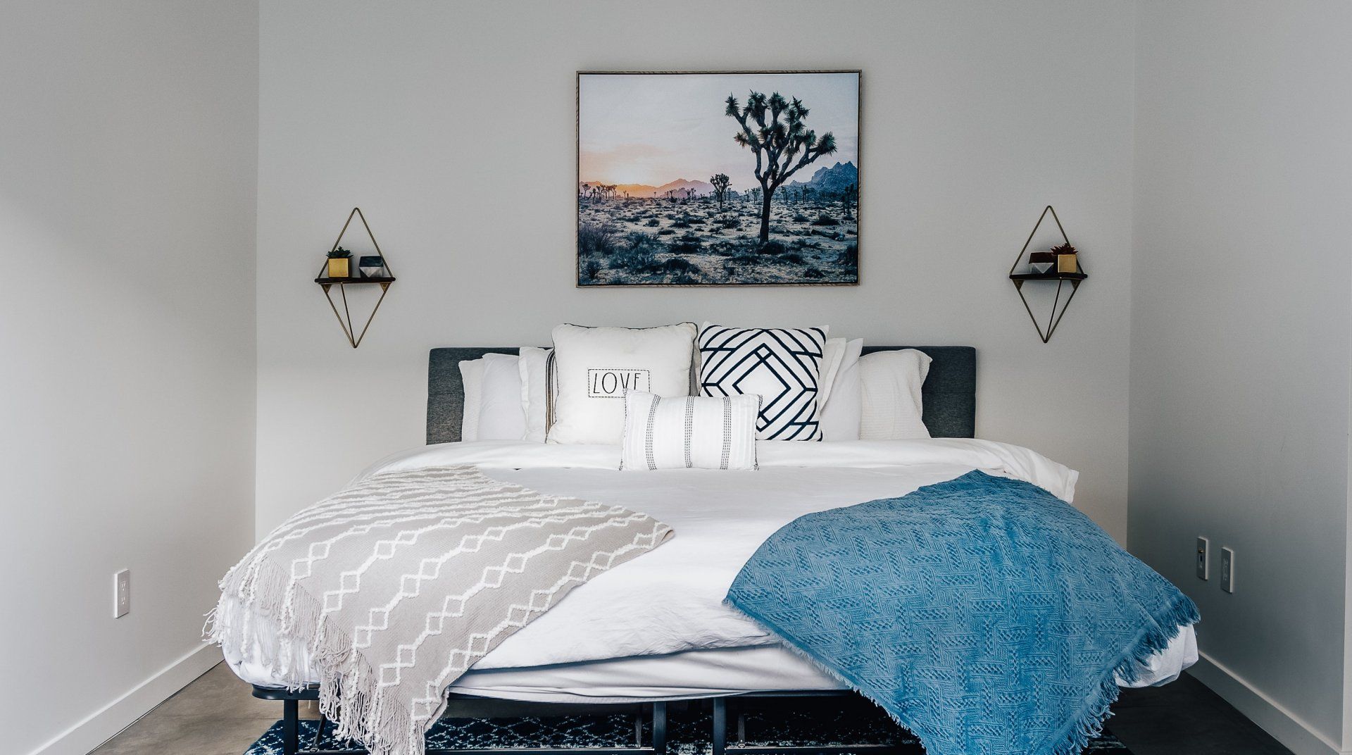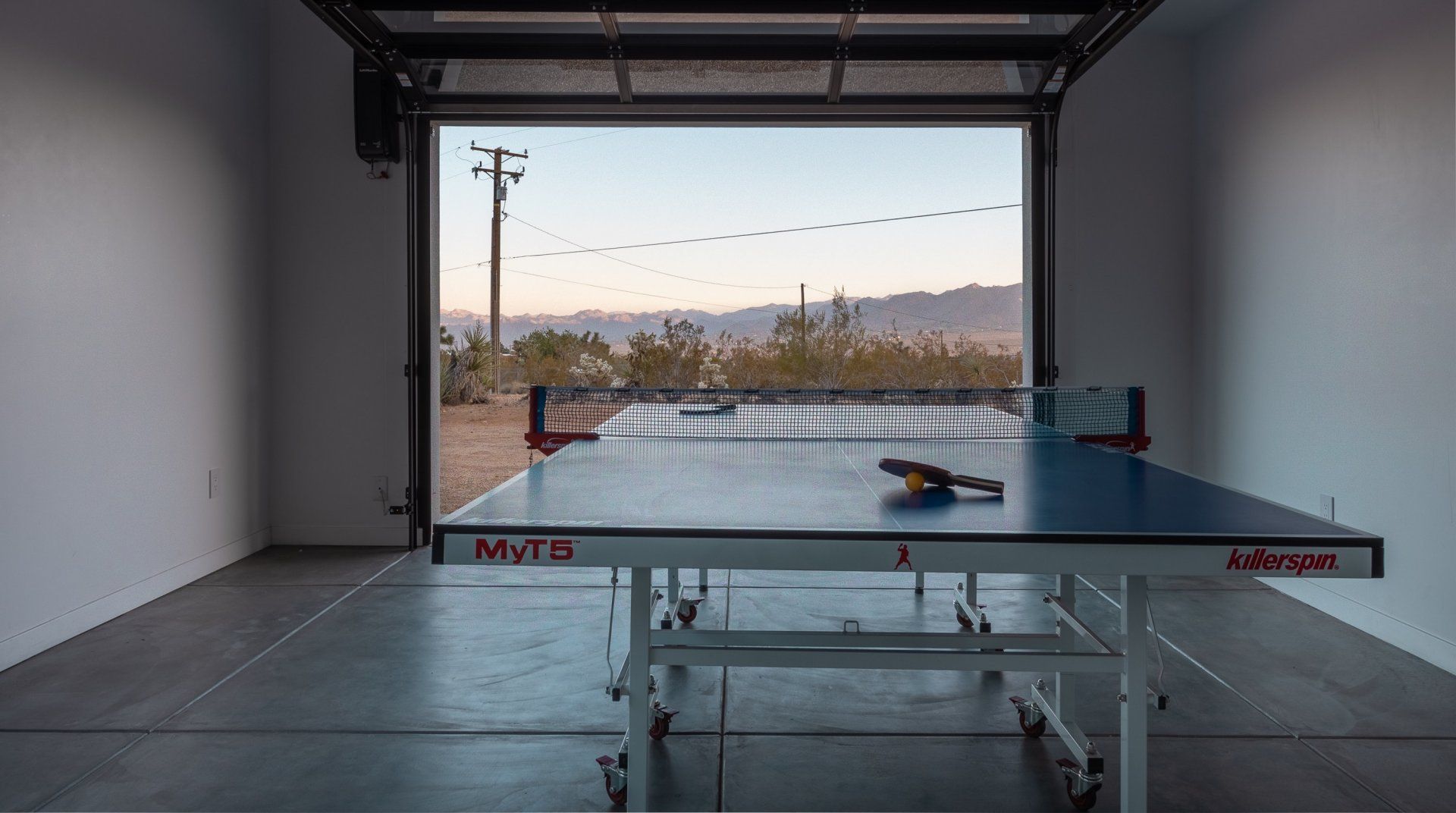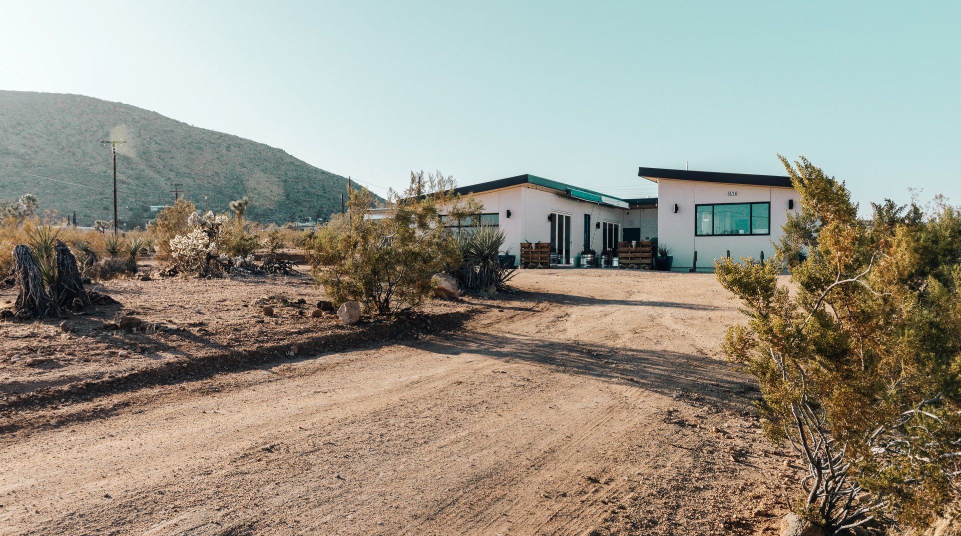 Resting on two acres of land with impressive views of the Joshua Tree Park mountains, this unique C-shaped home invites you to enjoy a relaxing break with luxurious amenities. Designed to combine indoor and outdoor living, you'll find "La Cantina" door walls in every room – so you can create the coolest indoor/outdoor bar in the desert. In the centre, you'll find a wind-buffered patio with a rustic dining table and retractable canopy, so you can seek shade from the sun by day and reveal the spectacular starry skies by night. Soak in the hot tub or cowboy bath, gather around the fire pit to share stories, or doze off in the hammock. Inside, the home is equally impressive, with a desert chic vibe and plenty of room to dance and socialise while enjoying this joyful space.