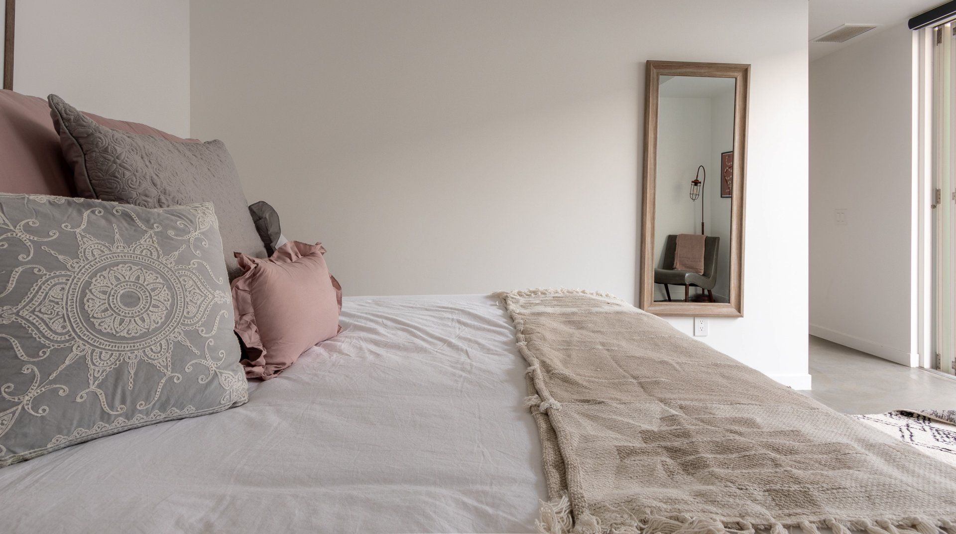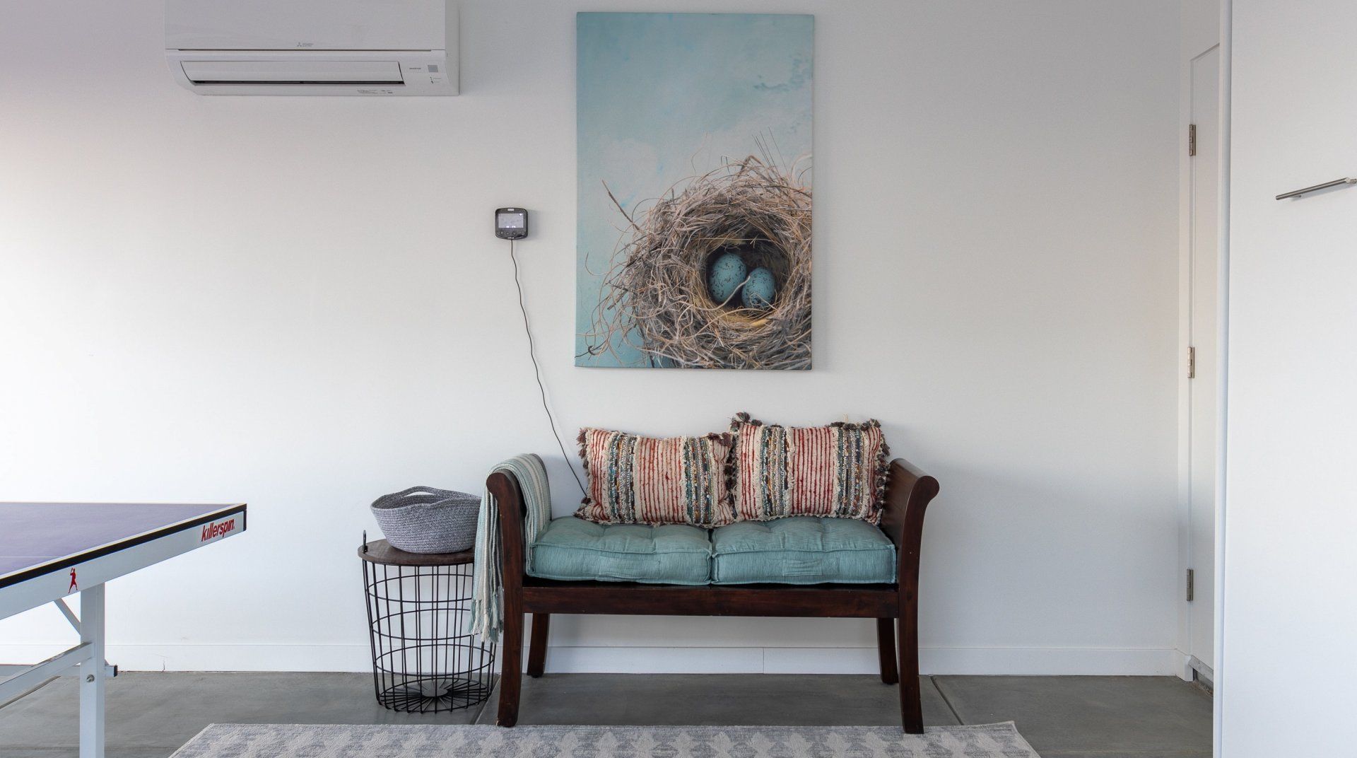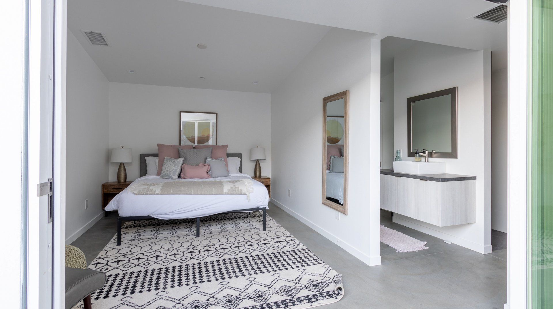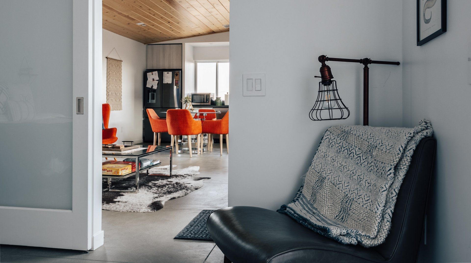 Resting on two acres of land with impressive views of the Joshua Tree Park mountains, this unique C-shaped home invites you to enjoy a relaxing break with luxurious amenities. Designed to combine indoor and outdoor living, you'll find "La Cantina" door walls in every room – so you can create the coolest indoor/outdoor bar in the desert. In the centre, you'll find a wind-buffered patio with a rustic dining table and retractable canopy, so you can seek shade from the sun by day and reveal the spectacular starry skies by night. Soak in the hot tub or cowboy bath, gather around the fire pit to share stories, or doze off in the hammock. Inside, the home is equally impressive, with a desert chic vibe and plenty of room to dance and socialise while enjoying this joyful space.
